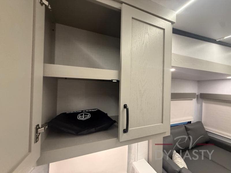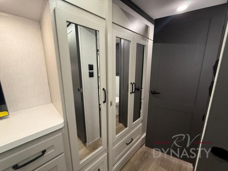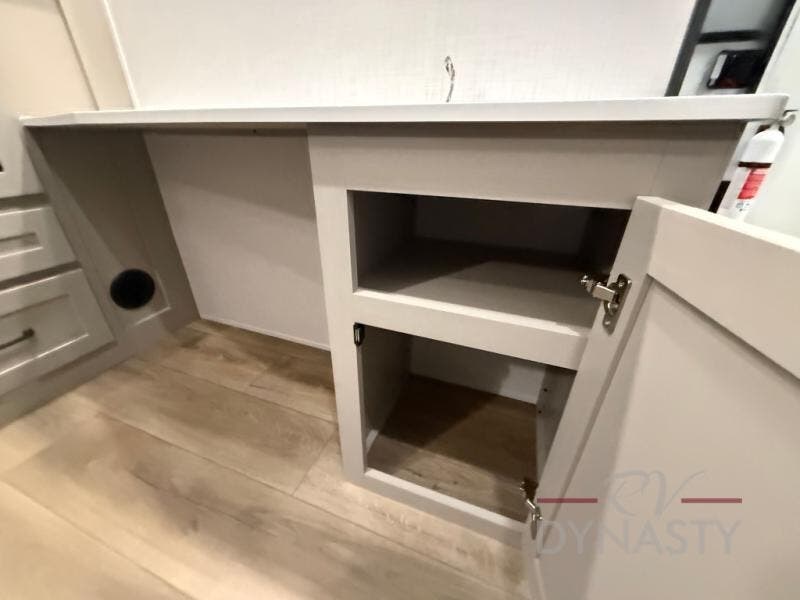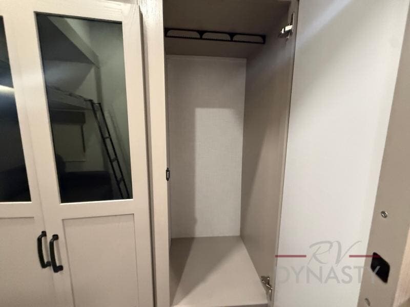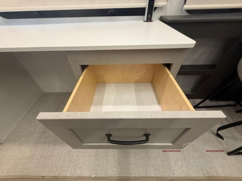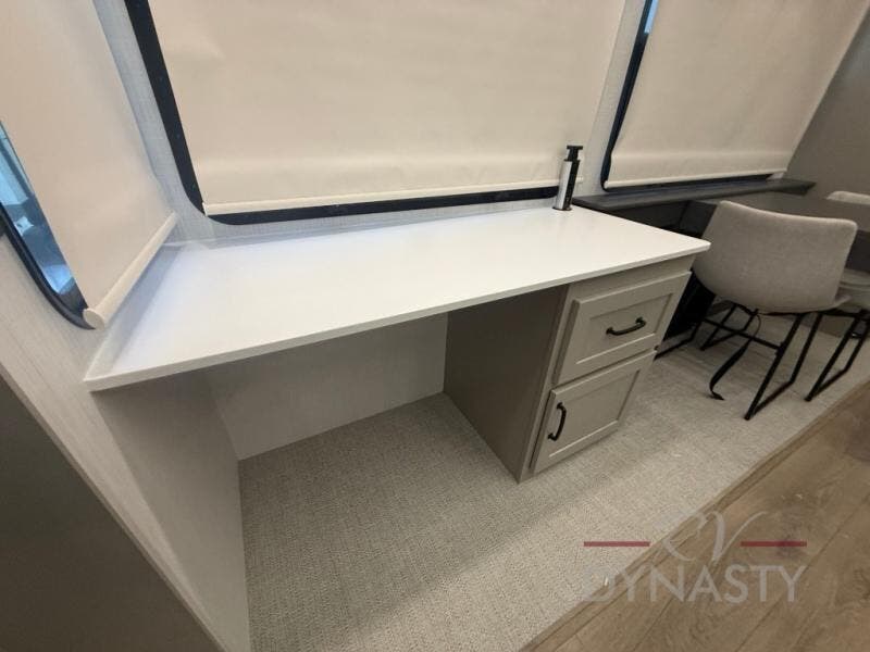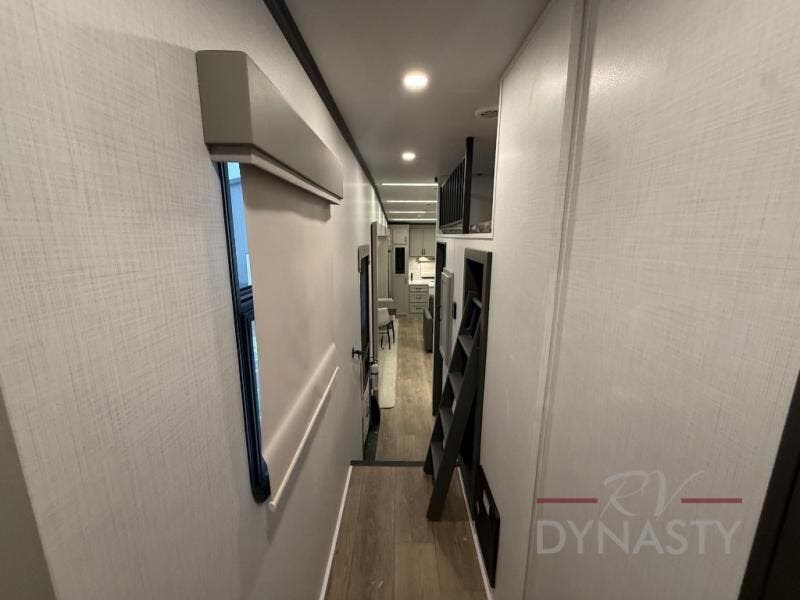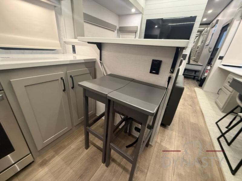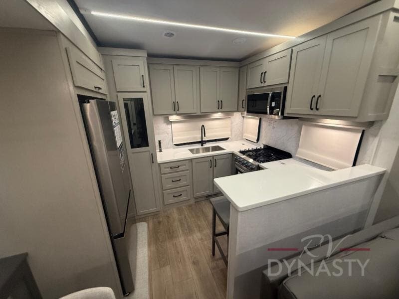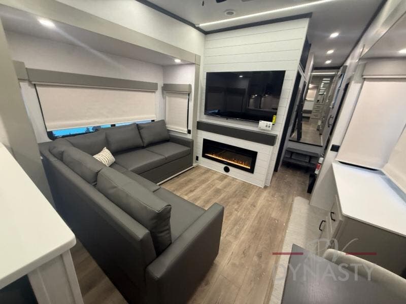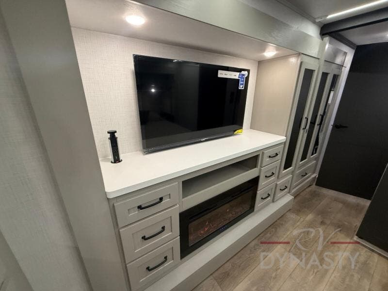 If you enjoy camping with a large group of family or friends, this fifth wheel will be perfect for you! There are five slides, giving your crew plenty of space to relax, plus there is a mid-bunk room with a tri-fold sofa, a 30" x 68" bunk, and a desk. And above this room is a 30" x 68" loft for even more sleeping or storage space. You can claim the front private bedroom all to yourselves which includes a king bed, front bench with dual wardrobes, plus a bedroom fireplace and Smart TV. Everyone can enjoy visiting together in the middle living room on the L-lounge by the entertainment center with a second fireplace. There is a table and chairs for dining space, plus a desk with a chair if you need to get some work done. And don't overlook the rear kitchen with a large refrigerator and pantry, all the appliances to make meals, plus ample counter space, including a bar top that overlooks the main living area!