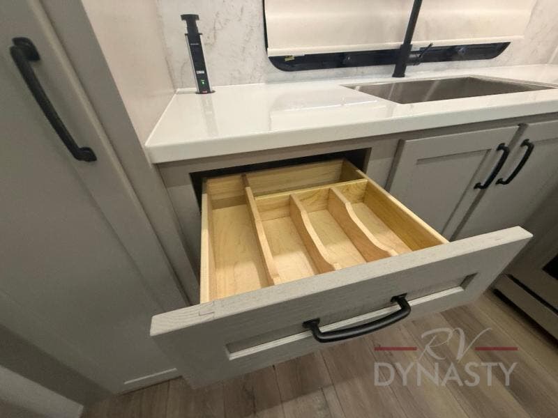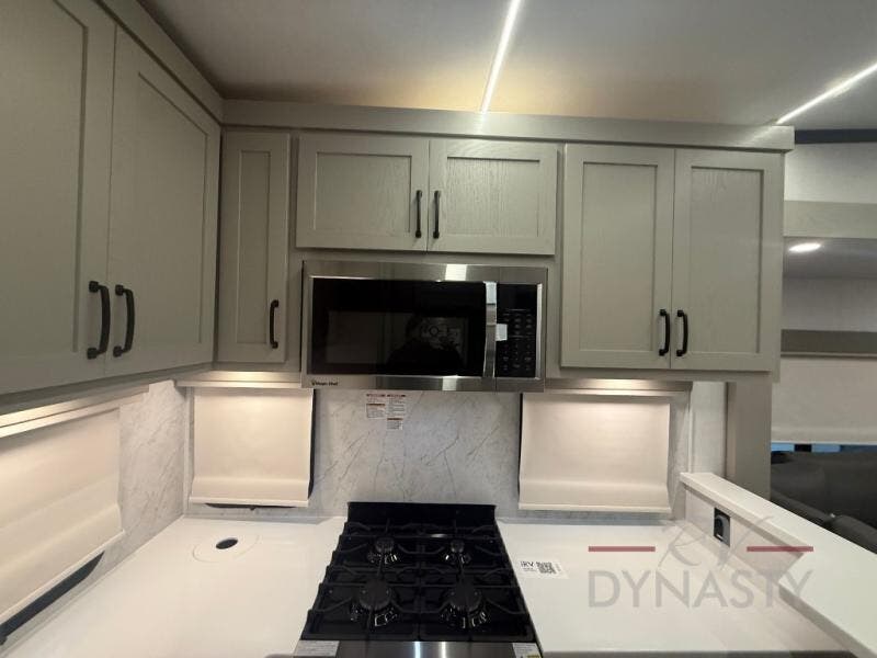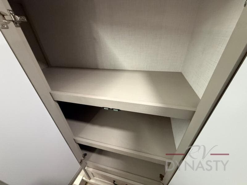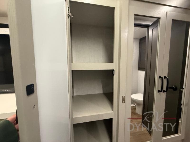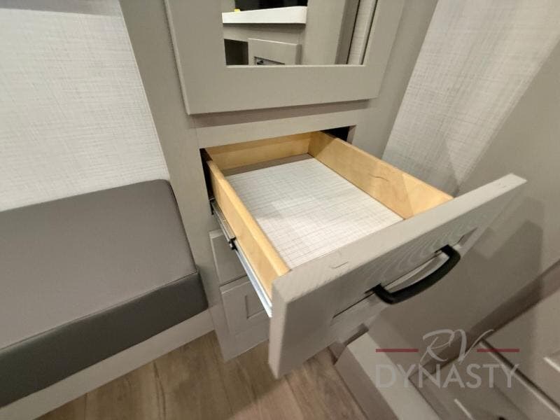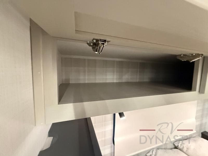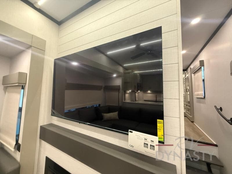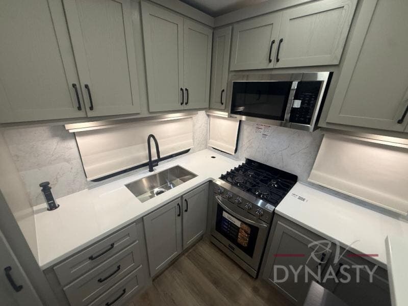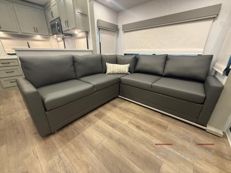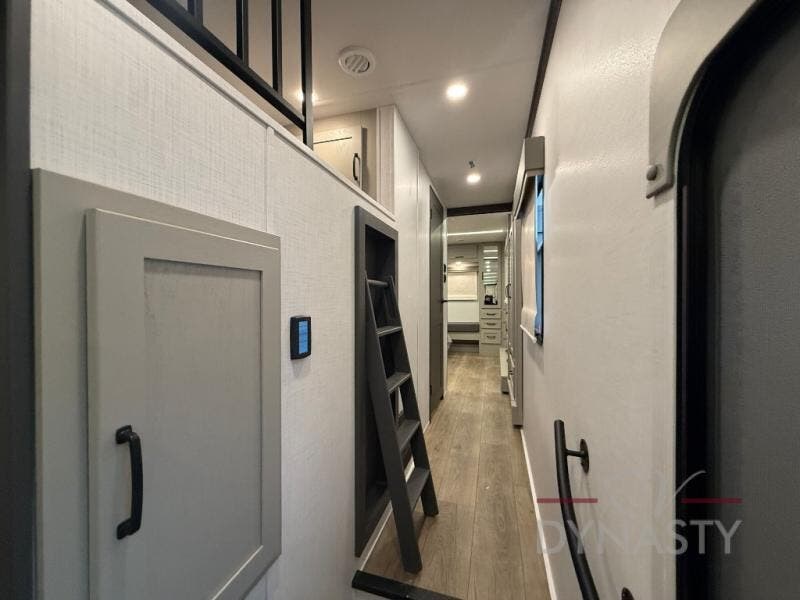 If you enjoy camping with a large group of family or friends, this fifth wheel will be perfect for you! There are five slides, giving your crew plenty of space to relax, plus there is a mid-bunk room with a tri-fold sofa, a 30" x 68" bunk, and a desk. And above this room is a 30" x 68" loft for even more sleeping or storage space. You can claim the front private bedroom all to yourselves which includes a king bed, front bench with dual wardrobes, plus a bedroom fireplace and Smart TV. Everyone can enjoy visiting together in the middle living room on the L-lounge by the entertainment center with a second fireplace. There is a table and chairs for dining space, plus a desk with a chair if you need to get some work done. And don't overlook the rear kitchen with a large refrigerator and pantry, all the appliances to make meals, plus ample counter space, including a bar top that overlooks the main living area!