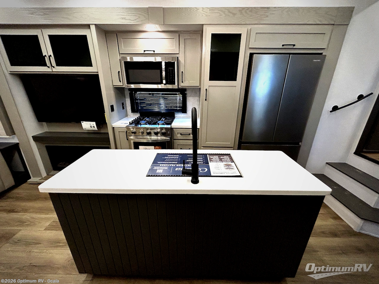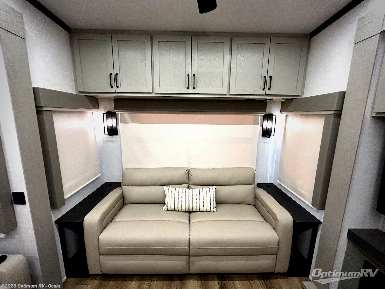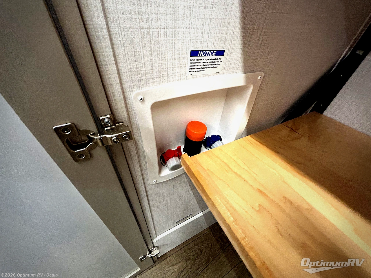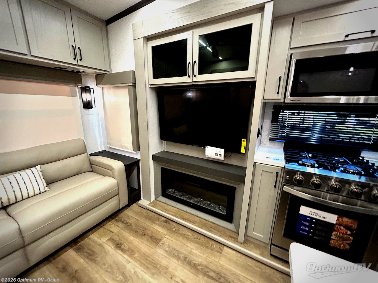It won't be hard to fall in love with this fifth wheel that can sleep four each night! There are dual opposing slides in the bedroom and in the combined kitchen and living area for maximum space to relax! You will love evenings spent in the rear living area on the theater seat across from the 50" Smart TV, and there is a sofa sleeper to let guests stay over. A four burner gas cooktop and residential style stainless steel microwave will let you cook meals each day, and the table with chairs will be the perfect place to dine together. Head to the full bath that includes a shower with a seat to easily clean up, then head off to bed in the front private bedroom. Here, you'll find a king bed slide out, a bedroom Smart TV, plus a spacious wardrobe with a shelf. There is even washer and dryer prep if you want the option to make full-time RVing easier!