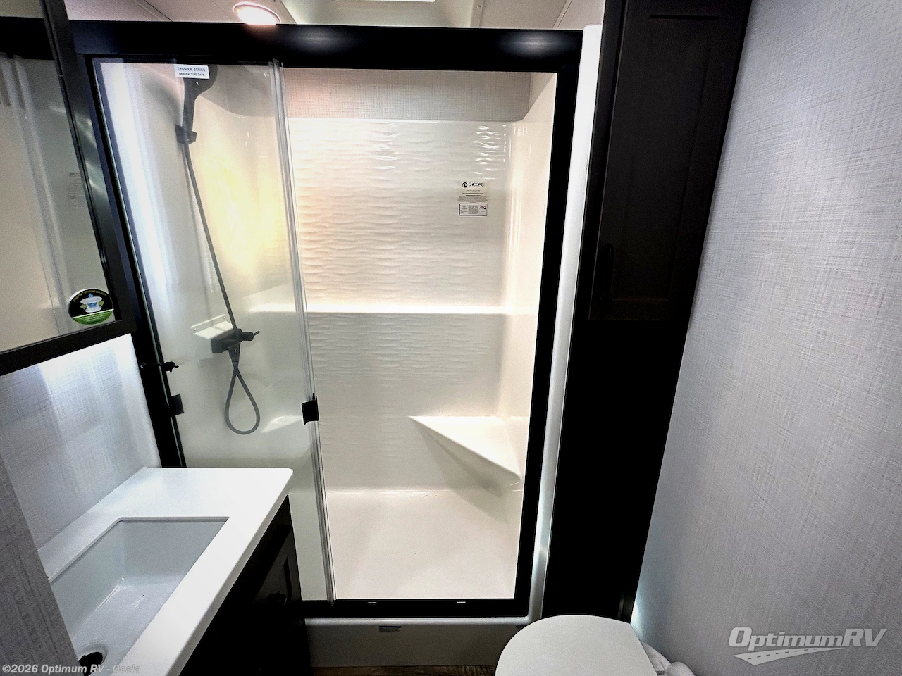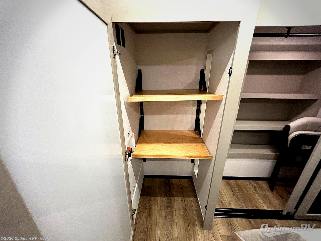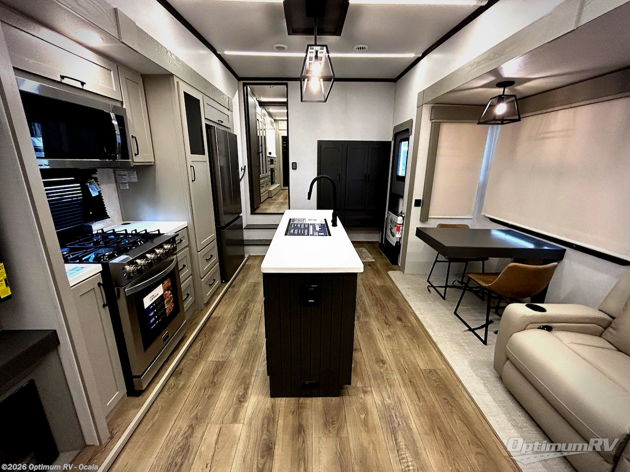 It won't be hard to fall in love with this fifth wheel that can sleep four each night! There are dual opposing slides in the bedroom and in the combined kitchen and living area for maximum space to relax! You will love evenings spent in the rear living area on the theater seat across from the 50" Smart TV, and there is a sofa sleeper to let guests stay over. A four burner gas cooktop and residential style stainless steel microwave will let you cook meals each day, and the table with chairs will be the perfect place to dine together. Head to the full bath that includes a shower with a seat to easily clean up, then head off to bed in the front private bedroom. Here, you'll find a king bed slide out, a bedroom Smart TV, plus a spacious wardrobe with a shelf. There is even washer and dryer prep if you want the option to make full-time RVing easier!