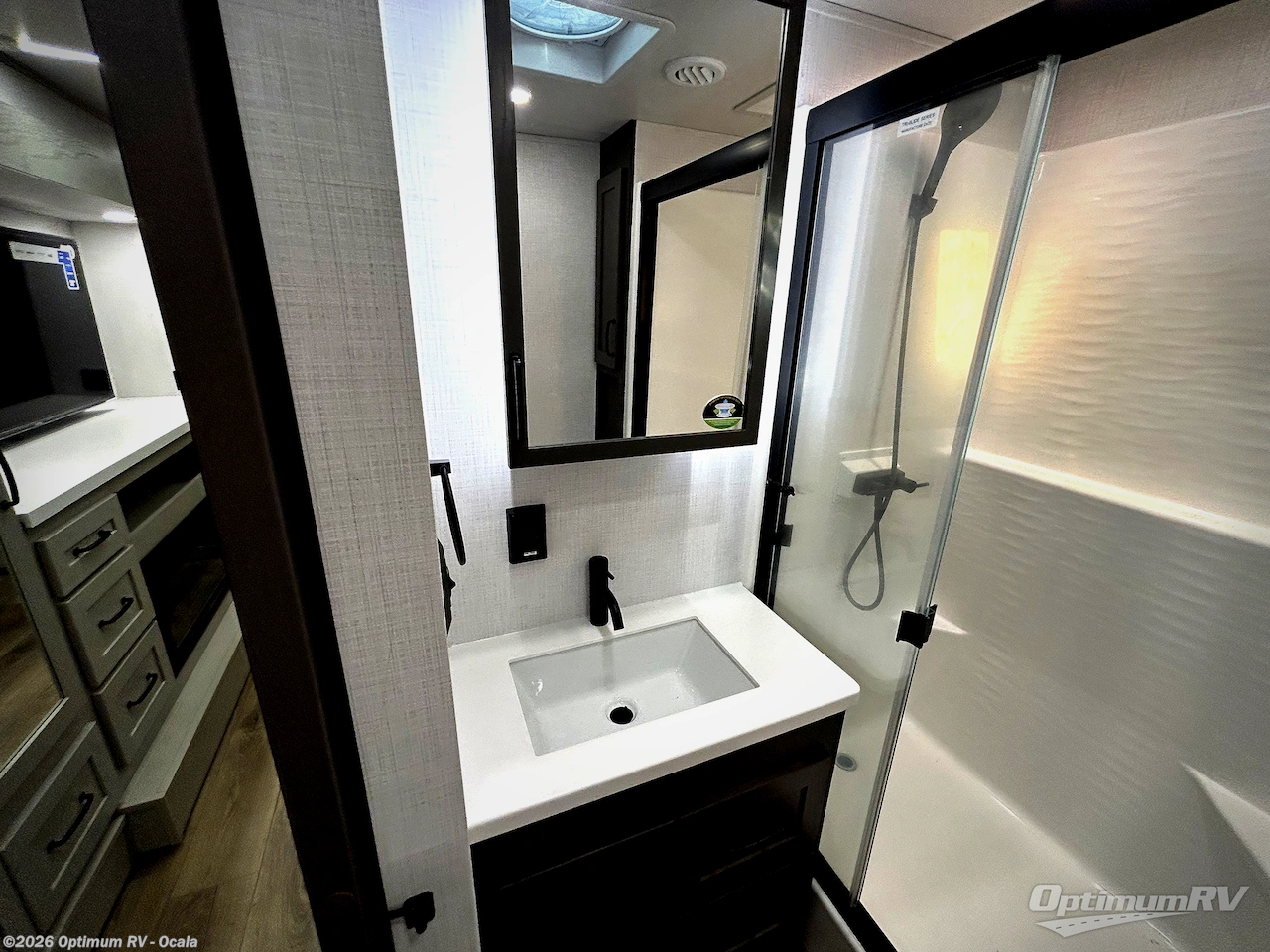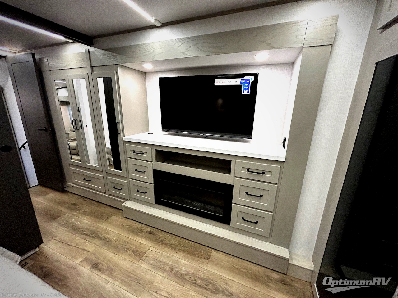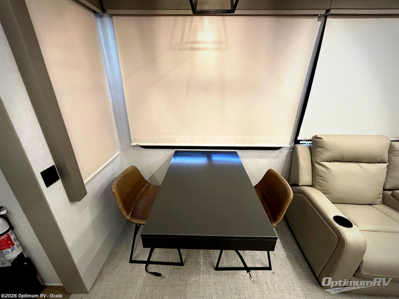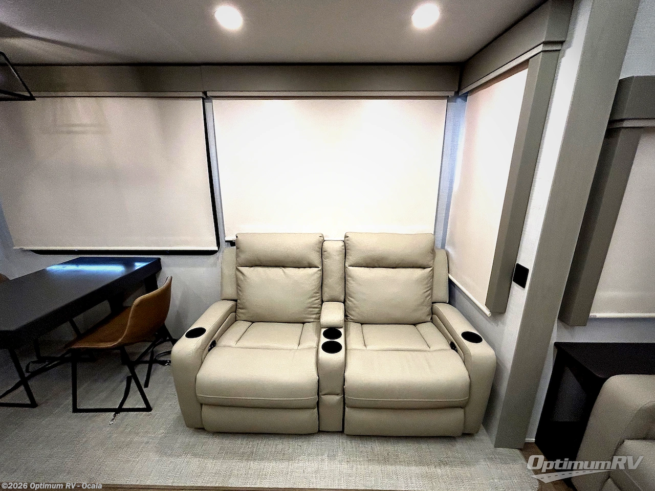 It won't be hard to fall in love with this fifth wheel that can sleep four each night! There are dual opposing slides in the bedroom and in the combined kitchen and living area for maximum space to relax! You will love evenings spent in the rear living area on the theater seat across from the 50" Smart TV, and there is a sofa sleeper to let guests stay over. A four burner gas cooktop and residential style stainless steel microwave will let you cook meals each day, and the table with chairs will be the perfect place to dine together. Head to the full bath that includes a shower with a seat to easily clean up, then head off to bed in the front private bedroom. Here, you'll find a king bed slide out, a bedroom Smart TV, plus a spacious wardrobe with a shelf. There is even washer and dryer prep if you want the option to make full-time RVing easier!