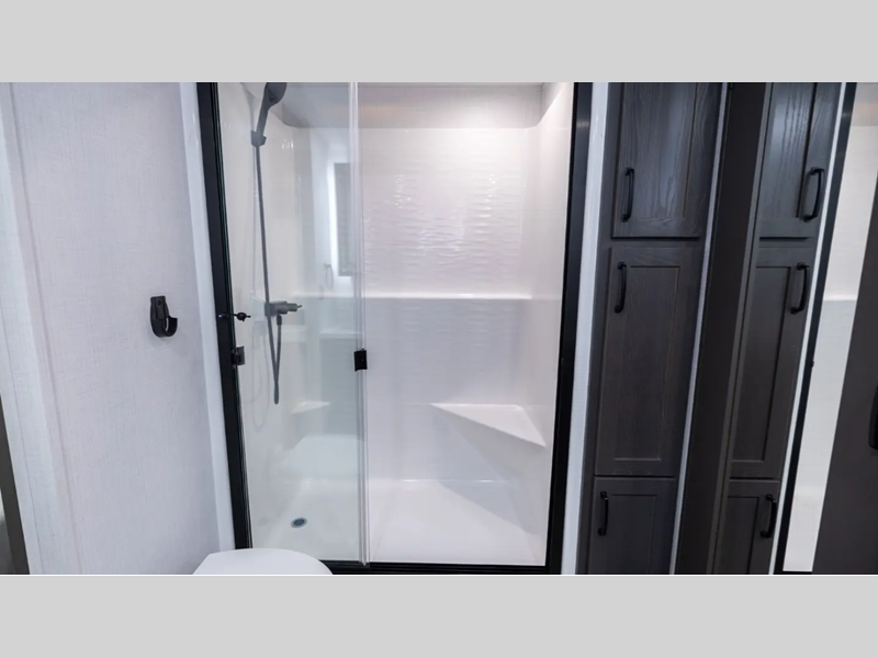 Everyone will stay clean with a bath and a half in this fifth wheel! The kitchen has a pantry big enough for everyone's favorite snacks, a four burner gas cooktop, and a kitchen island to prepare your best meals. You can have game night indoors at the table and chairs or set up a table and chairs underneath the two power awnings. The rear living area offers a comfortable place to watch the big game too with an sofa/sleeper and theater seating directly across from the entertainment center with a 50" Smart TV and fireplace. Two can get ready at once in the front bathroom featuring a vanity with dual sinks, and since there is washer and dryer prep, you have the option to make wash day easier!