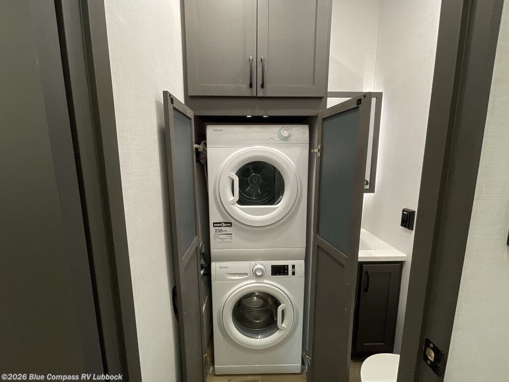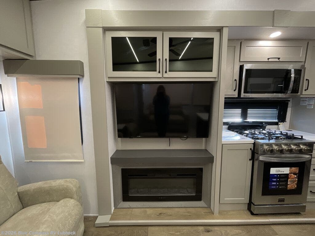 Everyone will stay clean with a bath and a half in this fifth wheel! The kitchen has a pantry big enough for everyone's favorite snacks, a four burner gas cooktop, and a kitchen island to prepare your best meals. You can have game night indoors at the table and chairs or set up a table and chairs underneath the two power awnings. The rear living area offers a comfortable place to watch the big game too with an sofa/sleeper and theater seating directly across from the entertainment center with a 50" Smart TV and fireplace. Two can get ready at once in the front bathroom featuring a vanity with dual sinks, and since there is washer and dryer prep, you have the option to make wash day easier!