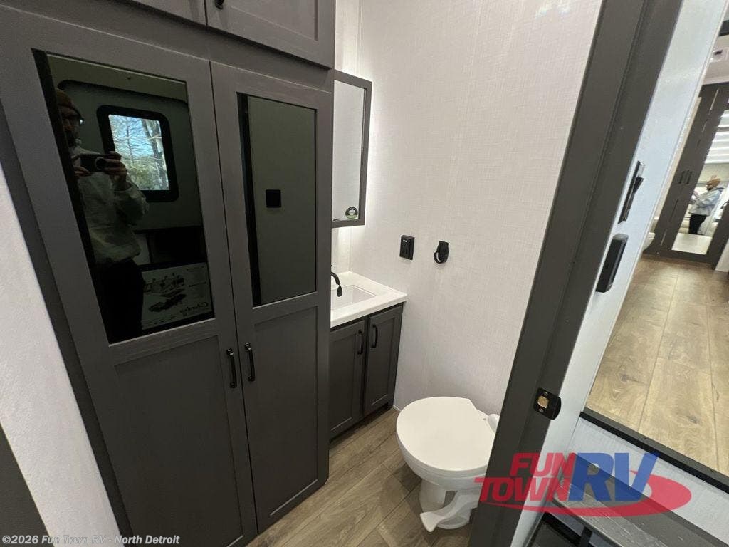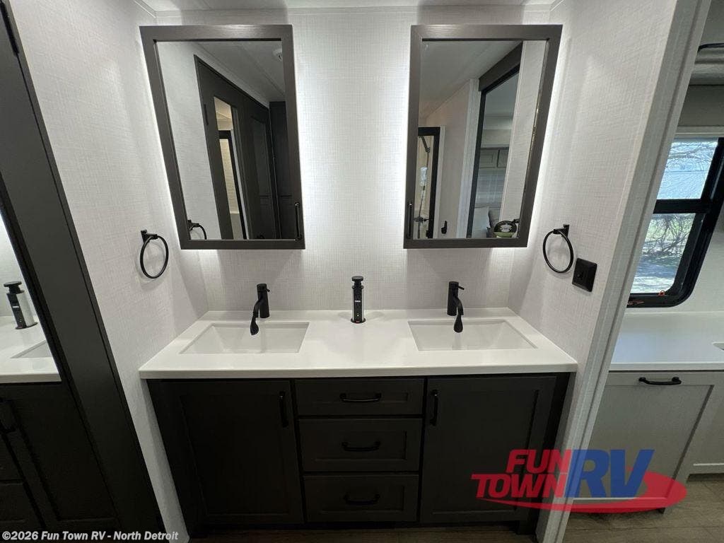 Everyone will stay clean with a bath and a half in this fifth wheel! The kitchen has a pantry big enough for everyone's favorite snacks, a four burner gas cooktop, and a kitchen island to prepare your best meals. You can have game night indoors at the table and chairs or set up a table and chairs underneath the two power awnings. The rear living area offers a comfortable place to watch the big game too with an sofa/sleeper and theater seating directly across from the entertainment center with a 50" Smart TV and fireplace. Two can get ready at once in the front bathroom featuring a vanity with dual sinks, and since there is washer and dryer prep, you have the option to make wash day easier!