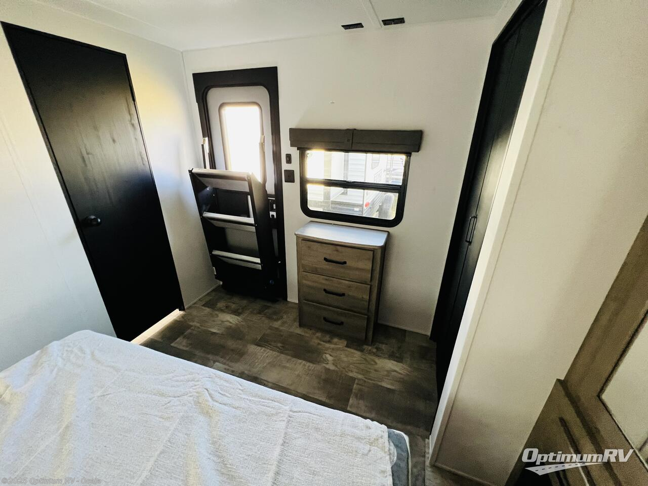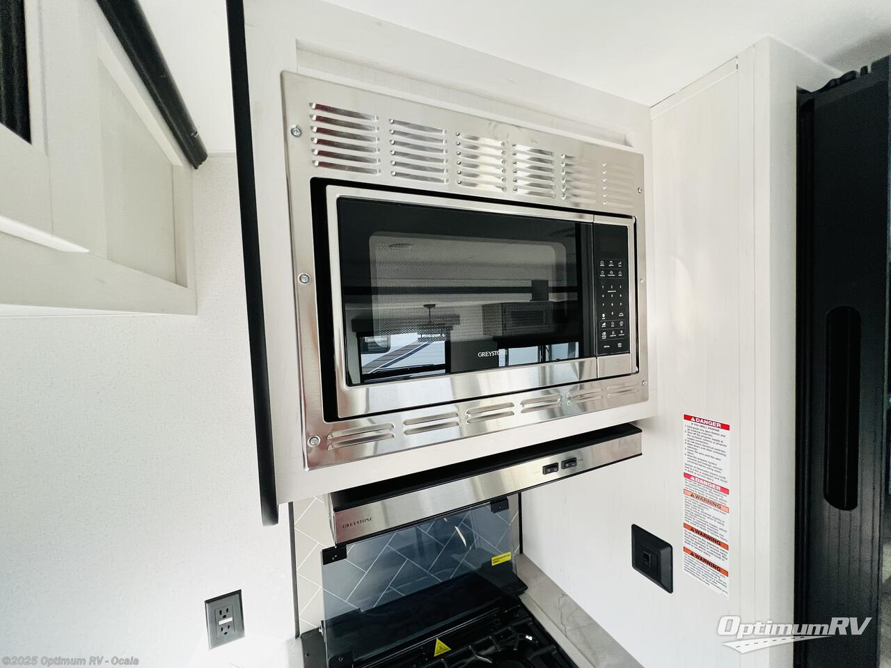 Walk into this travel trailer with one of the dual entry doors for a great camping trip! One entrance enters directly into the rear private bedroom which has a queen bed slide, a walk-in closet with washer and dryer prep, a wardrobe, and even an entrance into the dual entry bathroom. Grab a snack from the walk-in pantry then relax on the sofa while you watch a movie with the entertainment center or play a game at the booth dinette. The front kitchen has everything you will need to prepare your best home cooked meals including lots of countertop space, a stainless steel oven and range, and a stainless steel microwave!