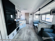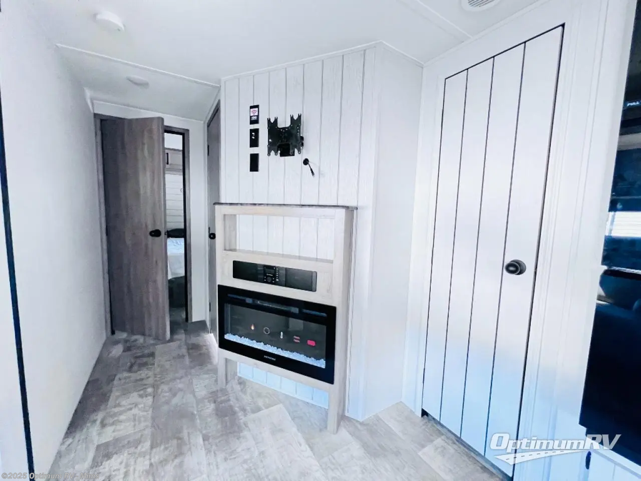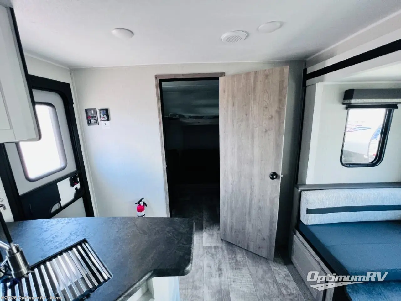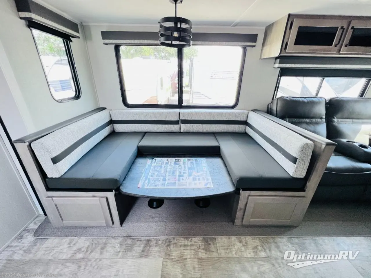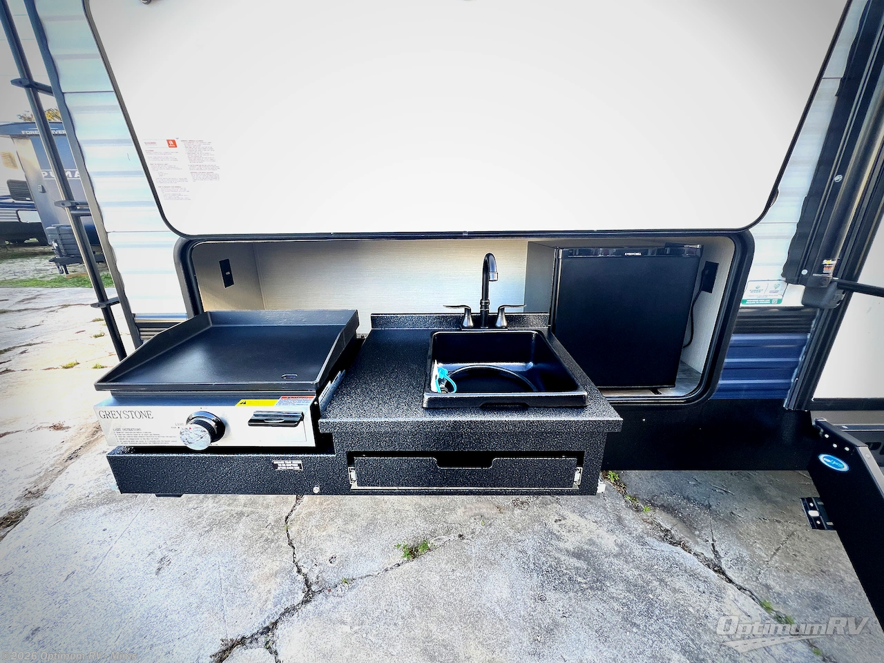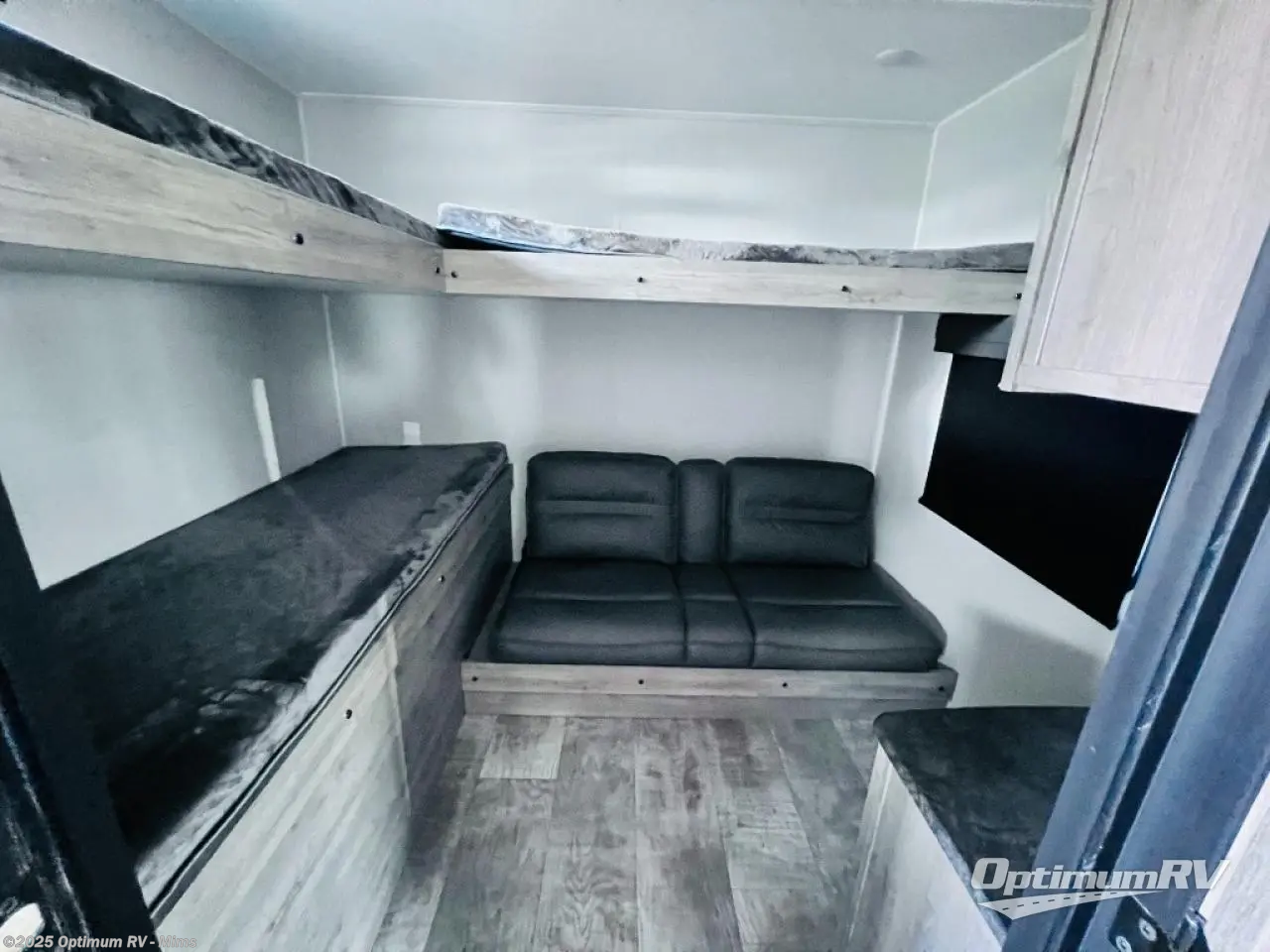 There's a comfortable place to sleep for the whole family in this travel trailer! The rear private bunkhouse has a set of 28" x 76" bunk beds, a 28" x 65" bunk above a sofa, and a wardrobe with an entertainment center above it so they can bring a cousin or two to join in on the fun. You will have your own privacy with the front private bedroom which has a queen bed with shirt closets on either side of it. The spacious full bathroom has a 34" x 34" radius shower for everyone to freshen up and one of the entrances leads directly outside so you can get back to having fun fast. Prepare your best home cooked meals indoors with the walk-in pantry, the three burner cooktop, and the 12V refrigerator. Plus, there is a U-shaped dinette to enjoy your meals and even transform into an extra sleeping space! Choose the optional mini outside kitchen for even more convenience!