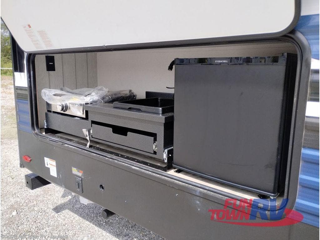 With dual entry doors and a bath and a half, you will have the ultimate in convenience with this travel trailer! The bedroom also has a front closet to keep your clothes looking their best and a queen bed slide for you to sleep your best. Everyone can freshen up in the full bathroom with the 34" x 34" radius shower and fill their bellies with scrambled eggs cooked on the three burner cooktop. Enjoy your meals, play games, and even sleep at the booth dinette or relax on the sofa while watching a movie with the entertainment center and fireplace. And your guests will love the rear private bunkhouse with three bunks, a jiffy sofa, and a slide out for more space! This model also includes an optional outside mini kitchen with a griddle!