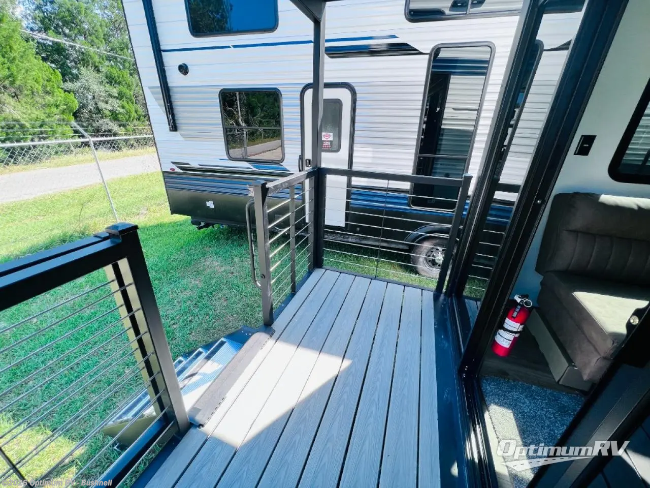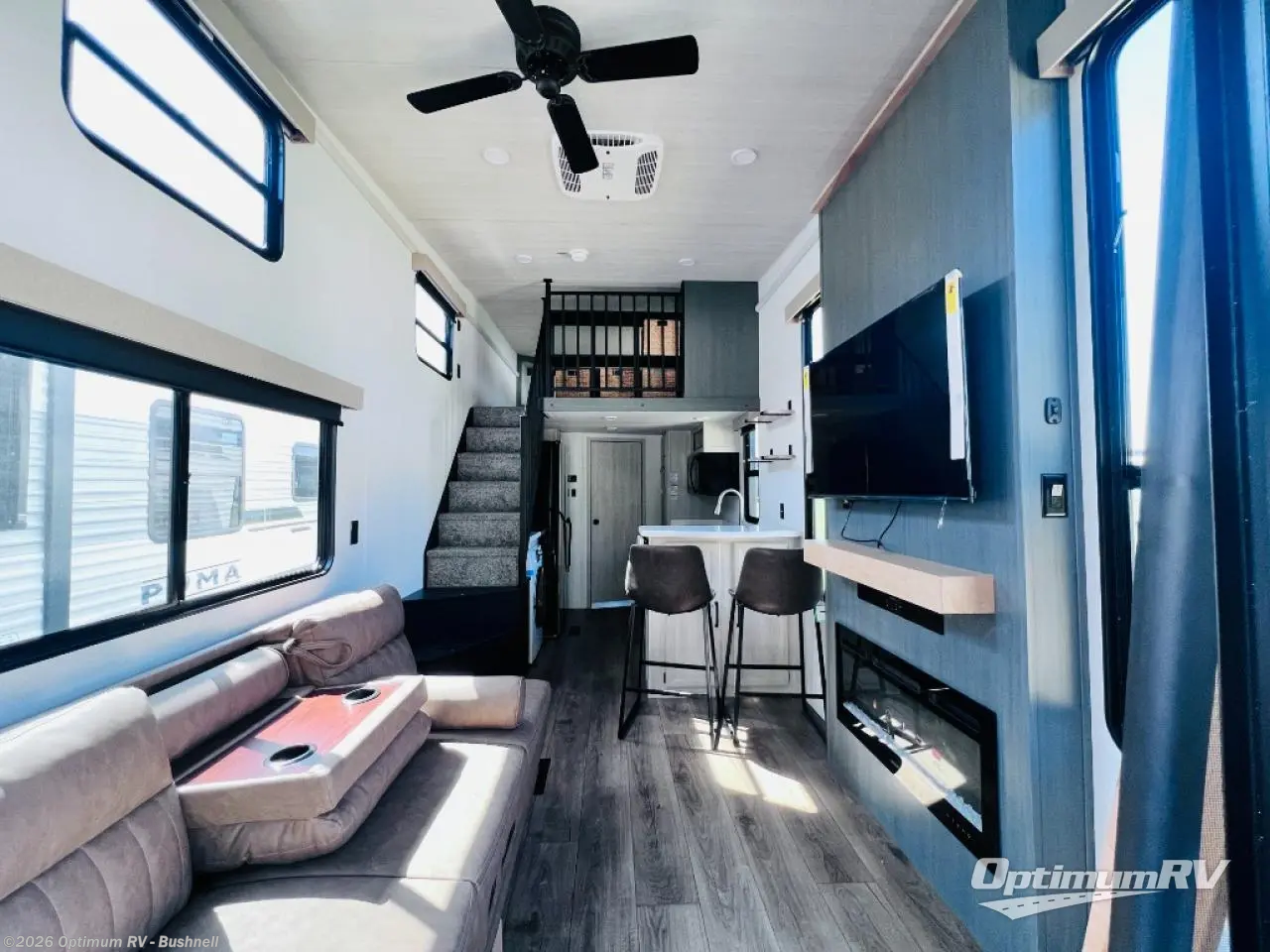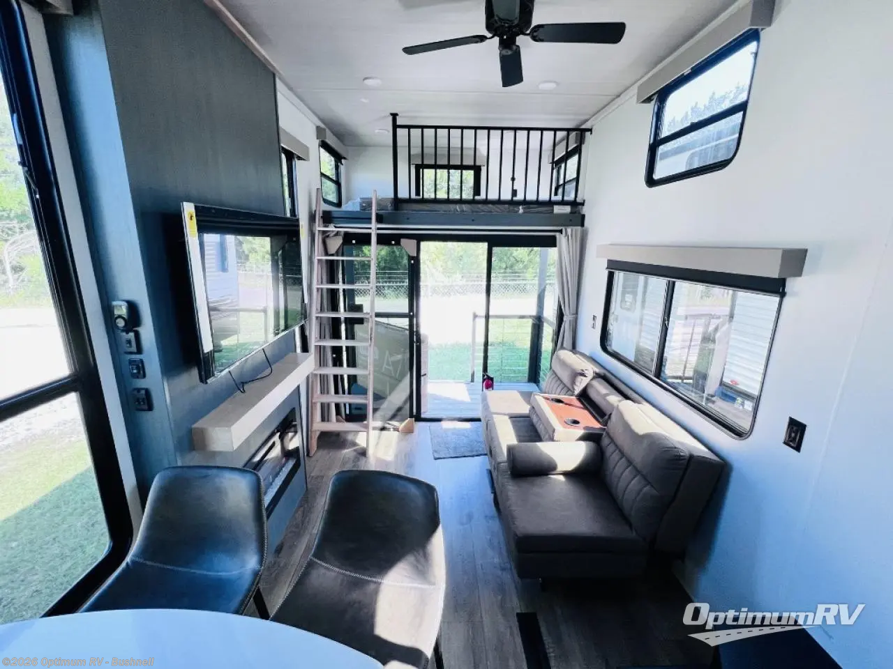 Extended stays are easier than ever with this destination trailer with a mini loft! There is a king-size bed in the large loft space, along with a shirt closet and shelves, an entertainment center with TV prep, and an optional fireplace. On the lower level you'll find a sofa where you can relax and let guests stay over, a 12V ceiling fan to keep you comfortable, and a fireplace. The kitchen includes a bar top with two stools for dining space, and the front full bath is spacious and accommodating. There are two linen closets here, shelves, plus a 34" x 40" shower. We've saved the best for last; the rear covered porch with sliding doors! Your crew can enjoy evenings out back with a cold drink, and the second loft is found above this space for more sleeping or storage space; how convenient!