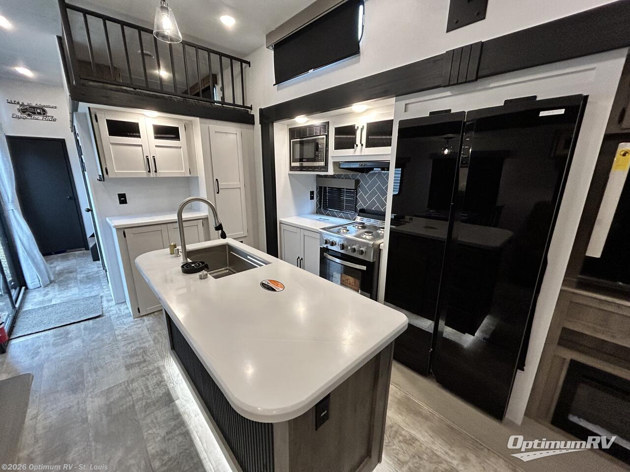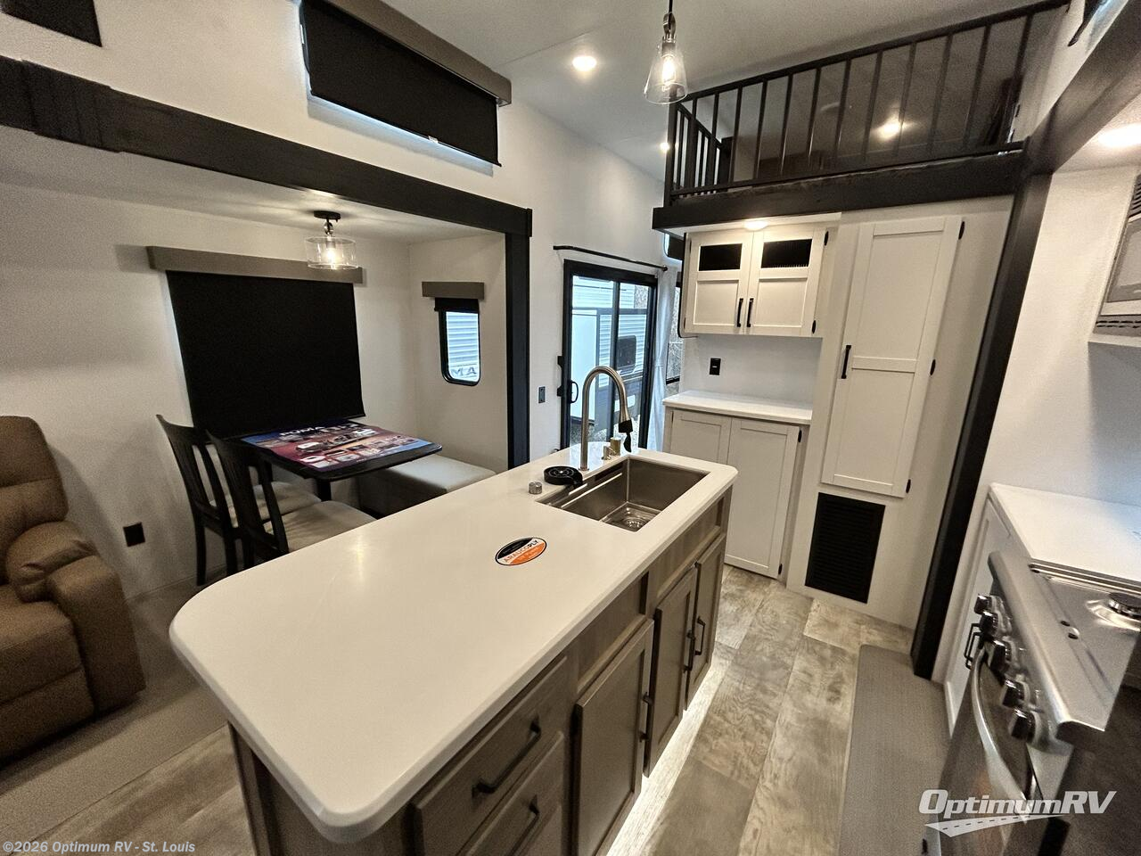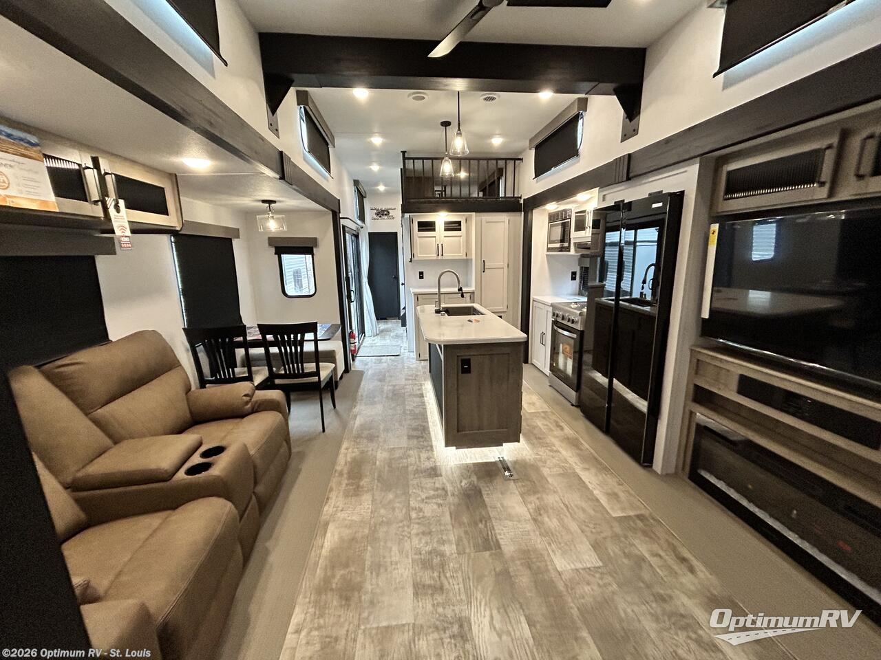 Wherever your destination may be, you can be sure to enjoy it to the fullest with this trailer in tow! With two entry doors, you can enter in through the rear private bedroom or the main living area. The bedroom includes a king bed slide out, a wardrobe/closet to keep your clothes organized, plus a closet with the option to add washer and dryer prep. Just outside this room are steps that lead to the large loft area with a 58" x 58" bunk mat and a cabinet on one side, plus two 32" x 69" bunk mats on the other. There is also a cabinet and a wardrobe/closet for plenty of storage space. Once you've headed back downstairs, you can relax on the dual recliners, front sofa, or free-standing table with a bench and two seats. And the chef of your group will love the kitchen with its residential style refrigerator and pantry, kitchen island, and four burner cooktop!