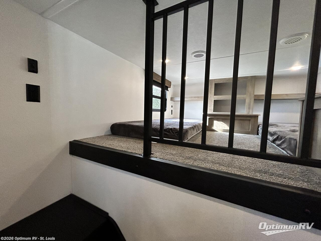 If you're planning to camp with a larger group or your family, this destination trailer will provide everything you're looking for! Your guests can take the rear bunkhouse suite that includes a slide out with a jiffy sofa and bunk bed, an entertainment center, and a full bath. You'll also find one of the dual entry doors here for added convenience. There are steps just outside the bunkhouse that lead to the loft with two bunk mats and storage space to keep this space tidy! The front private bedroom will be perfect for you with its king bed slide out, wardrobe/closet, and bedroom desk if you're needing to work from home. There is even a closet with the option to add washer and dryer prep. In the morning, everyone can meet in the combined middle living area and kitchen. A large slide out here houses the free-standing table and sofa, and the fireplace is close by to make it feel a little more like home!