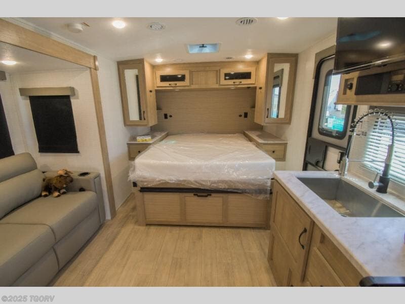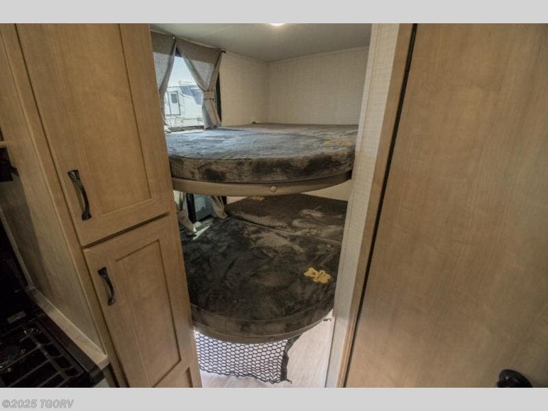 This trailer allows you to camp in comfort at your favorite RV sites thanks to the slide out dinette, convertible bunks, and front queen Murphy bed! When the bed is put away, you can relax on the jack-knife sofa with storage below for extra blankets or board games. If you're needing even more sleeping space, just choose the optional tri-fold sofa in place of the dinette! The galley kitchen includes amenities such as a microwave and cooktop to cook meals, plus an 11 cu. ft. electric refrigerator and pantry for food storage. The rear corner full bath includes a 24" x 36" shower and a linen closet to store clean towels, and the bunk beds are right next to the bath for easy nighttime use!