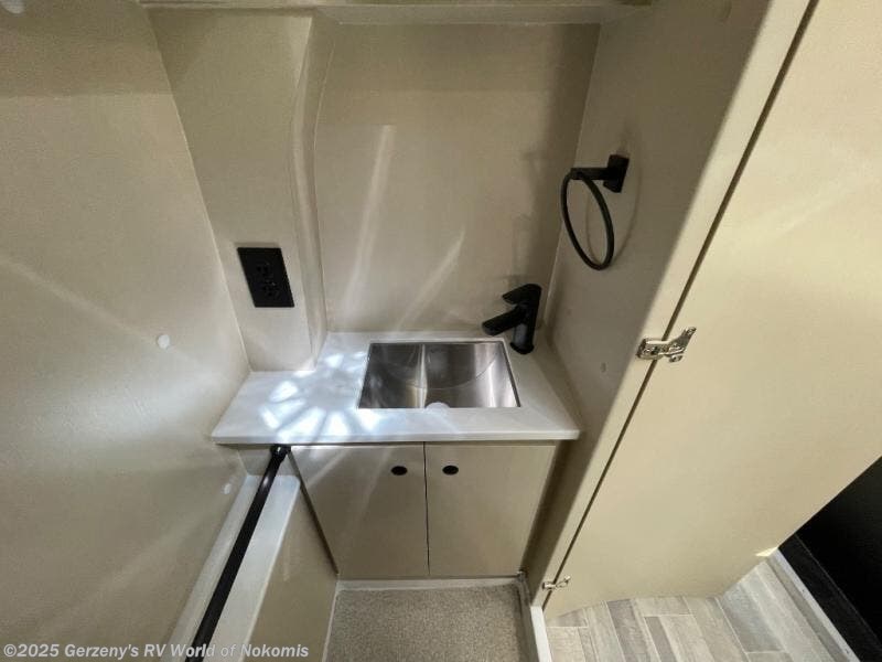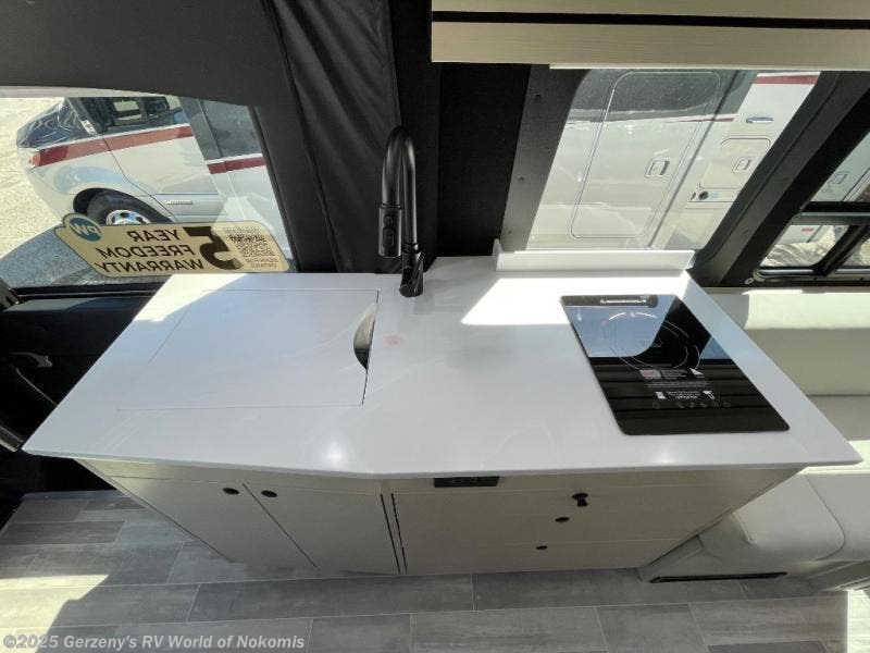 This 2.2 Ontour model is similar to model 2.0, but with a larger refrigerator, and more storage space in the bath. The rear power sofa converts to a 68" x 76" queen-sized bed with memory foam cushions for all-around comfort and the wet bath allows you to clean up each day. There is also a vanity with storage, a sink, and a Corian countertop in the bath for added convenience. Prepare meals either on the one burner induction stove top or in the microwave oven and clean up will be a breeze with a stainless steel sink that includes a high-arc faucet.