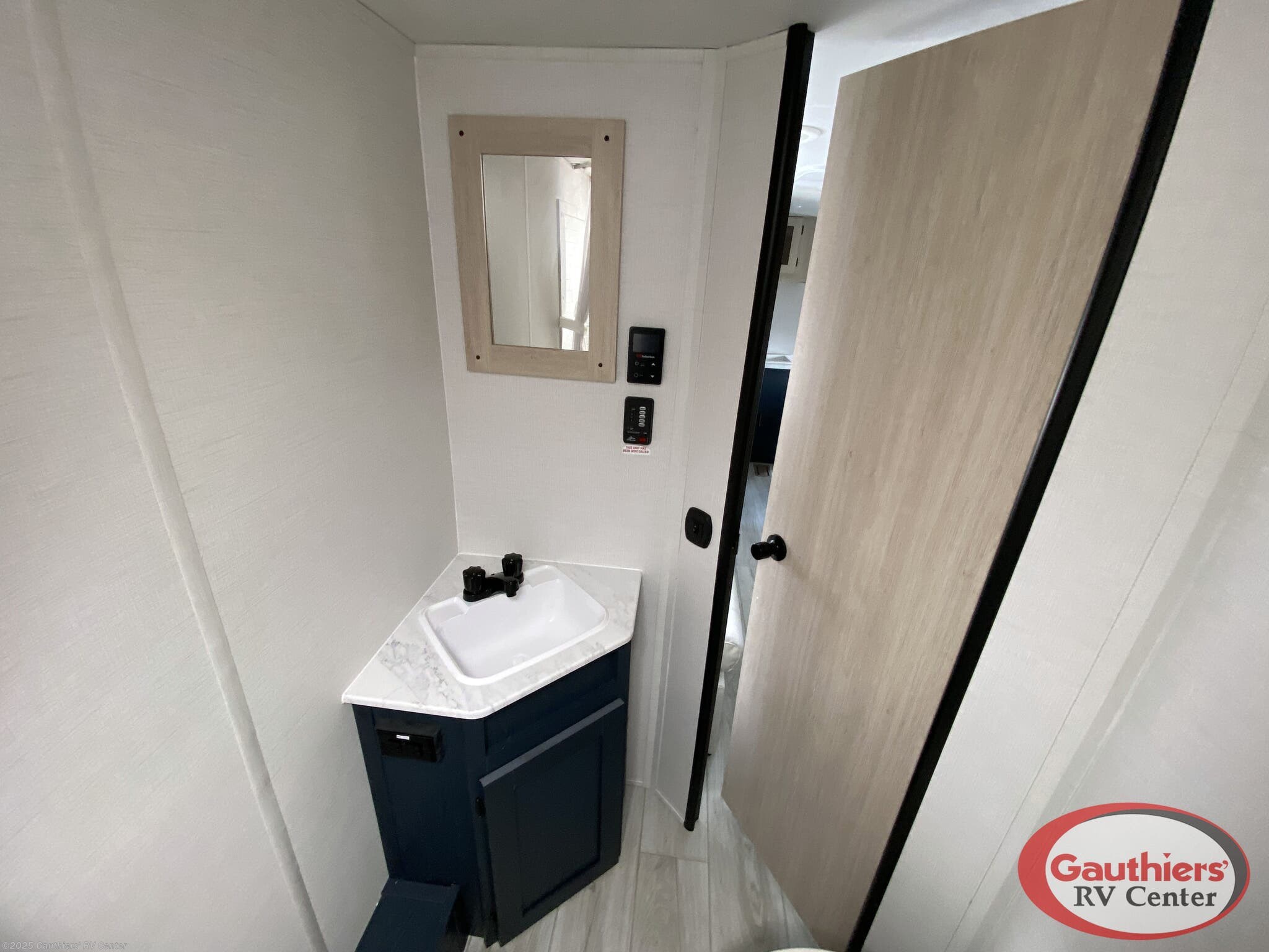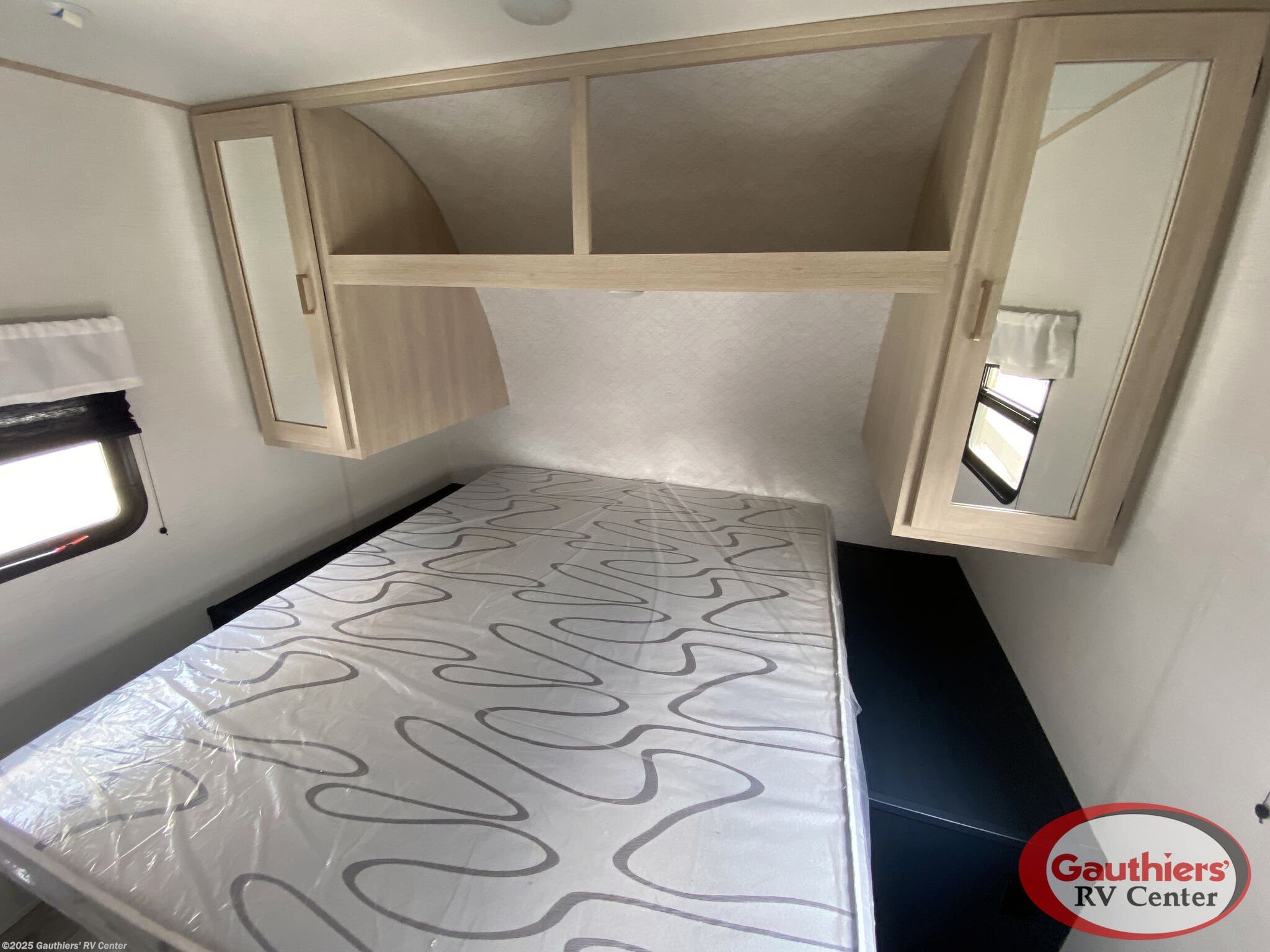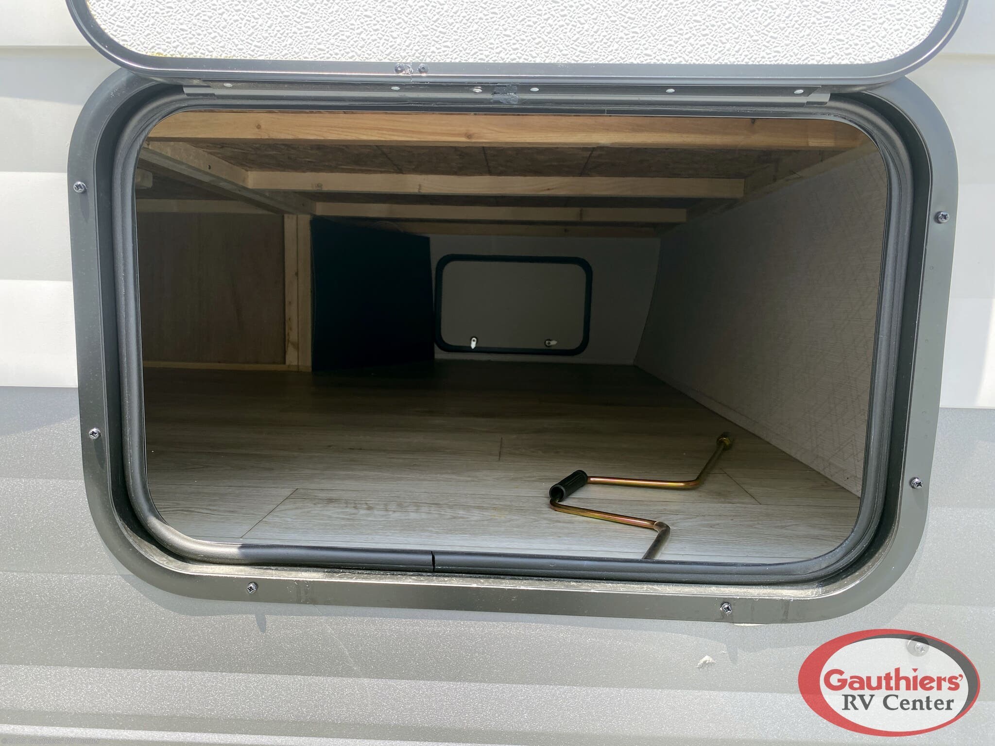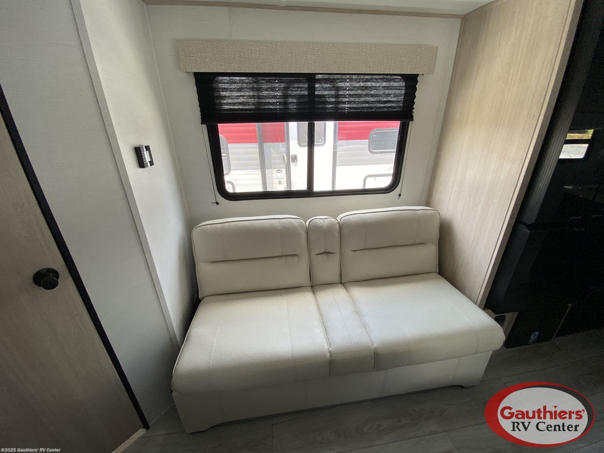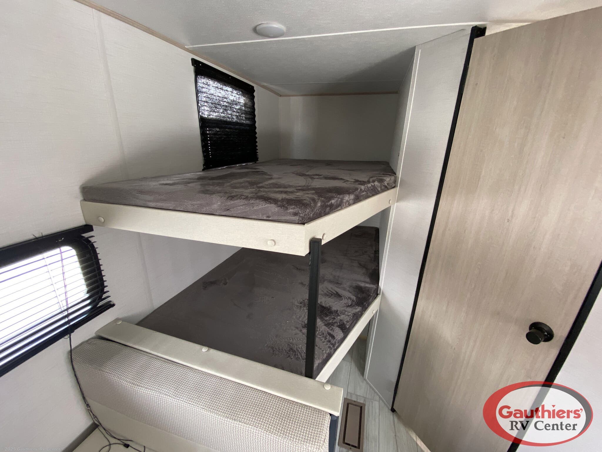 Inside, you’ll enjoy a well-equipped kitchen featuring Microwave, Oven, Stove Top Burner, and a 12V 10 cu ft Refrigerator. The unit also includes an on-demand water heater, a 15,000 BTU air conditioner, and insulated construction for year-round comfort. A booth dinette and a Queen bed in the front area provide practical, home-like living space. The Dove interior color adds a warm, inviting feel to every trip, while the rear bunk area maximizes sleeping capacity without sacrificing common areas.