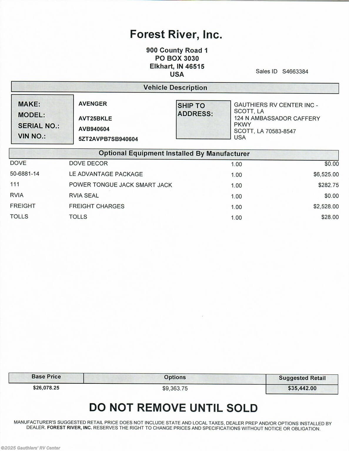 - Type: Travel Trailer — 2025 Prime Time Avenger LE