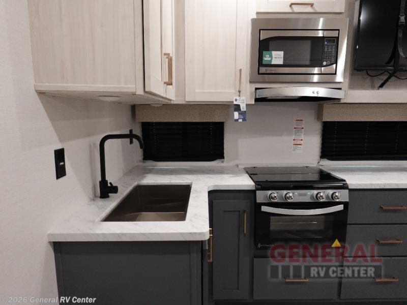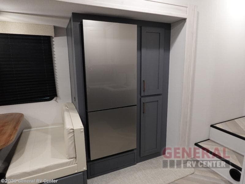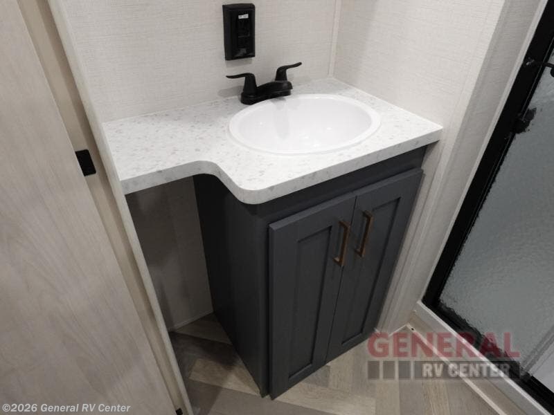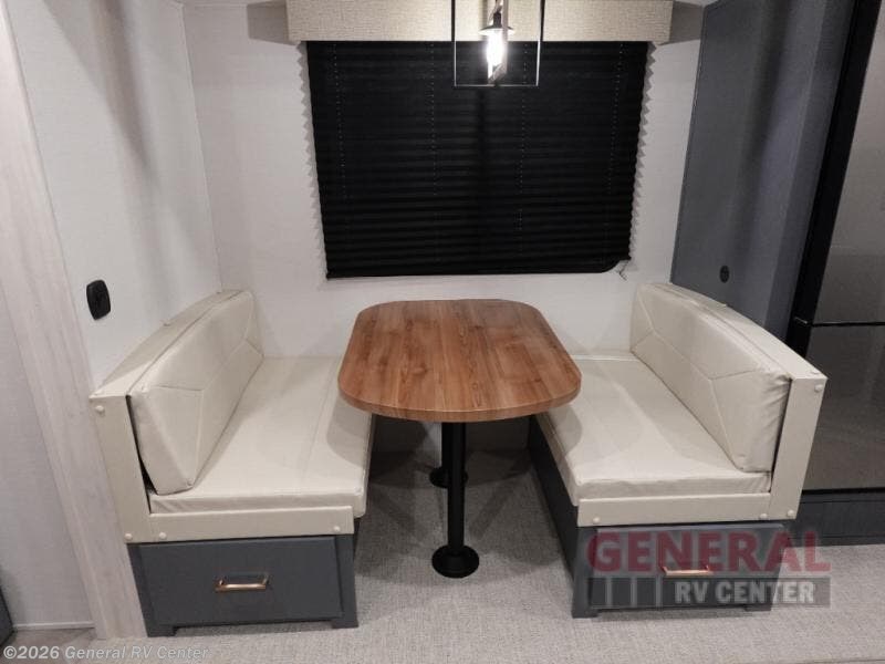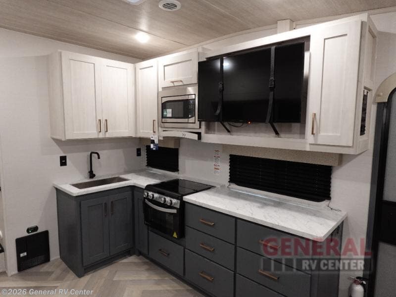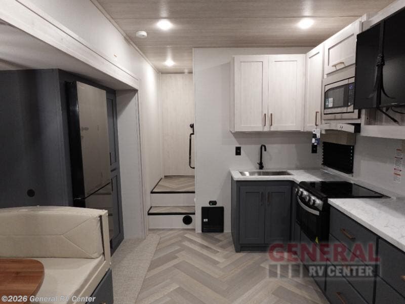 When you're ready to escape the hustle and bustle of city life, hook up this fifth wheel and head out to the woods! Once you set up the awning, you can grab the fishing poles from the pass-through storage and get some fishing in before dinner. The kitchen includes a 10.7 cu. ft. 12V refrigerator, a high-rise faucet, and designer countertops you are sure to love. You can dine at the booth dinette within the slide out, or relax on the sofa, both of which are in good view of the 40" LED Smart TV! The front private bedroom in this model will feel just like home with its walk-around queen bed, wardrobe, and dual nightstands!