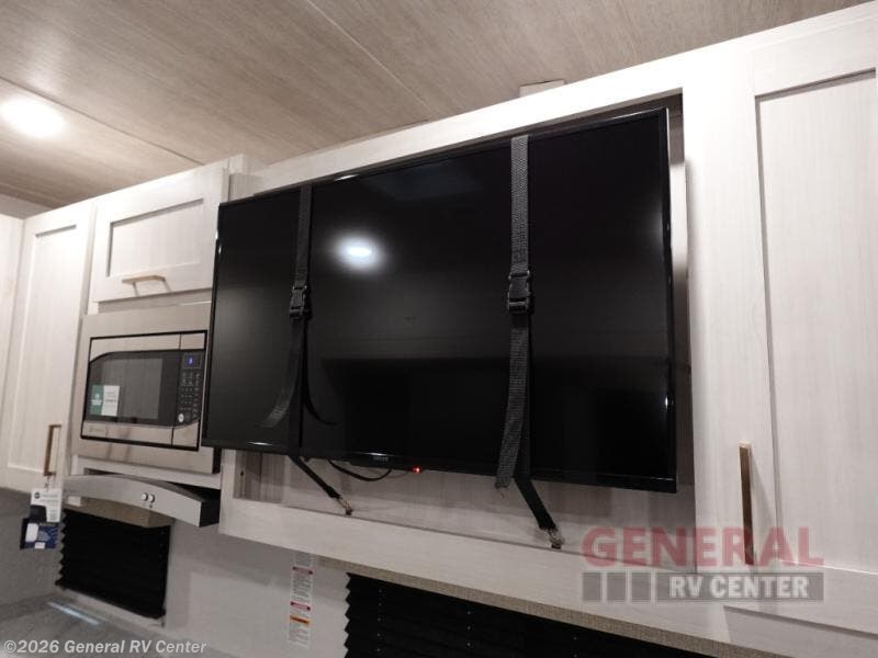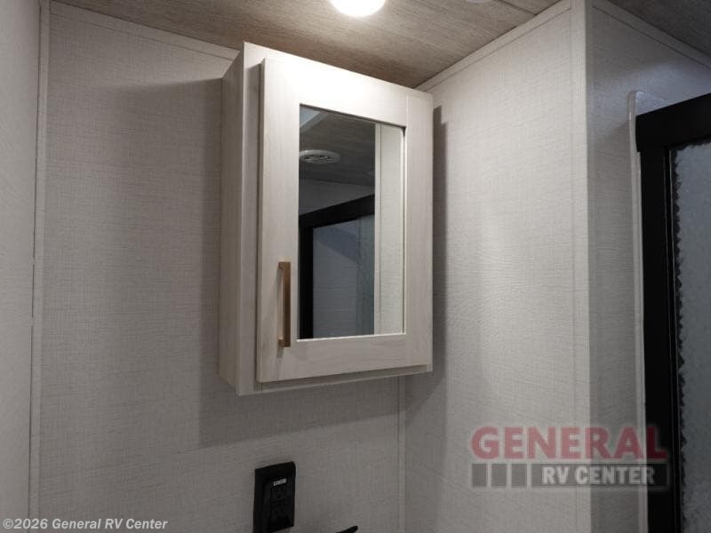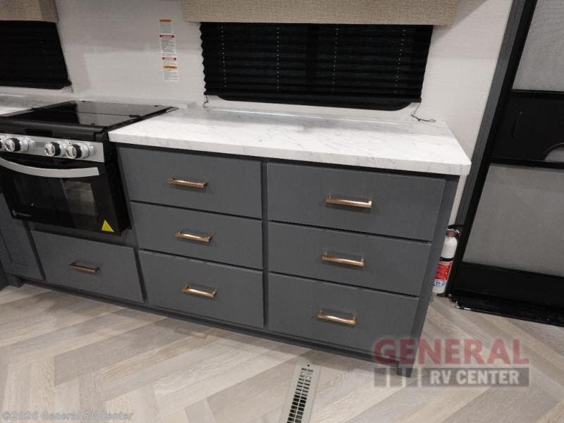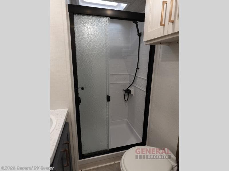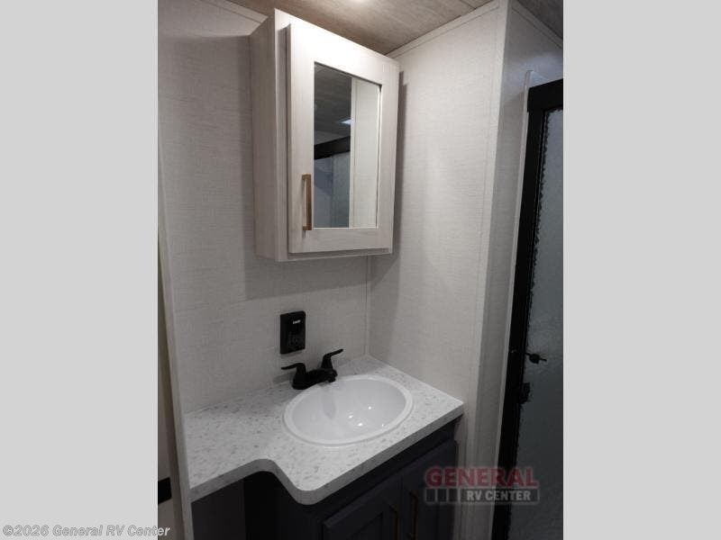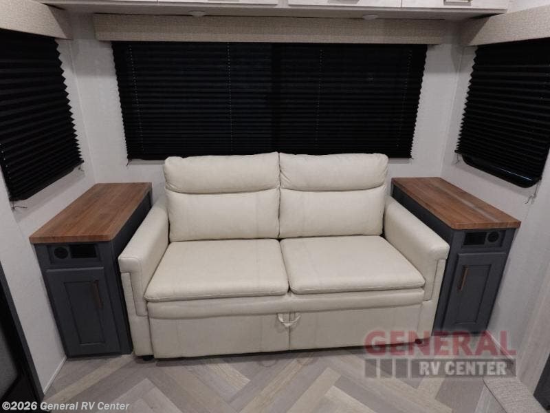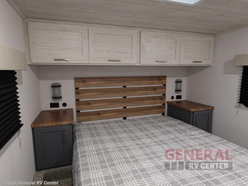 When you're ready to escape the hustle and bustle of city life, hook up this fifth wheel and head out to the woods! Once you set up the awning, you can grab the fishing poles from the pass-through storage and get some fishing in before dinner. The kitchen includes a 10.7 cu. ft. 12V refrigerator, a high-rise faucet, and designer countertops you are sure to love. You can dine at the booth dinette within the slide out, or relax on the sofa, both of which are in good view of the 40" LED Smart TV! The front private bedroom in this model will feel just like home with its walk-around queen bed, wardrobe, and dual nightstands!