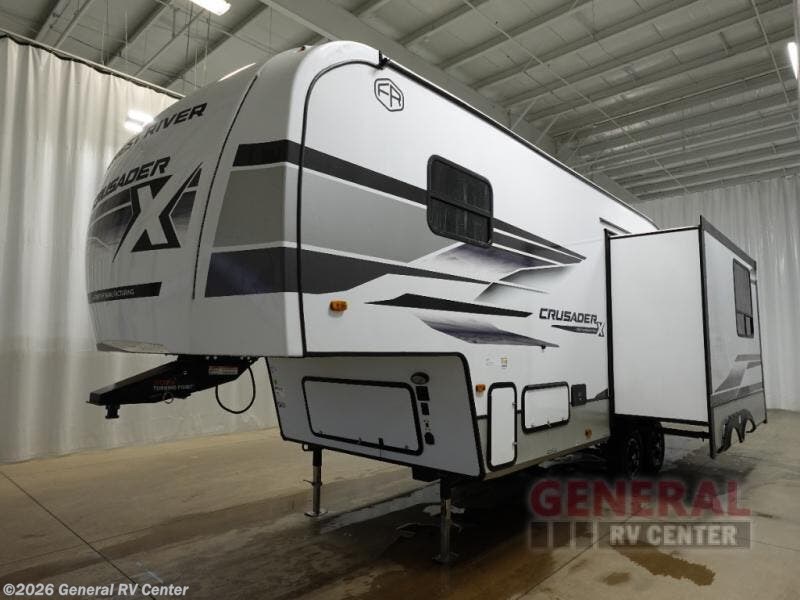 The Crusader X fifth wheels by Prime Time RV are a step above the rest and it's not hard to see why. Each model has been constructed to last with its Eternabond construction, a one-piece PVC roof, and a gel coat fiberglass exterior. The labeled universal docking center will have you set up to camp in no-time, and there is a convenient bottle opener and Doggy D-ring for your furry companions. You will feel right at home with designer countertops, designer carefree linoleum with Scotchgard technology, blackout pleated shades, and many more comforts. The Crusader X also comes standard with a 15,000 BTU A/C, a 35,000 BTU high capacity gas furnace, a tankless on-demand water heater, and the Extreme Thermal Package Plus, making your camping season year-around!