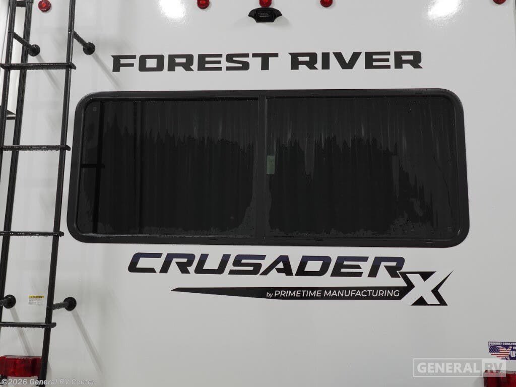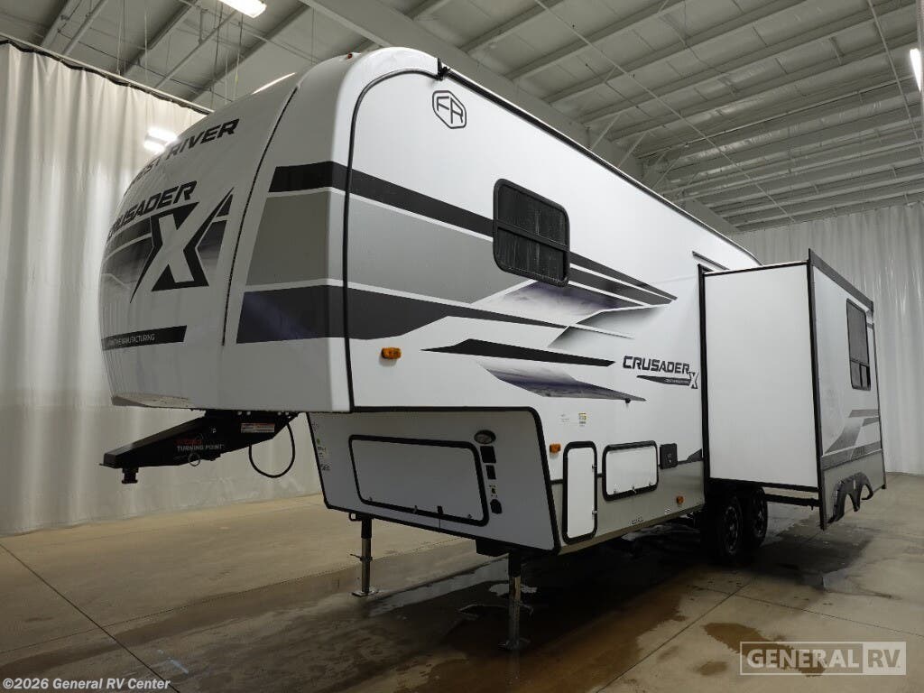 Prime Time Crusader X fifth wheel 250RLX highlights: Rear Sofa Full Bath 18' Electric with LED Lights Kitchen Pantry When you're ready to escape the hustle and bustle of city life, hook up this fifth wheel and head out to the woods! Once you set up the awning, you can grab the fishing poles from the pass-through storage and get some fishing in before dinner. The kitchen includes a 10.7 cu. ft. 12V refrigerator, a high-rise faucet, and designer countertops you are sure to love. You can dine at the booth dinette within the slide out, or relax on the sofa, both of which are in good view of the 40" LED Smart TV! The front private bedroom in this model will feel just like home with its walk-around queen bed, wardrobe, and dual nightstands! The Crusader X fifth wheels by Prime Time RV are a step above the rest and it's not hard to see why. Each model has been constructed to last with its Eternabond construction, a one-piece PVC roof, and a gel coat fiberglass exterior. The labeled universal docking center will have you set up to camp in no-time, and there is a convenient bottle opener and Doggy D-ring for your furry companions. You will feel right at home with designer countertops, designer carefree linoleum with Scotchgard technology, blackout pleated shades, and many more comforts. The Crusader X also comes standard with a 15,000 BTU A/C, a 35,000 BTU high capacity gas furnace, a tankless on-demand water heater, and the Extreme Thermal Package Plus, making your camping season year-around!