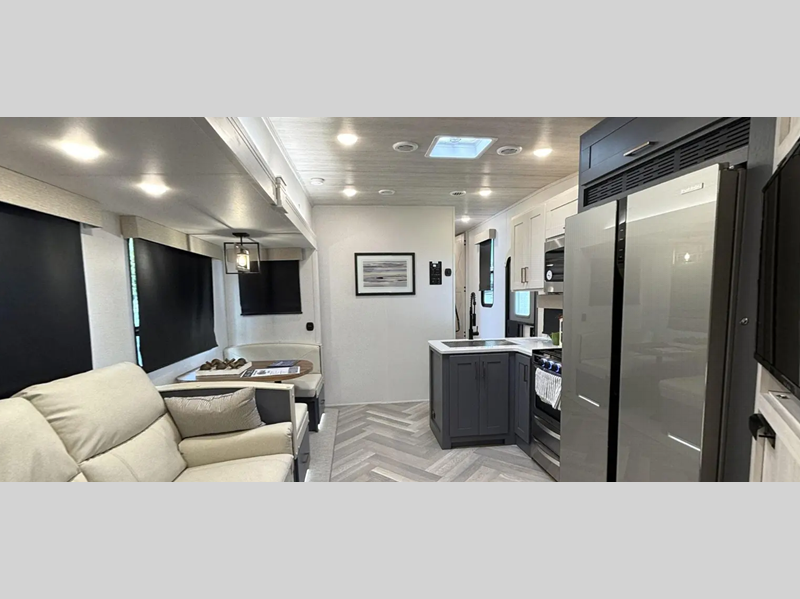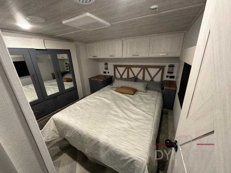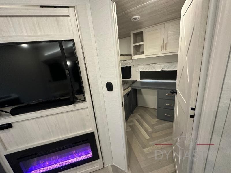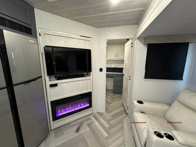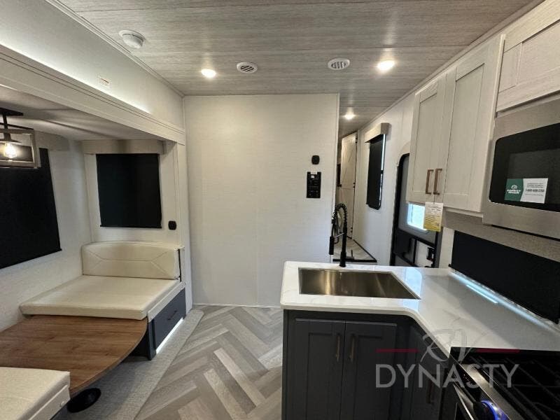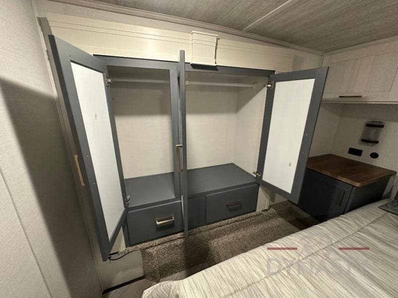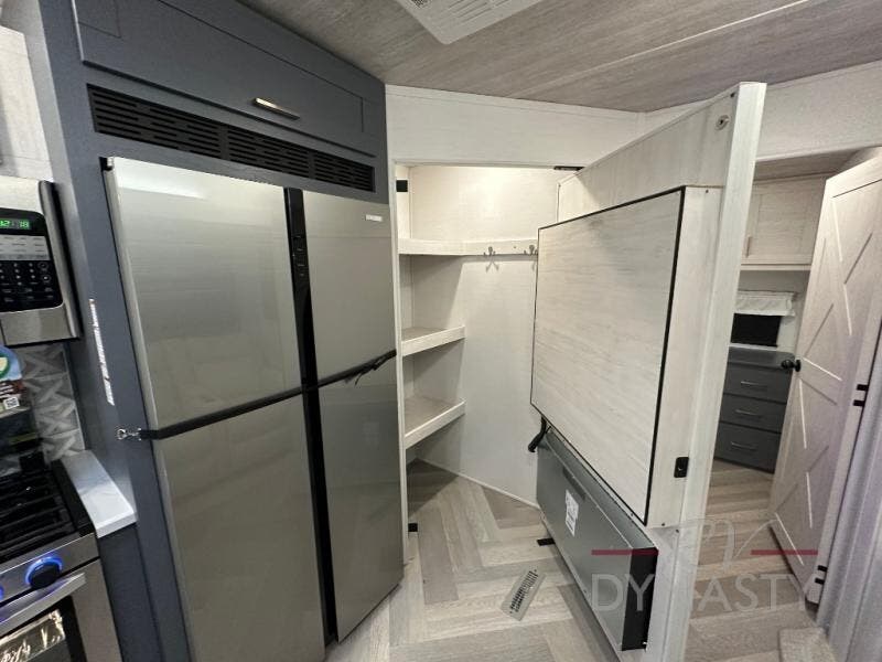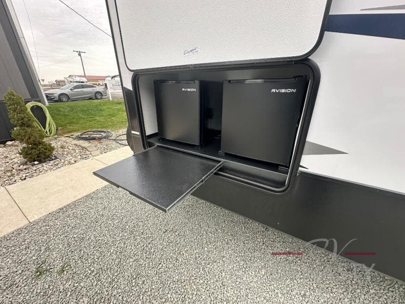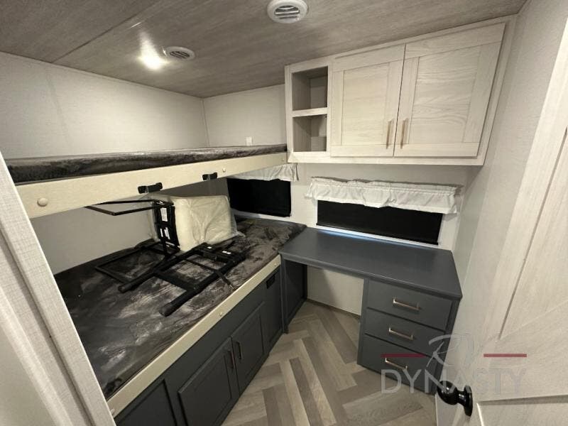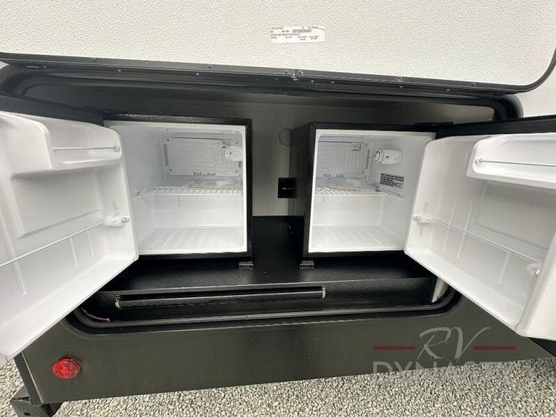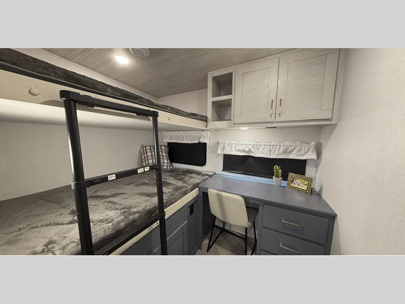 A rear private bunkhouse for your guests and a front private bedroom for you; it's the perfect fifth wheel to camp with a larger group! Four campers can sleep on the double-size bunks, and there is overhead storage plus a desk with drawers below if you need to get some work done. You'll find your own storage in the front private bedroom within the wardrobe slide, plus there are dual nightstands to keep your book, phone, and glasses nearby. Everyone can meet in the combined kitchen and living area in the morning as the cook makes breakfast on the three burner cooktop. You'll find seating spaces on the theater seating or the booth dinette that can be optioned out for a free-standing table with four chairs. Some other stand-out features this model includes are the coat hooks and storage cubbies, the hidden pantry behind the entertainment center, and the outside kitchen!