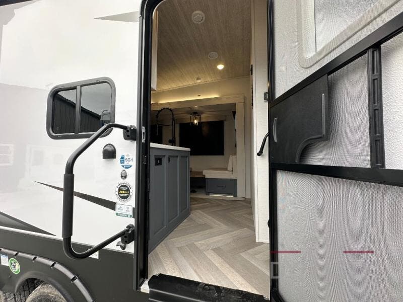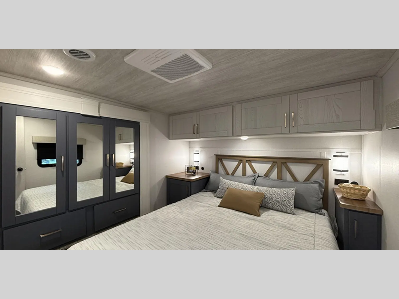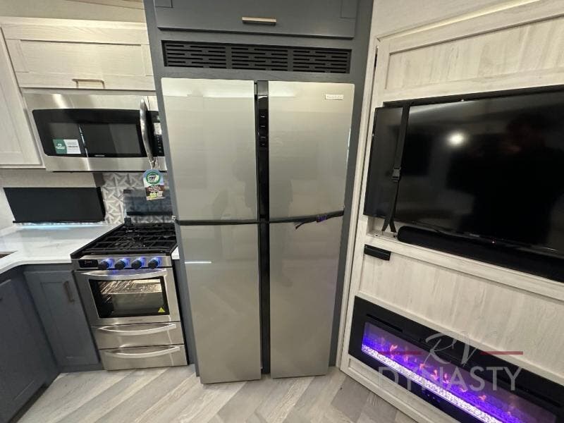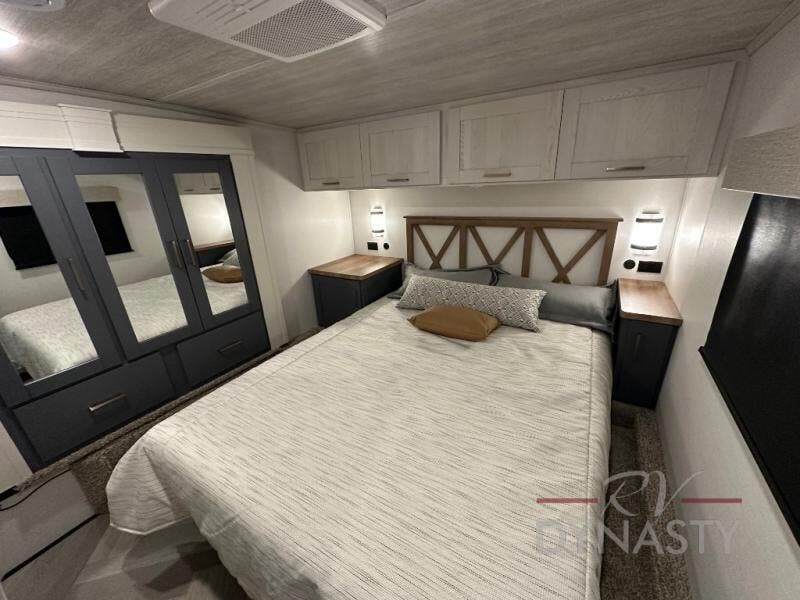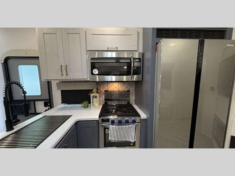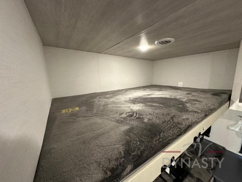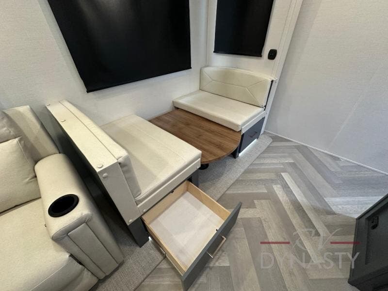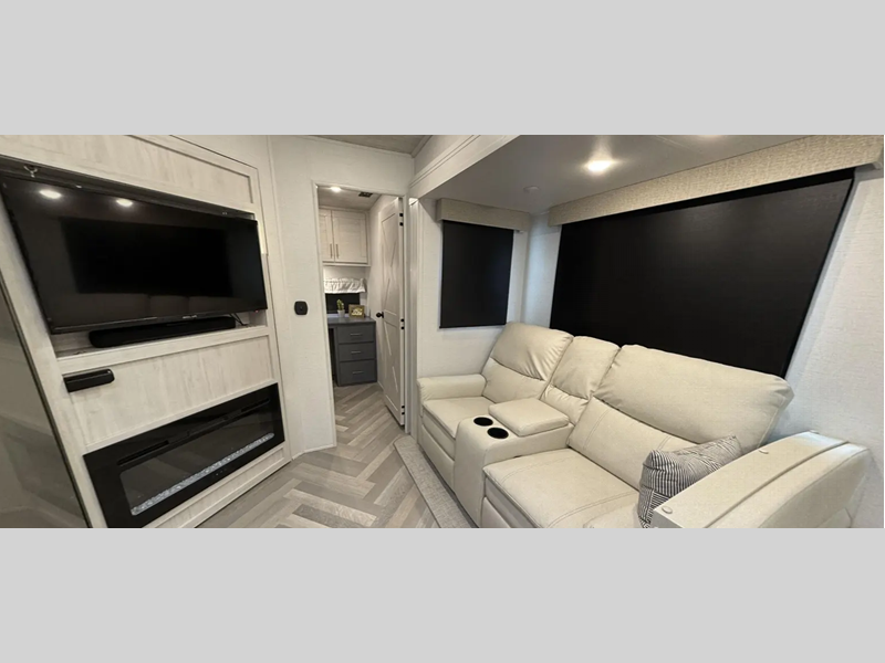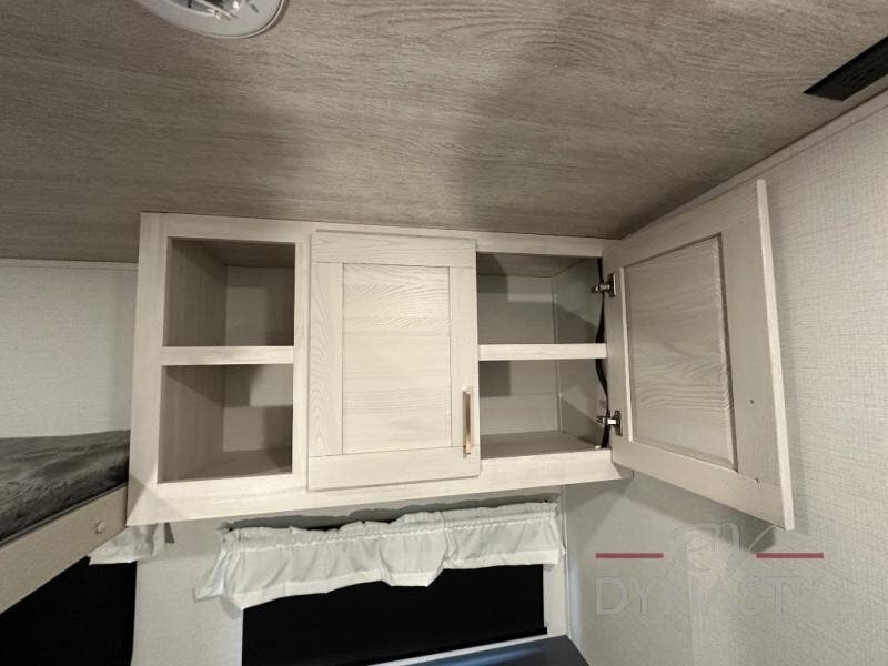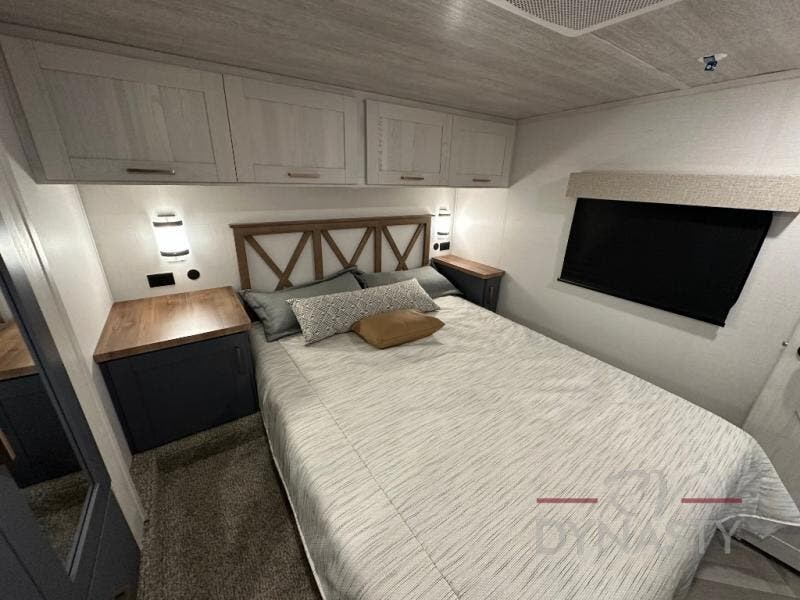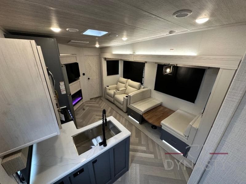 A rear private bunkhouse for your guests and a front private bedroom for you; it's the perfect fifth wheel to camp with a larger group! Four campers can sleep on the double-size bunks, and there is overhead storage plus a desk with drawers below if you need to get some work done. You'll find your own storage in the front private bedroom within the wardrobe slide, plus there are dual nightstands to keep your book, phone, and glasses nearby. Everyone can meet in the combined kitchen and living area in the morning as the cook makes breakfast on the three burner cooktop. You'll find seating spaces on the theater seating or the booth dinette that can be optioned out for a free-standing table with four chairs. Some other stand-out features this model includes are the coat hooks and storage cubbies, the hidden pantry behind the entertainment center, and the outside kitchen!