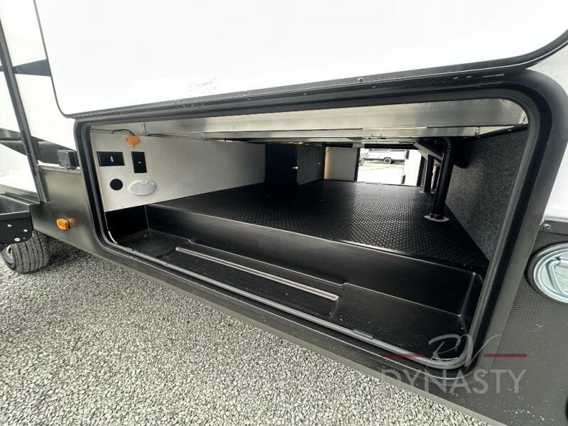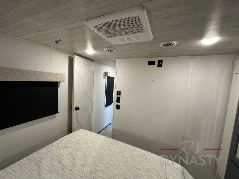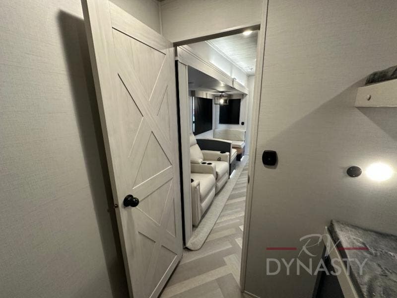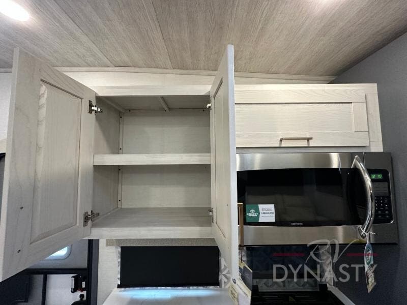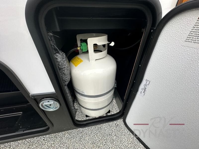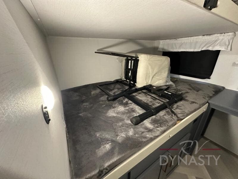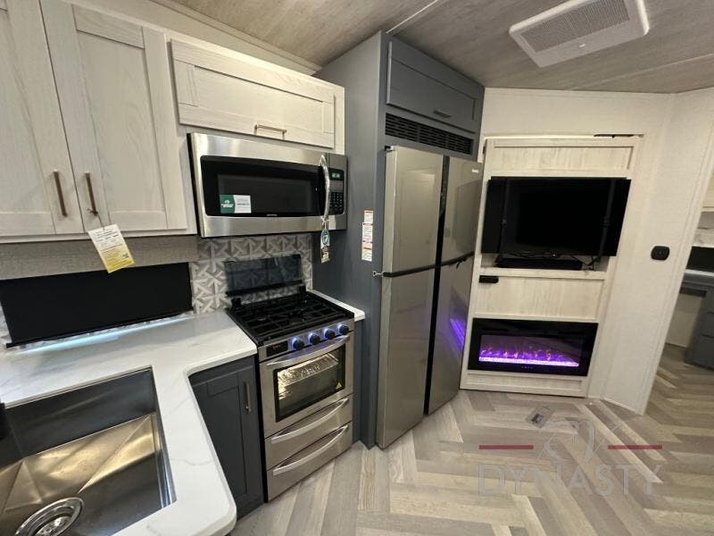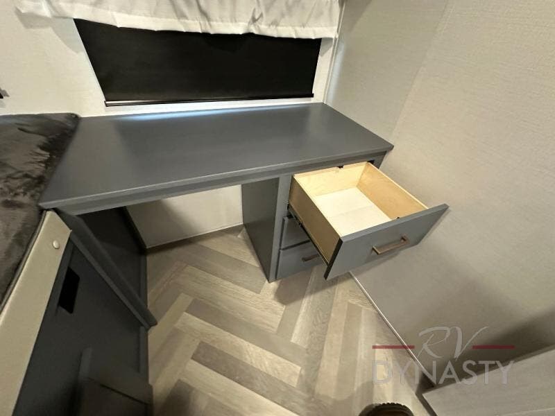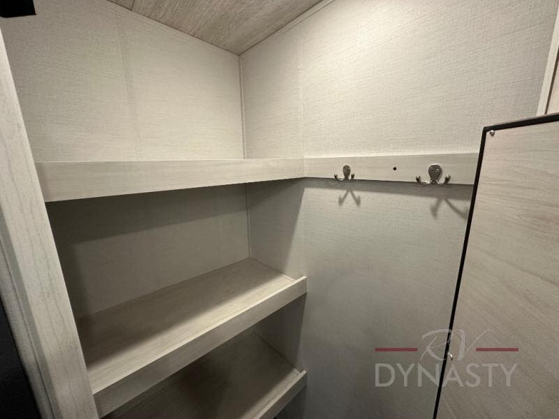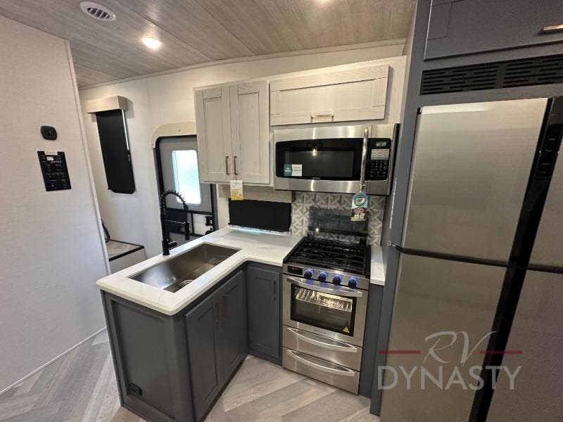 A rear private bunkhouse for your guests and a front private bedroom for you; it's the perfect fifth wheel to camp with a larger group! Four campers can sleep on the double-size bunks, and there is overhead storage plus a desk with drawers below if you need to get some work done. You'll find your own storage in the front private bedroom within the wardrobe slide, plus there are dual nightstands to keep your book, phone, and glasses nearby. Everyone can meet in the combined kitchen and living area in the morning as the cook makes breakfast on the three burner cooktop. You'll find seating spaces on the theater seating or the booth dinette that can be optioned out for a free-standing table with four chairs. Some other stand-out features this model includes are the coat hooks and storage cubbies, the hidden pantry behind the entertainment center, and the outside kitchen!