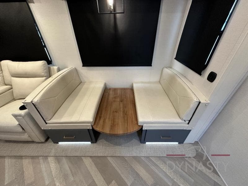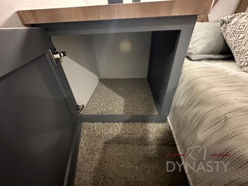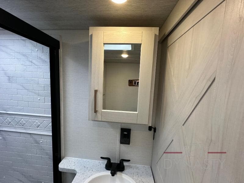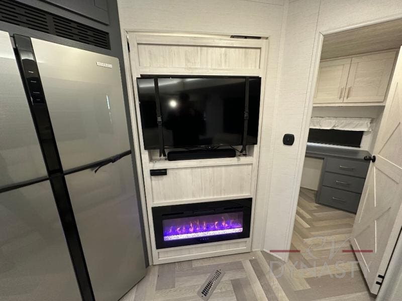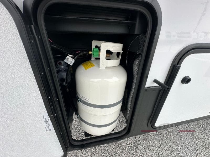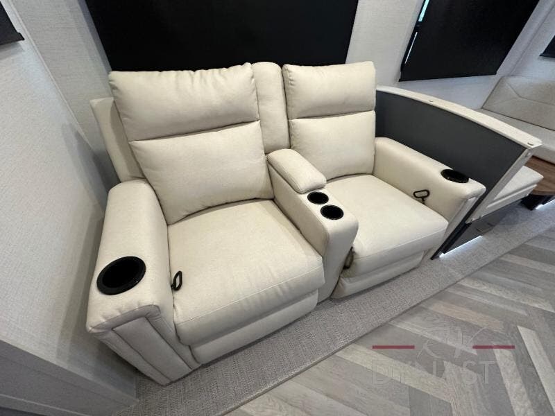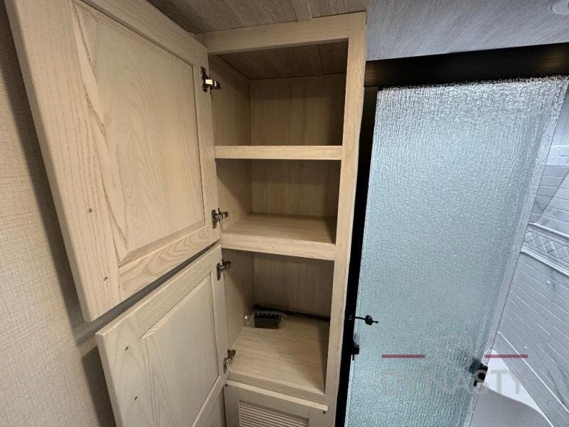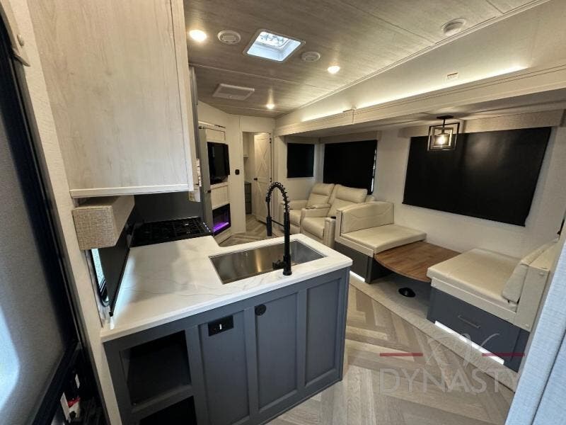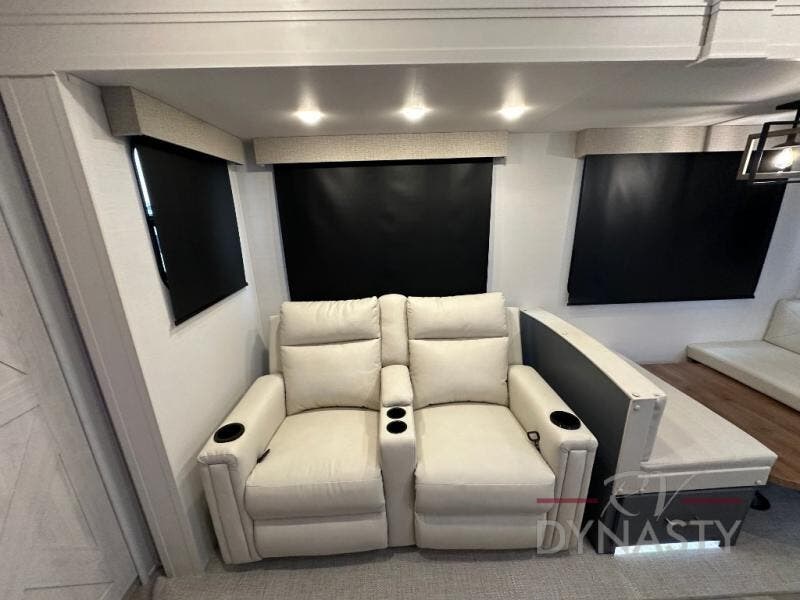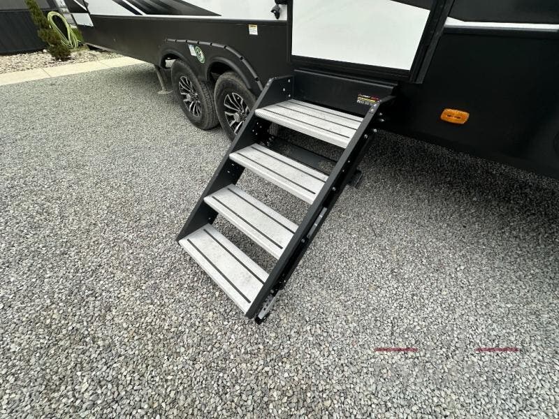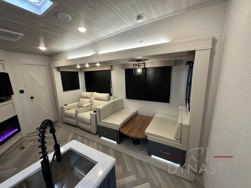 A rear private bunkhouse for your guests and a front private bedroom for you; it's the perfect fifth wheel to camp with a larger group! Four campers can sleep on the double-size bunks, and there is overhead storage plus a desk with drawers below if you need to get some work done. You'll find your own storage in the front private bedroom within the wardrobe slide, plus there are dual nightstands to keep your book, phone, and glasses nearby. Everyone can meet in the combined kitchen and living area in the morning as the cook makes breakfast on the three burner cooktop. You'll find seating spaces on the theater seating or the booth dinette that can be optioned out for a free-standing table with four chairs. Some other stand-out features this model includes are the coat hooks and storage cubbies, the hidden pantry behind the entertainment center, and the outside kitchen!