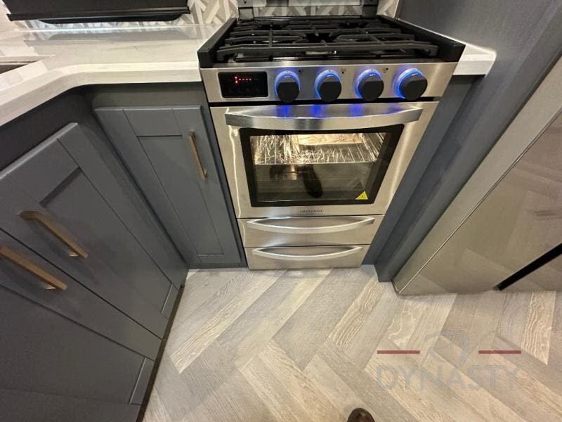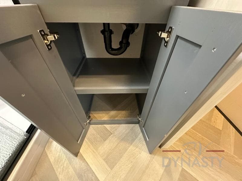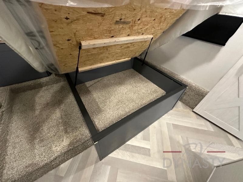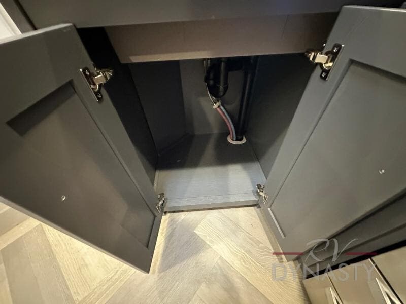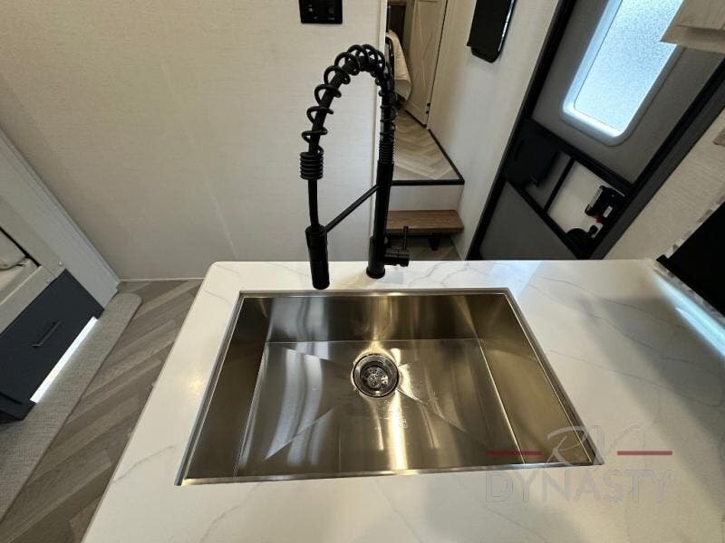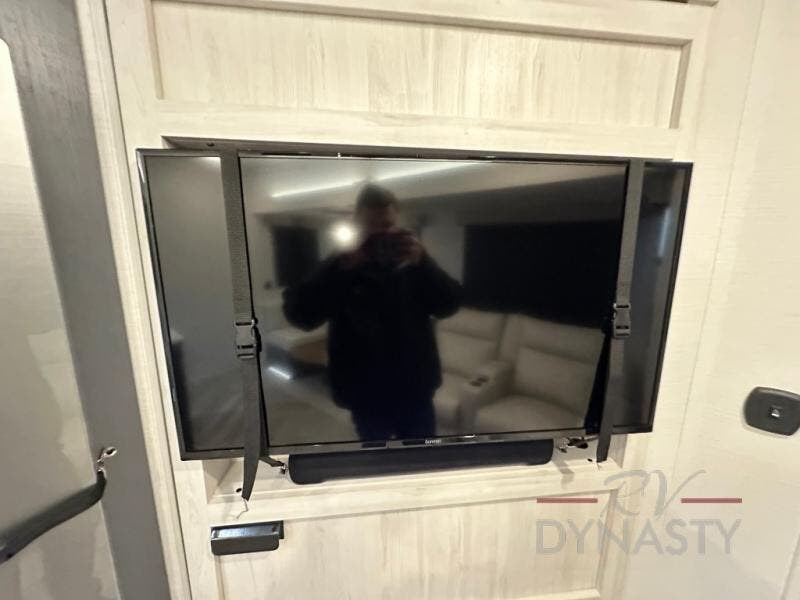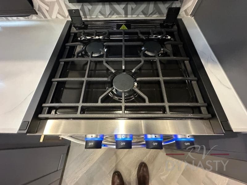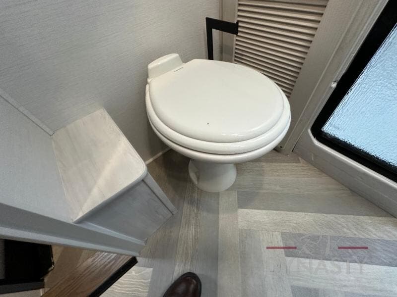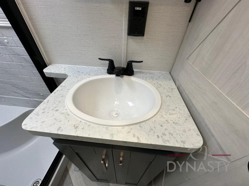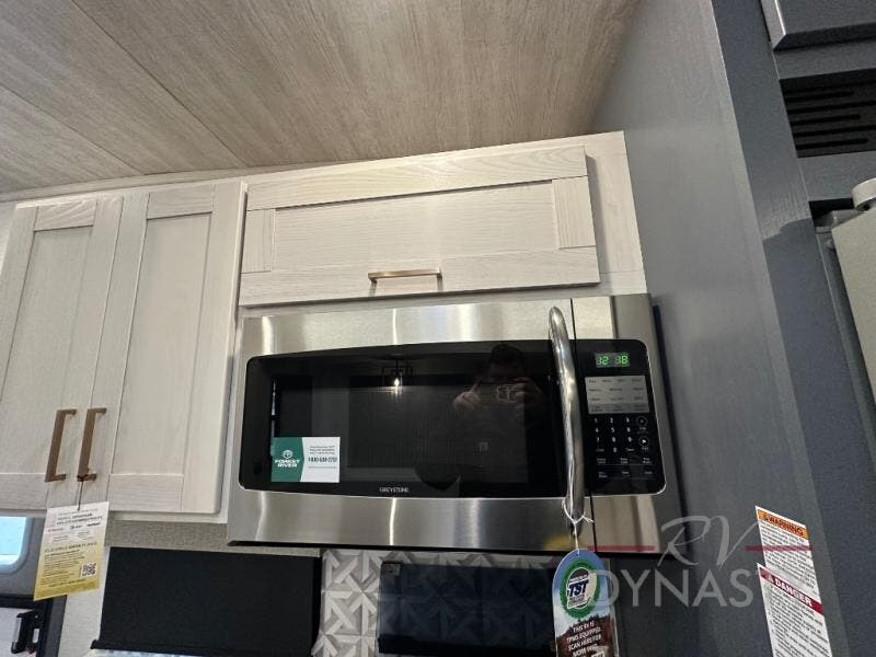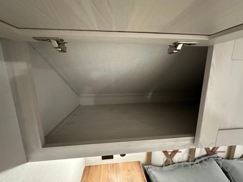 A rear private bunkhouse for your guests and a front private bedroom for you; it's the perfect fifth wheel to camp with a larger group! Four campers can sleep on the double-size bunks, and there is overhead storage plus a desk with drawers below if you need to get some work done. You'll find your own storage in the front private bedroom within the wardrobe slide, plus there are dual nightstands to keep your book, phone, and glasses nearby. Everyone can meet in the combined kitchen and living area in the morning as the cook makes breakfast on the three burner cooktop. You'll find seating spaces on the theater seating or the booth dinette that can be optioned out for a free-standing table with four chairs. Some other stand-out features this model includes are the coat hooks and storage cubbies, the hidden pantry behind the entertainment center, and the outside kitchen!