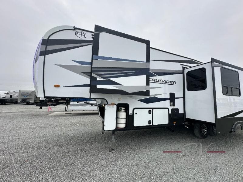 The Crusader fifth wheels by Prime Time RV are a step above the rest and it's not hard to see why. Each model has been constructed to last with its Eternabond construction, a one-piece PVC roof, and high gloss gel coat fiberglass exterior. The auto leveling system and the comprehensive universal docking center will have you set up to camp in no-time, and there is a convenient bottle opener and Doggy D-ring for your furry companions. You will fall in love with the interior that includes heat rated solid surface countertops, designer Carefree linoleum with Scotchgard technology, hardwood cabinet doors, and many more residential comforts. The Crusader also comes standard with dual 15,000 BTU A/C units, a 35,000 BTU high capacity gas furnace, a tankless on-demand water heater, and the Extreme Thermal Package Plus, making your camping season year-around!
