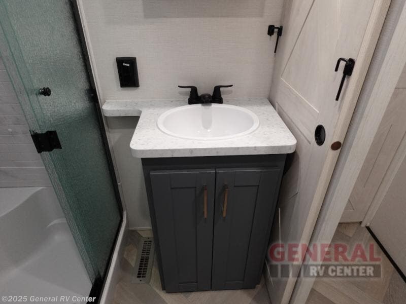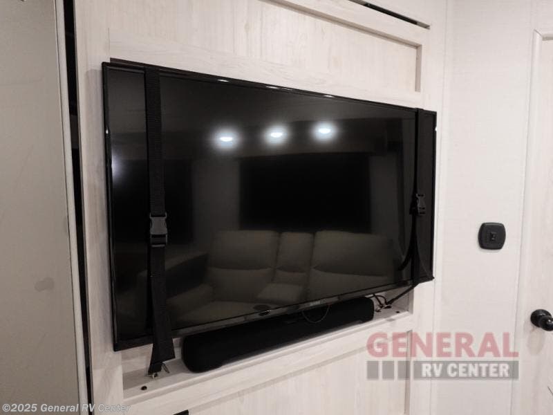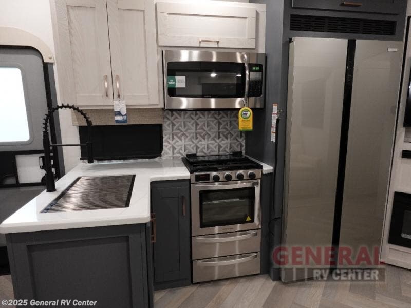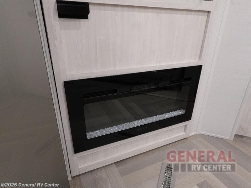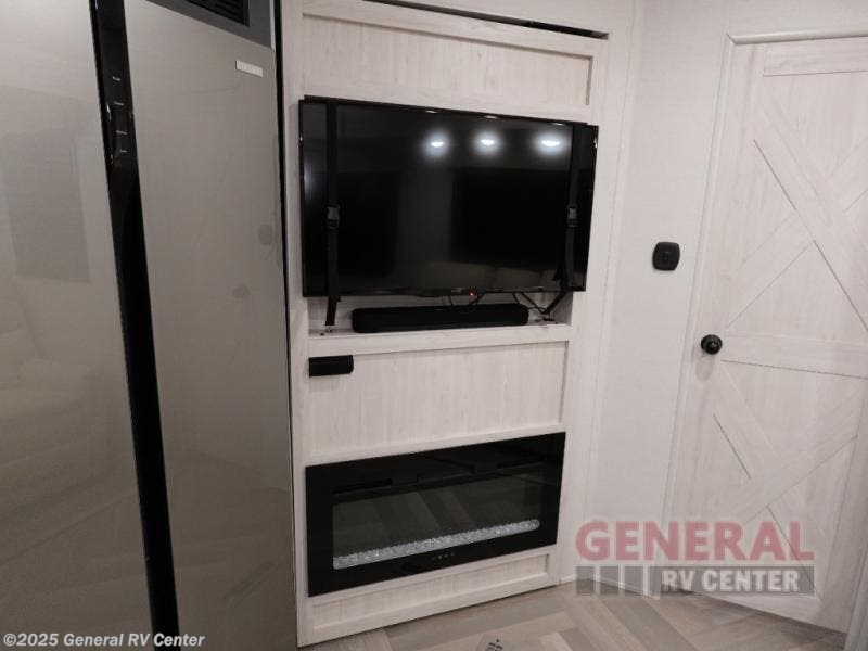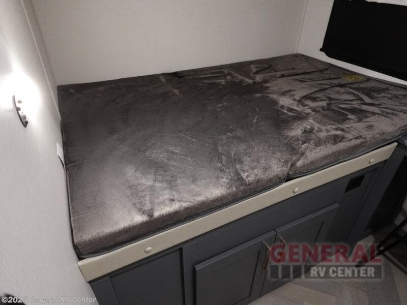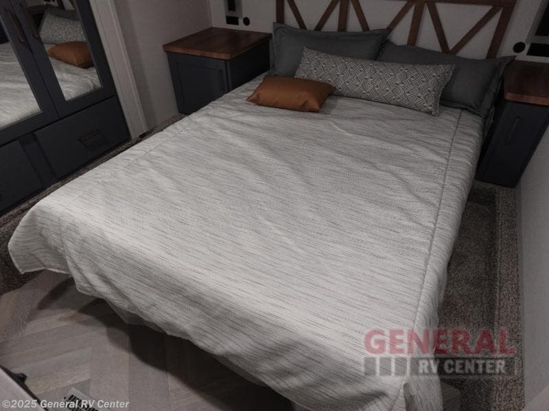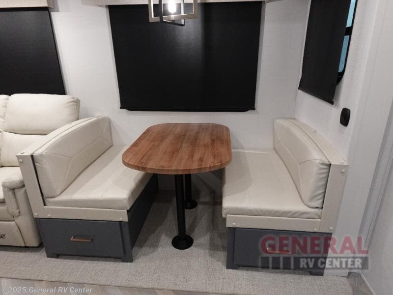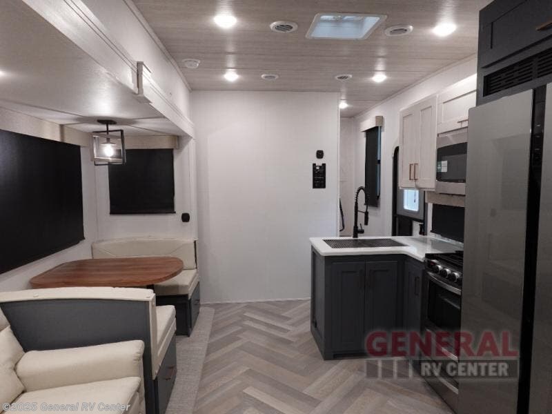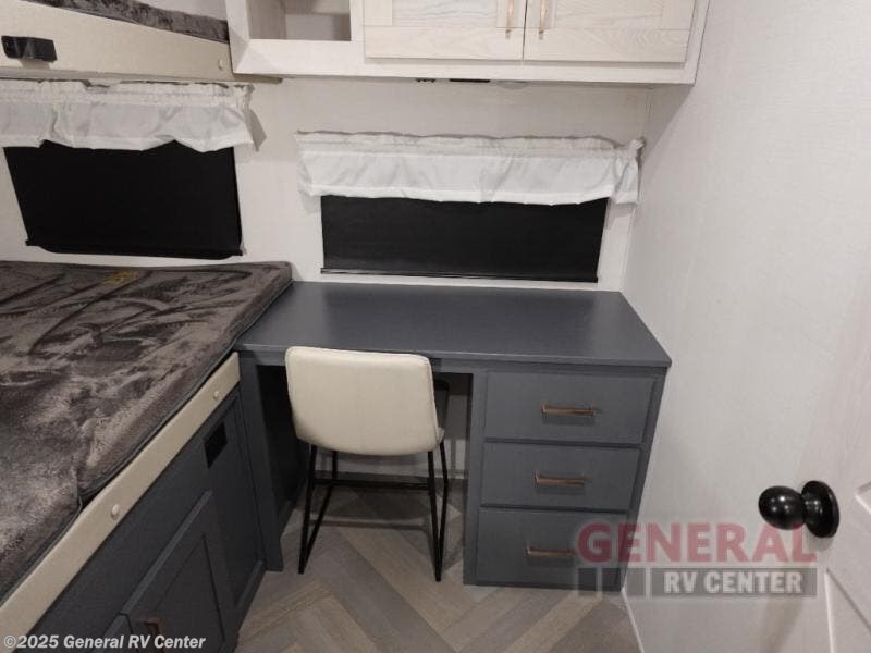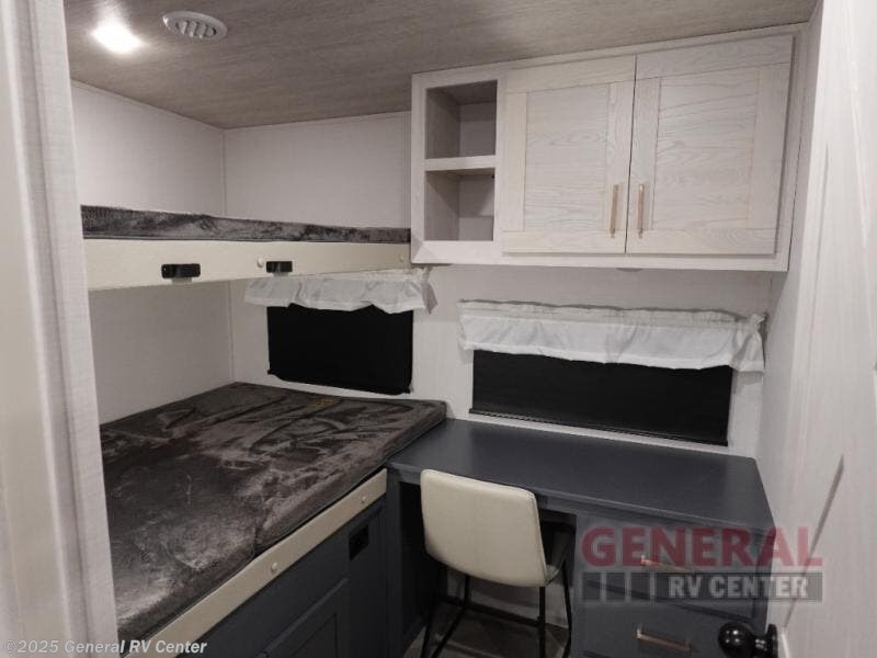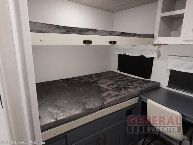 A rear private bunkhouse for your guests and a front private bedroom for you; it's the perfect fifth wheel to camp with a larger group! Four campers can sleep on the double-size bunks, and there is overhead storage plus a desk with drawers below if you need to get some work done. You'll find your own storage in the front private bedroom within the wardrobe slide, plus there are dual nightstands to keep your book, phone, and glasses nearby. Everyone can meet in the combined kitchen and living area in the morning as the cook makes breakfast on the three burner cooktop. You'll find seating spaces on the theater seating or the booth dinette. Some other stand-out features this model includes are the coat hooks and storage cubbies, the hidden pantry behind the entertainment center, and the outside kitchen!