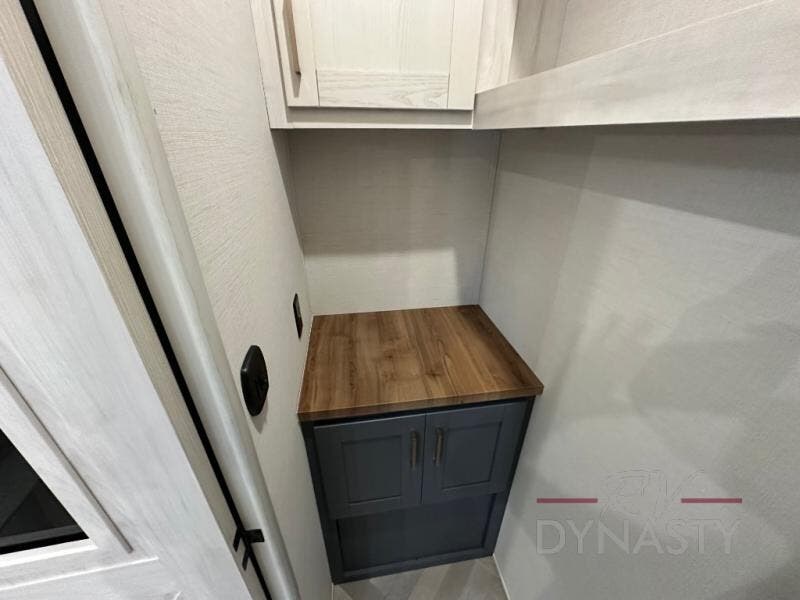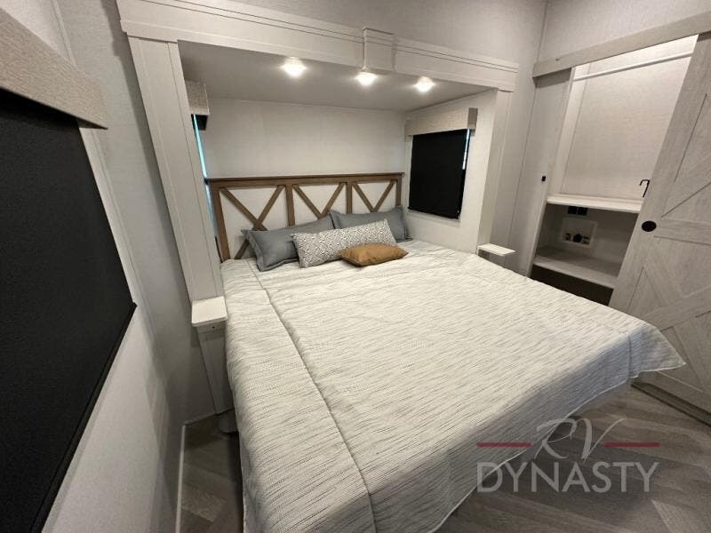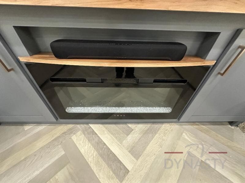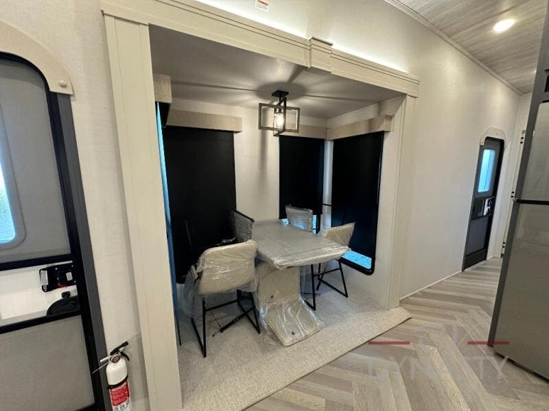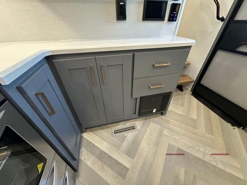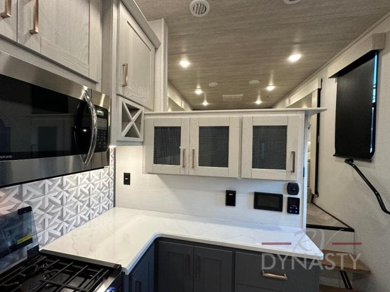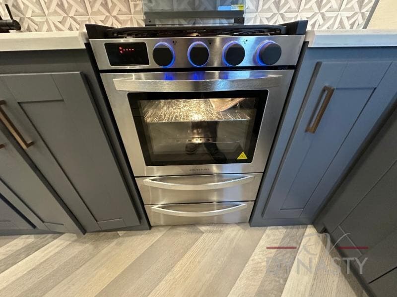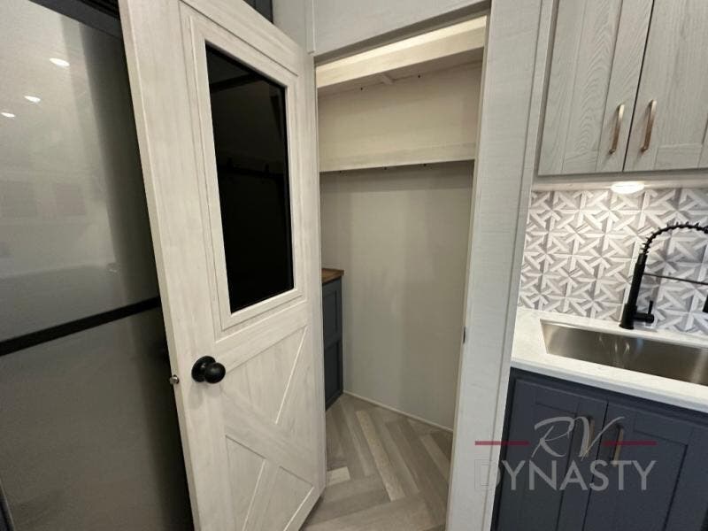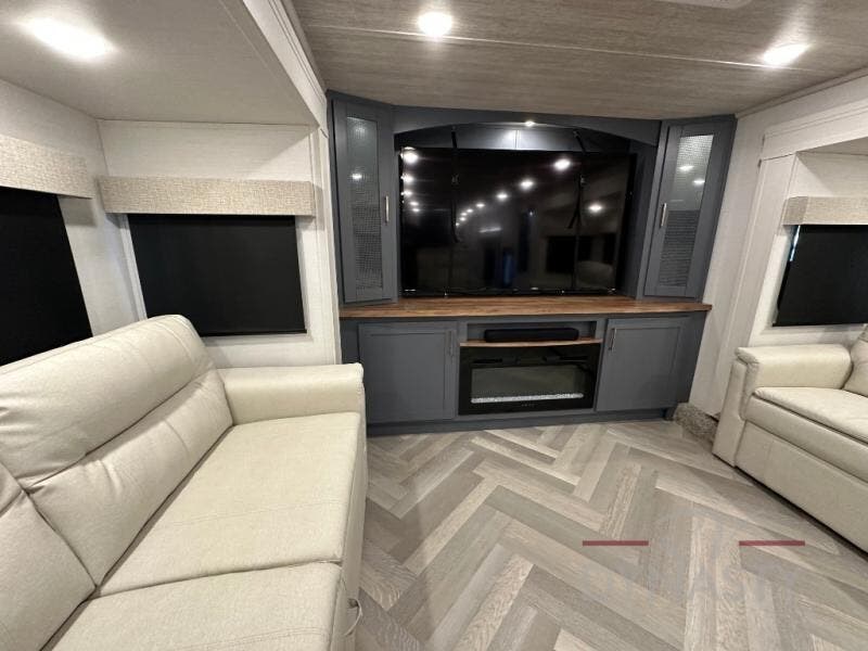 This dual entry fifth wheel is packed with at-home comforts for you and your crew! The front living area includes an entertainment center with a massive 70" LED Smart TV, a cozy fireplace, and two cabinets to keep movies organized. The EZ sofas here within dual opposing slides will make this room open, and the theater seating is right across from the TV for easy viewing. If you have guests staying over, this room will be perfect for them at night! The middle kitchen includes a walk-in pantry, a 21" stainless steel Greystone oven/cooktop, and a 16 cu. ft. French door refrigerator to keep food stocked. The full bath will be waiting for you each day when you come back from exploring, and the rear bedroom with a king bed slide out is sure to make you feel at home. There is also a closet here with washer and dryer prep to make going full-time easier!