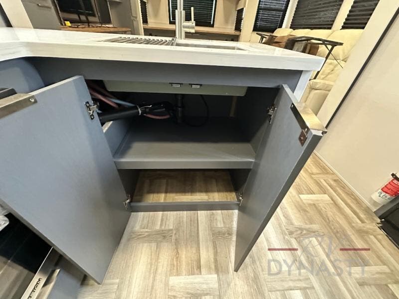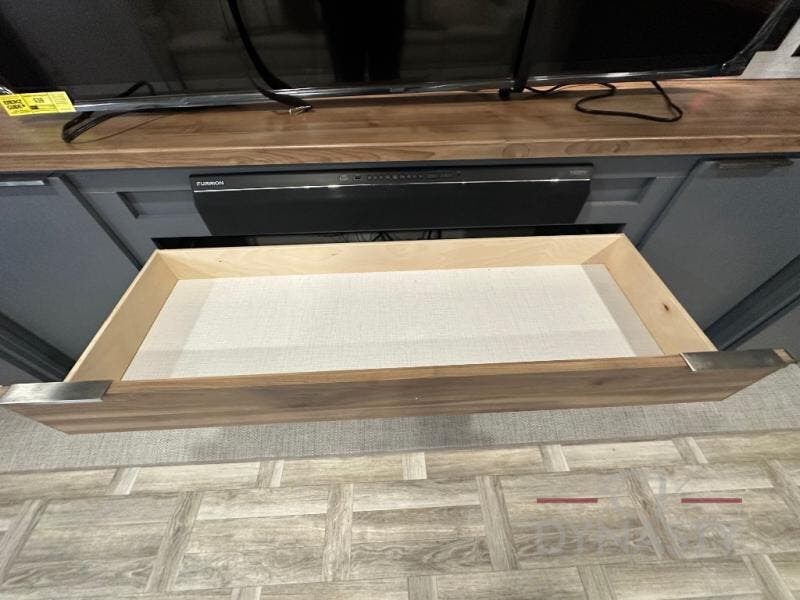 This Lacrosse travel trailer is made for entertaining! The living room is a standout with its unique bar seating at the large front window. This is perfect for eating and drinking, or use it as desk space to work from the road. The sofa sits in its own slide out for extra comfort, and has a great view of the enormous entertainment center with fireplace and 70" TV. A second fireplace warms up the rear bedroom, which also features a king bed slide for maximum floor space. There's a full bath, a well-equipped kitchen, and plenty of storage space. Invite your friends along for a great time!