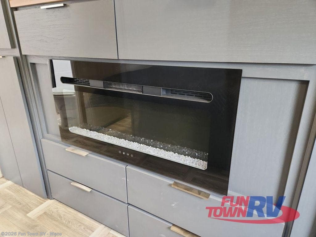 This Lacrosse travel trailer is made for entertaining! The living room is a standout with its unique bar seating at the large front window. This is perfect for eating and drinking, or use it as desk space to work from the road. The sofa sits in its own slide out for extra comfort, and has a great view of the enormous entertainment center with fireplace and 70" TV. A second fireplace warms up the rear bedroom, which also features a king bed slide for maximum floor space. There's a full bath, a well-equipped kitchen, and plenty of storage space. Invite your friends along for a great time!