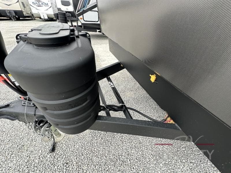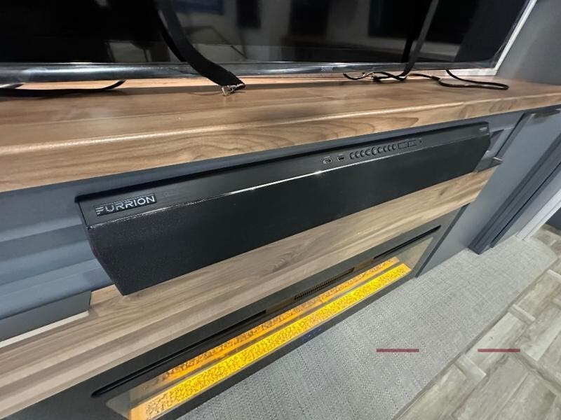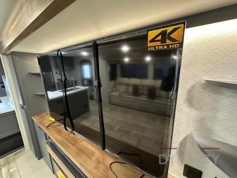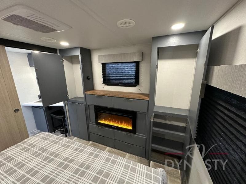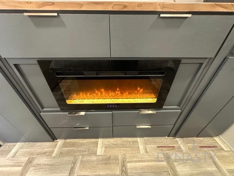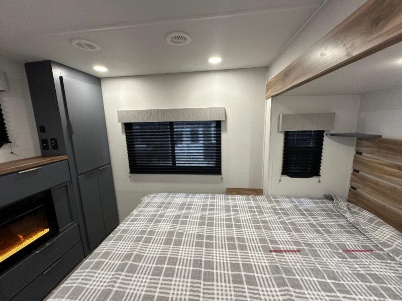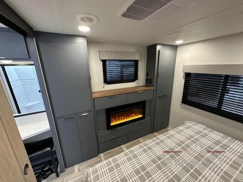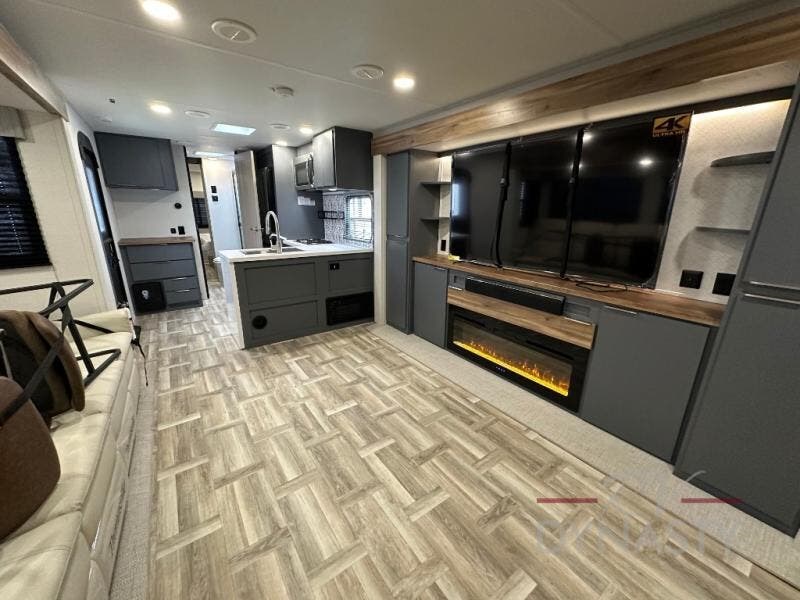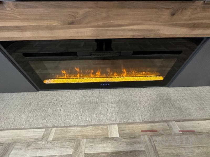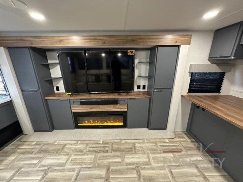 This Lacrosse travel trailer is made for entertaining! The living room is a standout with its unique bar seating at the large front window. This is perfect for eating and drinking, or use it as desk space to work from the road. The sofa sits in its own slide out for extra comfort, and has a great view of the enormous entertainment center with fireplace and 70" TV. A second fireplace warms up the rear bedroom, which also features a king bed slide for maximum floor space. There's a full bath, a well-equipped kitchen, and plenty of storage space. Invite your friends along for a great time!