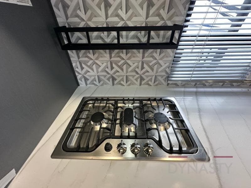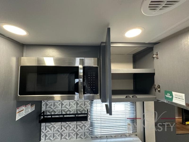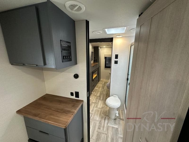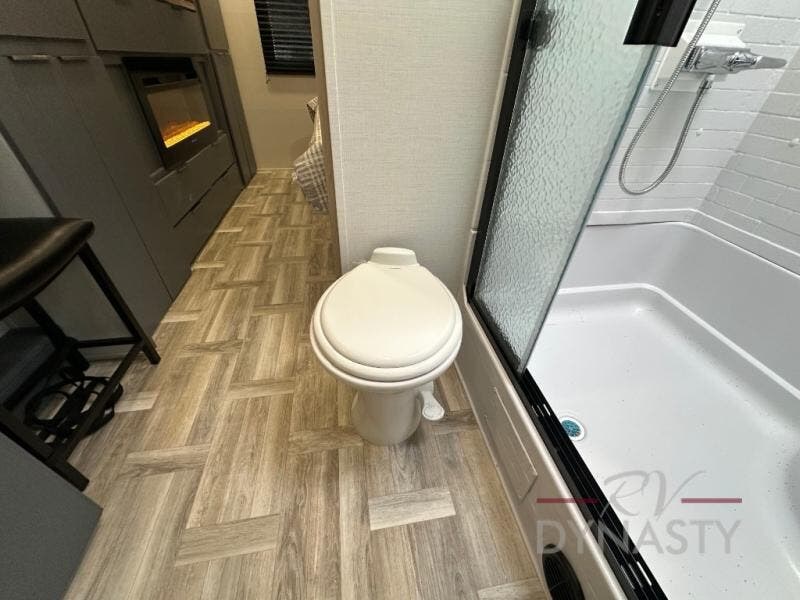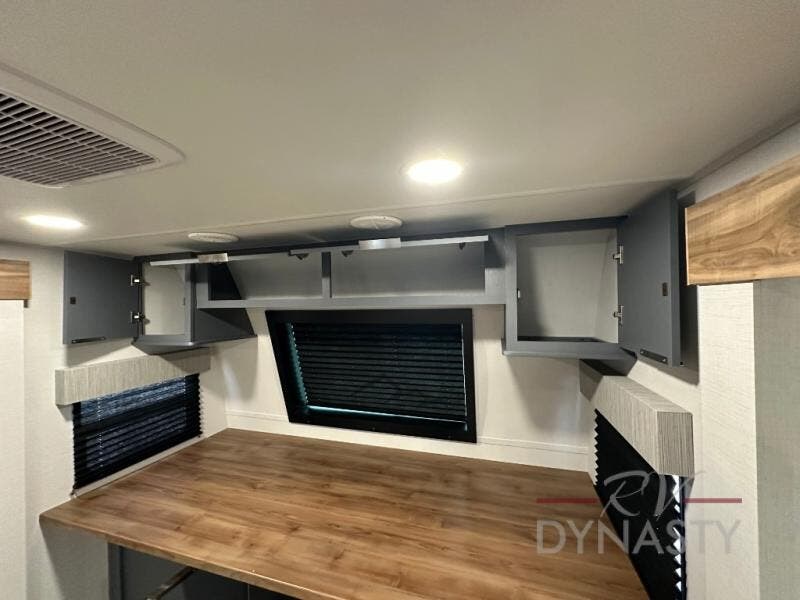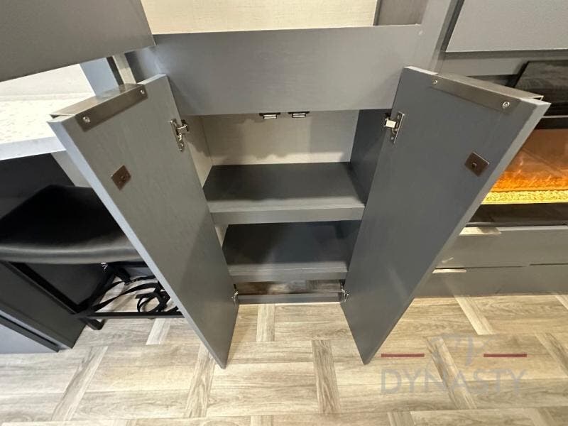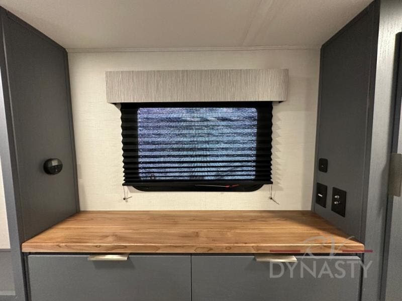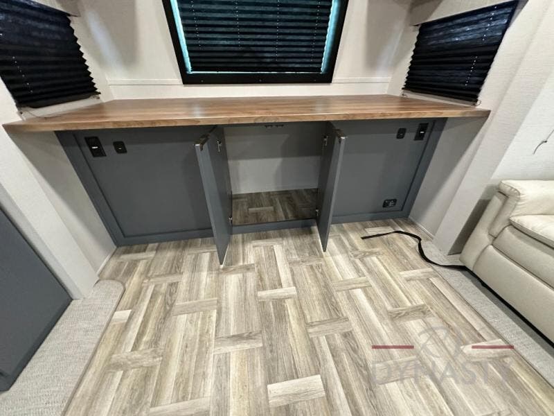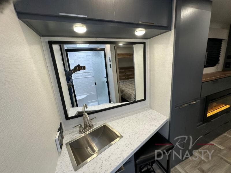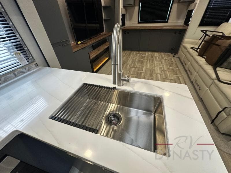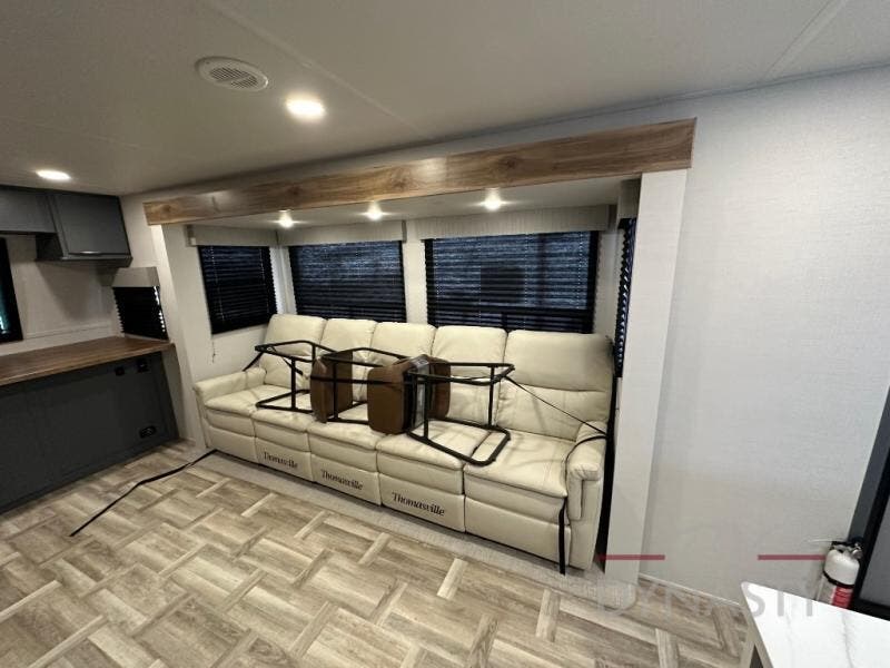 This Lacrosse travel trailer is made for entertaining! The living room is a standout with its unique bar seating at the large front window. This is perfect for eating and drinking, or use it as desk space to work from the road. The sofa sits in its own slide out for extra comfort, and has a great view of the enormous entertainment center with fireplace and 70" TV. A second fireplace warms up the rear bedroom, which also features a king bed slide for maximum floor space. There's a full bath, a well-equipped kitchen, and plenty of storage space. Invite your friends along for a great time!