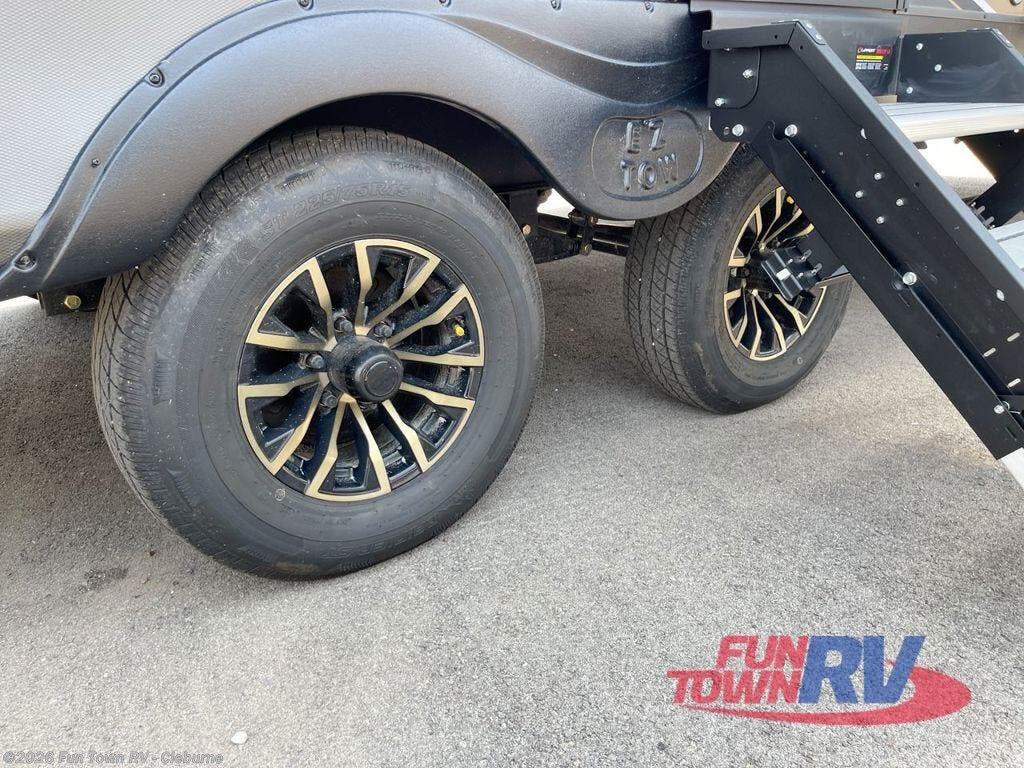 This Lacrosse travel trailer is made for entertaining! The living room is a standout with its unique bar seating at the large front window. This is perfect for eating and drinking, or use it as desk space to work from the road. The sofa sits in its own slide out for extra comfort, and has a great view of the enormous entertainment center with fireplace and 70" TV. A second fireplace warms up the rear bedroom, which also features a king bed slide for maximum floor space. There's a full bath, a well-equipped kitchen, and plenty of storage space. Invite your friends along for a great time!