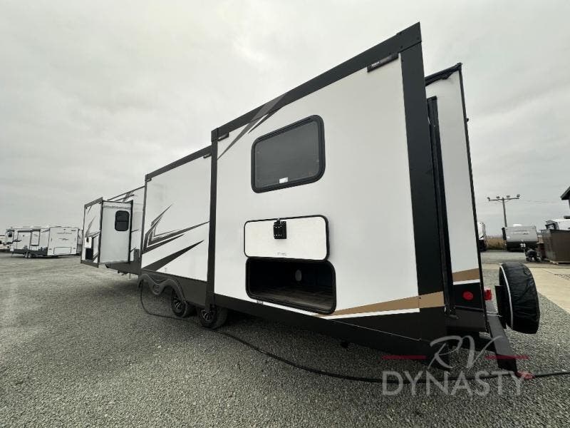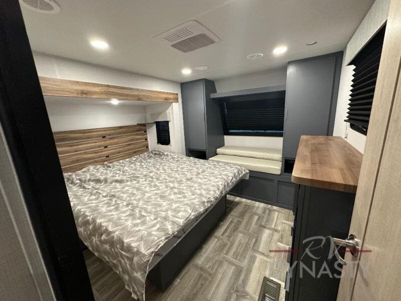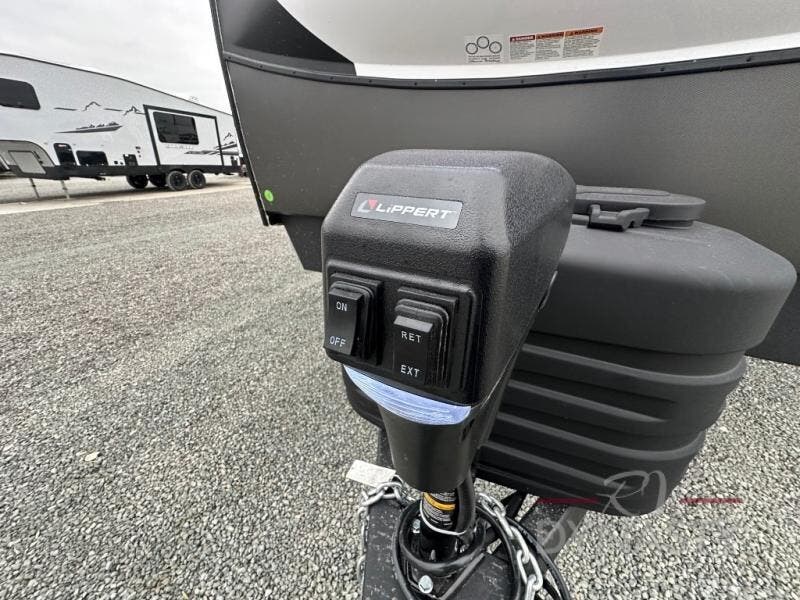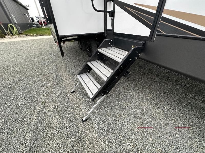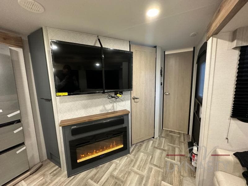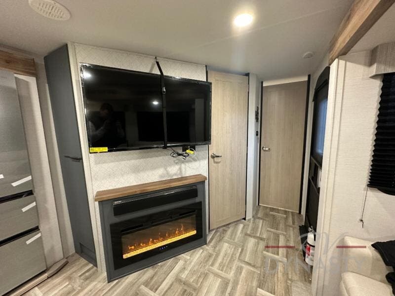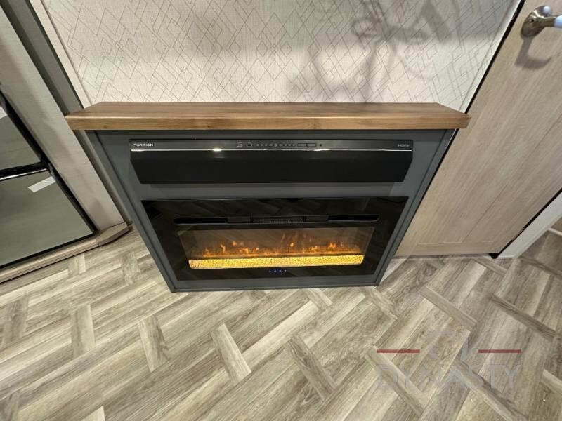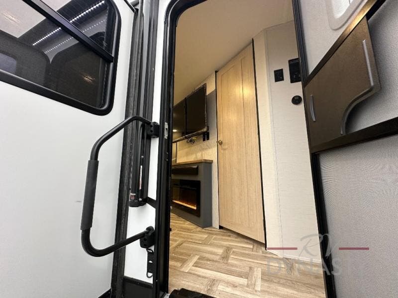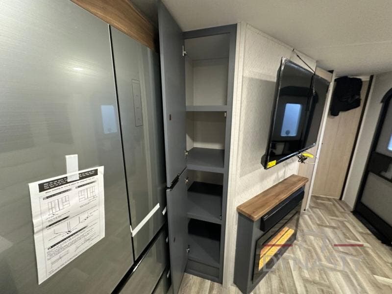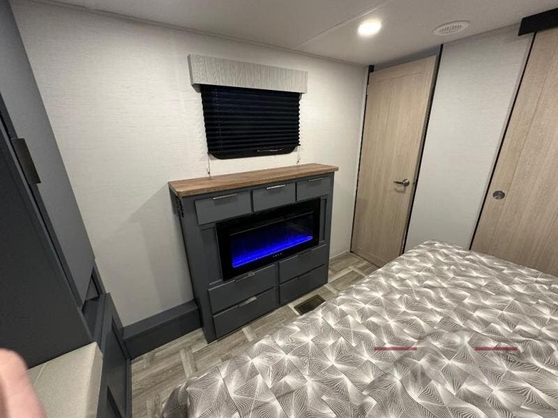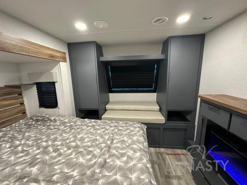 Privacy abounds in this travel trailer with a bedroom at each end! A king bed slide in the front has its own fireplace for cozy nights. Dual wardrobes frame the reading bench which looks out the front window for peaceful moments appreciating the view. At the rear, a second bedroom with queen bed has its own half bath. A pantry closet here also had prep for an optional washer/dryer for convenience on the road. In the center everyone can meet up in the spacious kitchen/living room. A hide-a-bed sofa has even more sleeping space, or relax there and watch the TV which is in the entertainment center along with another fireplace. The kitchen is well-equipped with a three-burner cooktop, microwave, and even an island where the sink is located for easy meal prep. Outside there are not one but two 10' power awnings for extra protection from the elements!
