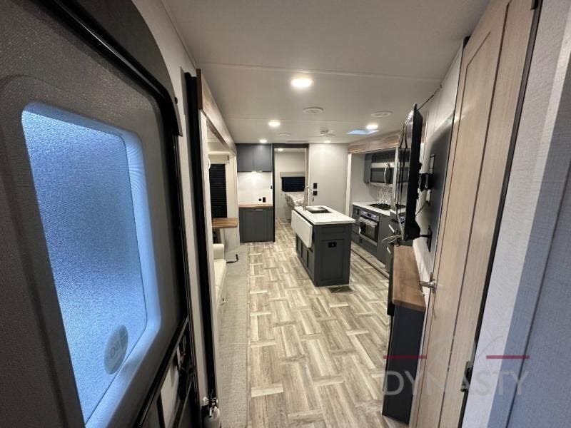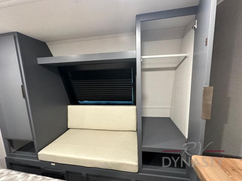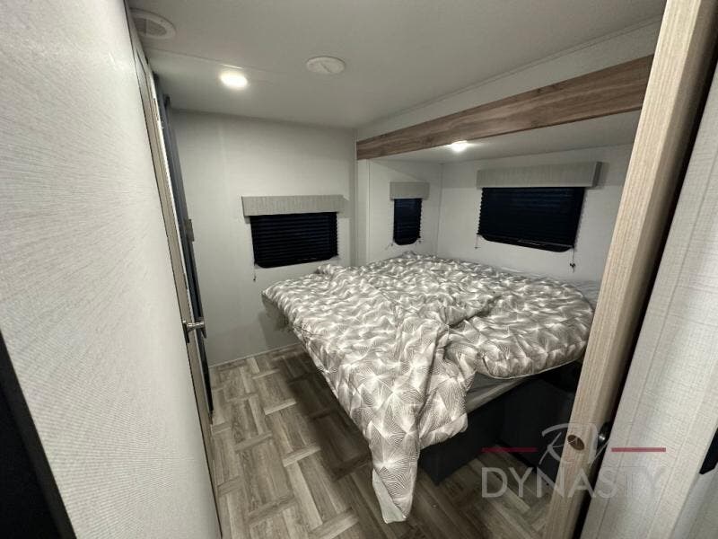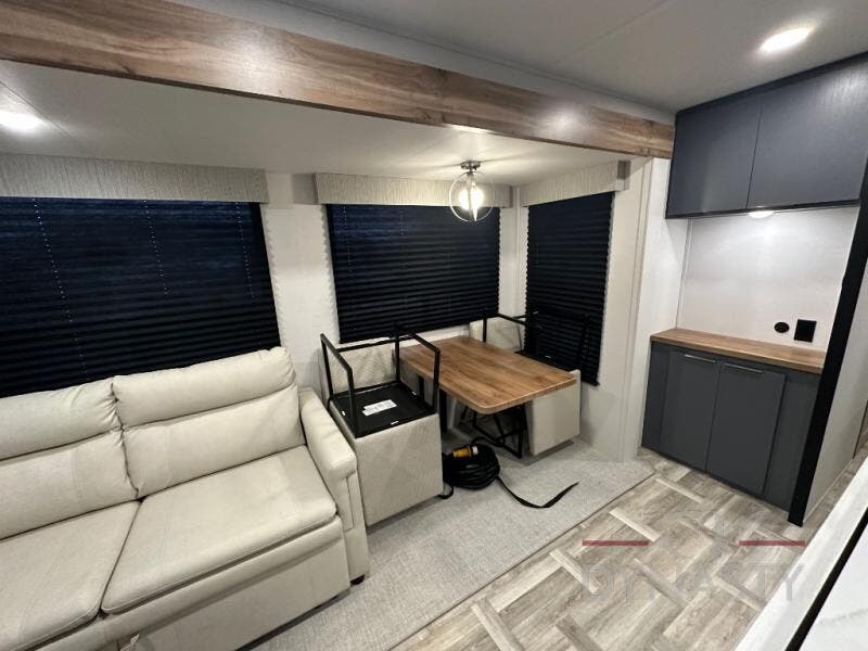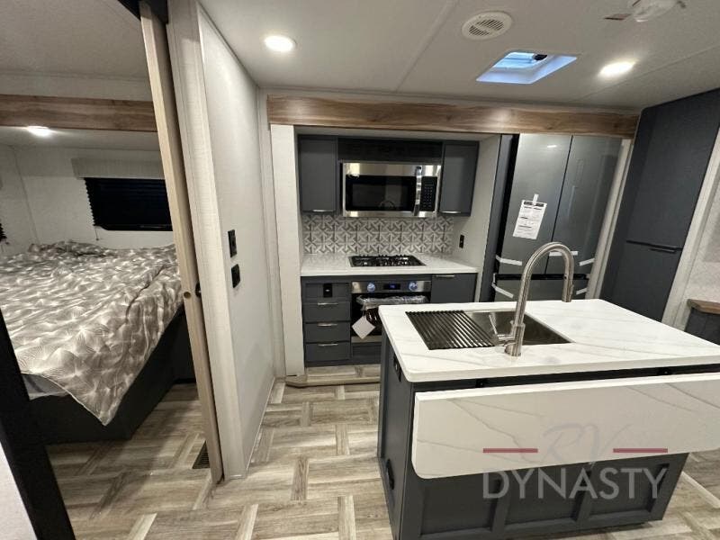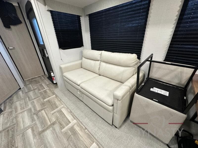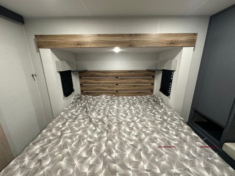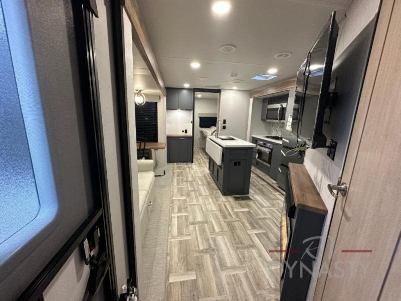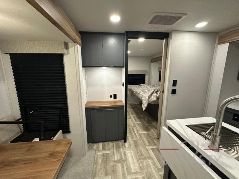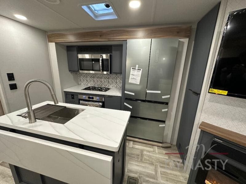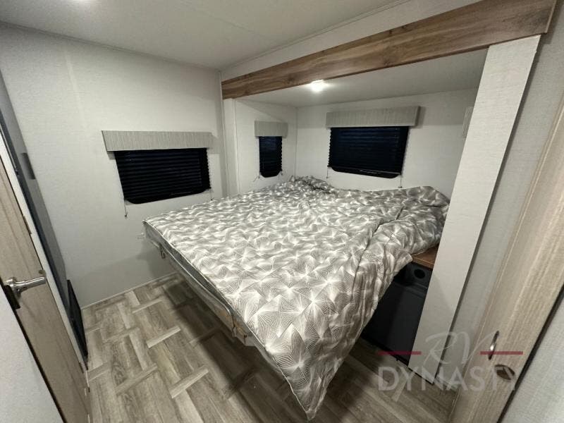 Privacy abounds in this travel trailer with a bedroom at each end! A king bed slide in the front has its own fireplace for cozy nights. Dual wardrobes frame the reading bench which looks out the front window for peaceful moments appreciating the view. At the rear, a second bedroom with queen bed has its own half bath. A pantry closet here also had prep for an optional washer/dryer for convenience on the road. In the center everyone can meet up in the spacious kitchen/living room. A hide-a-bed sofa has even more sleeping space, or relax there and watch the TV which is in the entertainment center along with another fireplace. The kitchen is well-equipped with a three-burner cooktop, microwave, and even an island where the sink is located for easy meal prep. Outside there are not one but two 10' power awnings for extra protection from the elements!