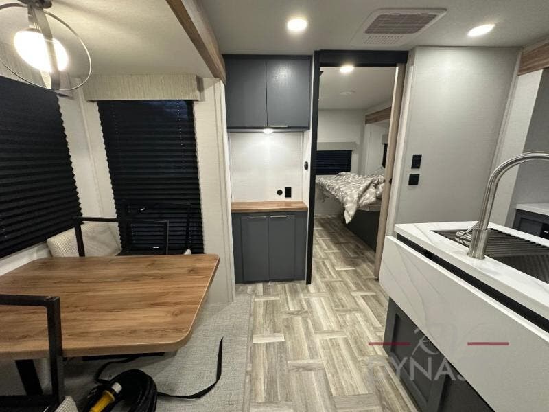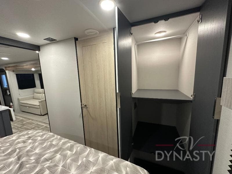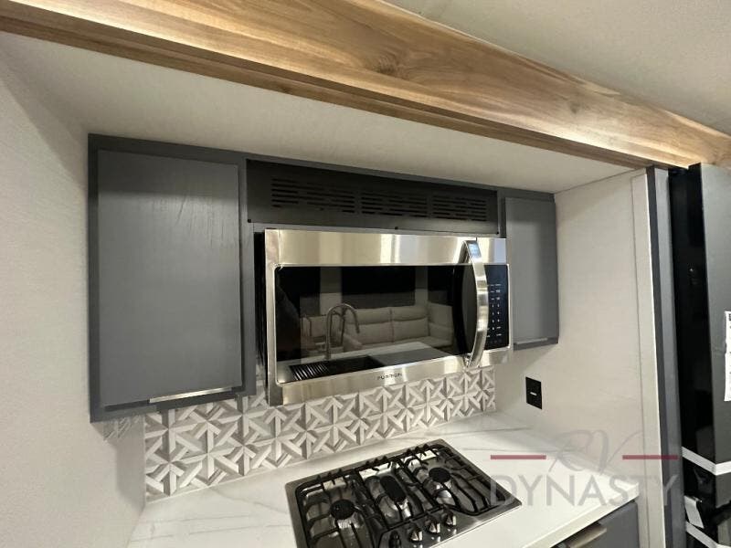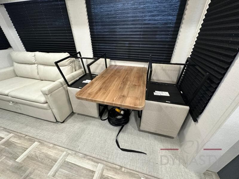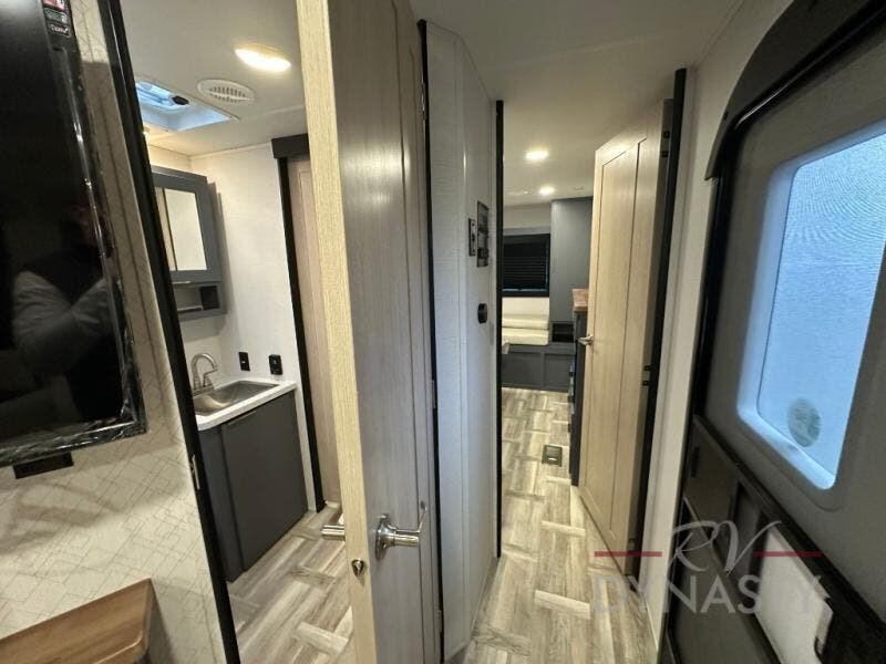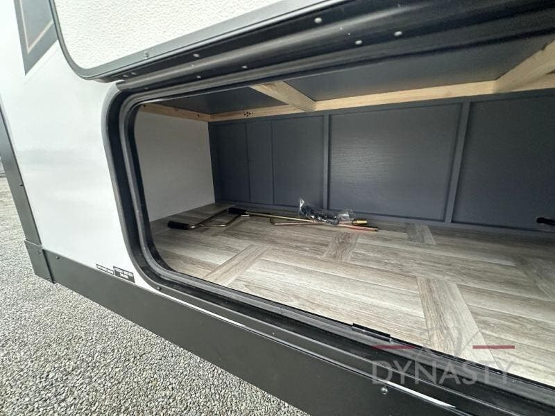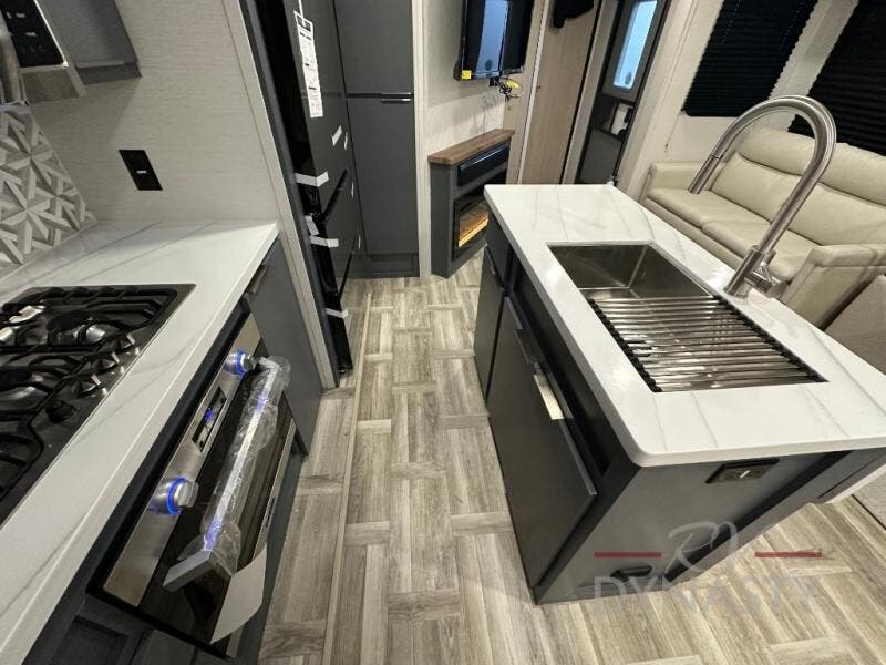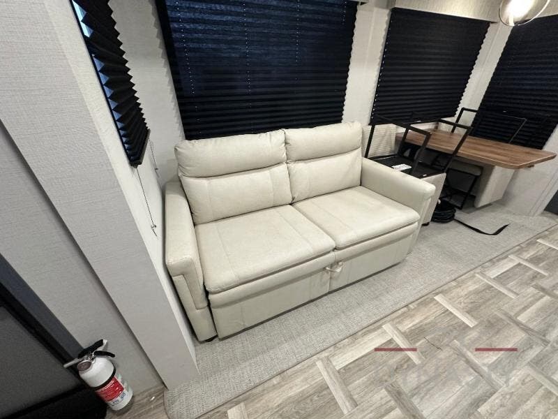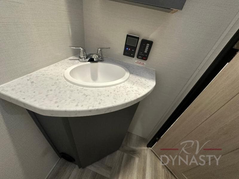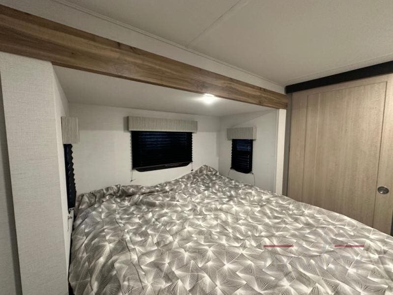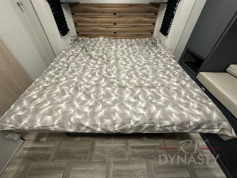 Privacy abounds in this travel trailer with a bedroom at each end! A king bed slide in the front has its own fireplace for cozy nights. Dual wardrobes frame the reading bench which looks out the front window for peaceful moments appreciating the view. At the rear, a second bedroom with queen bed has its own half bath. A pantry closet here also had prep for an optional washer/dryer for convenience on the road. In the center everyone can meet up in the spacious kitchen/living room. A hide-a-bed sofa has even more sleeping space, or relax there and watch the TV which is in the entertainment center along with another fireplace. The kitchen is well-equipped with a three-burner cooktop, microwave, and even an island where the sink is located for easy meal prep. Outside there are not one but two 10' power awnings for extra protection from the elements!