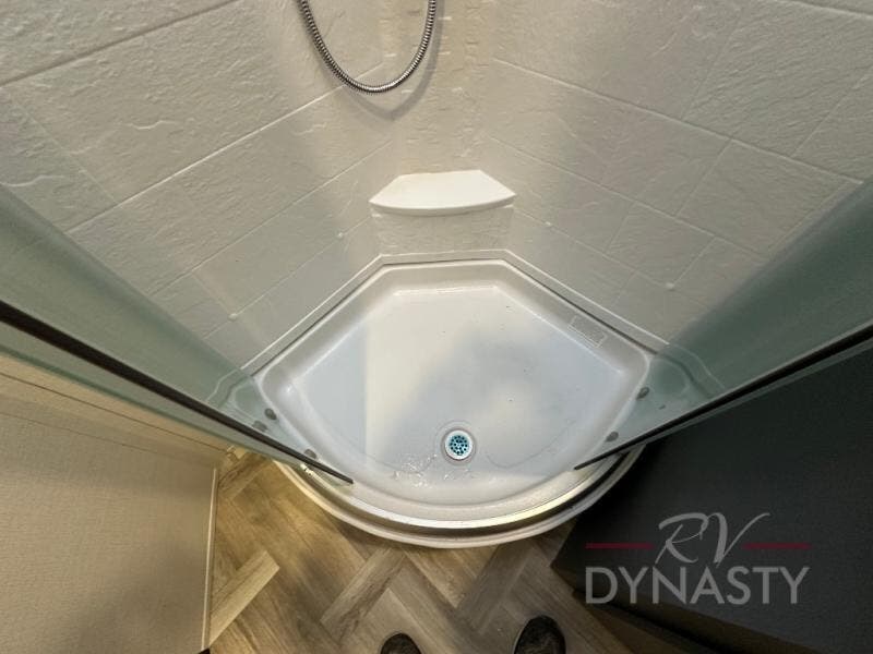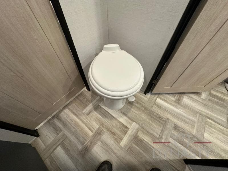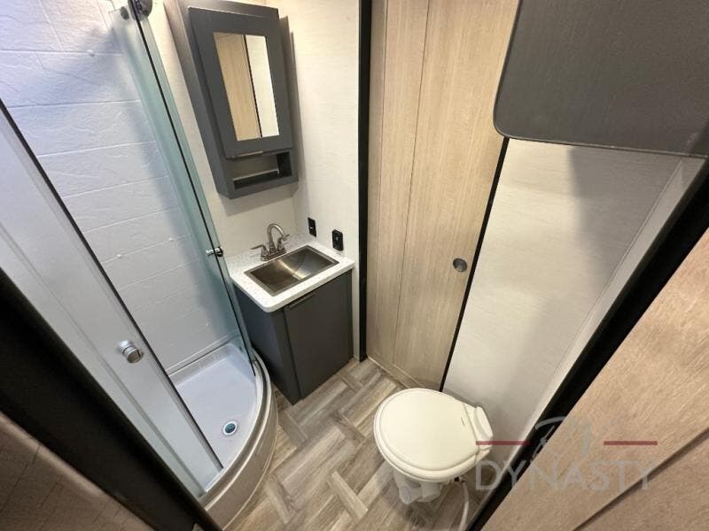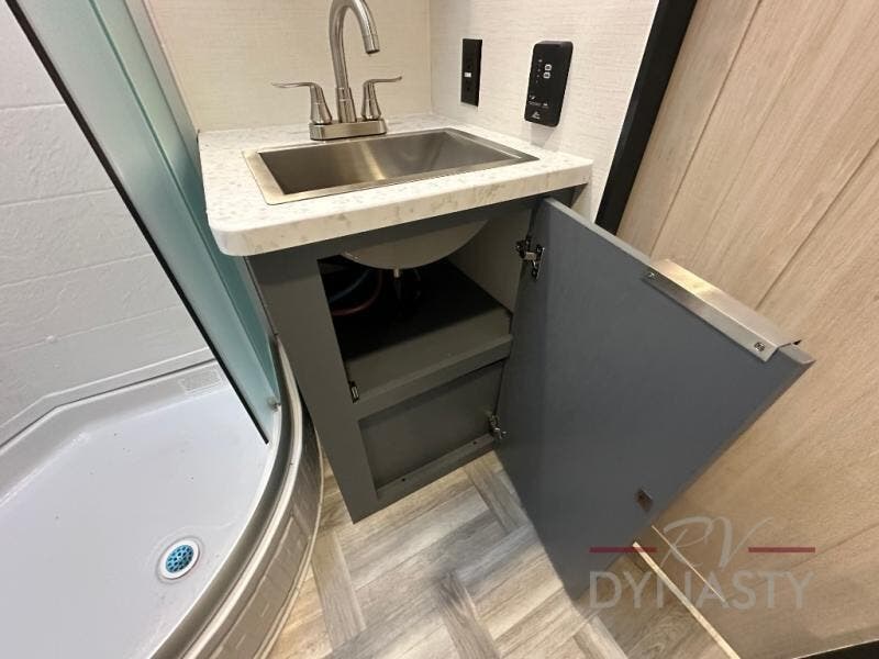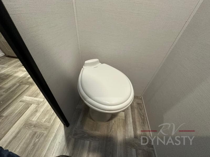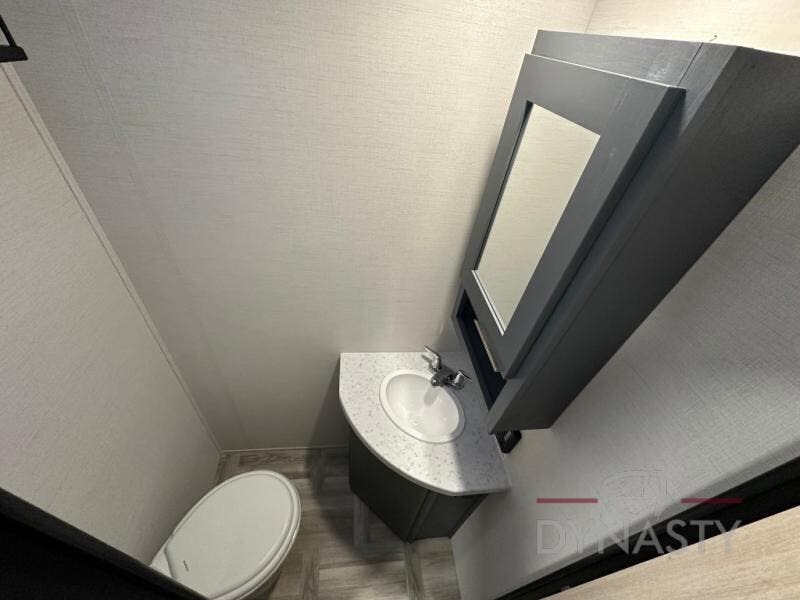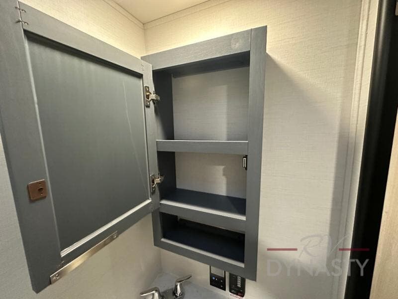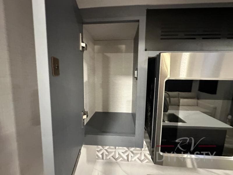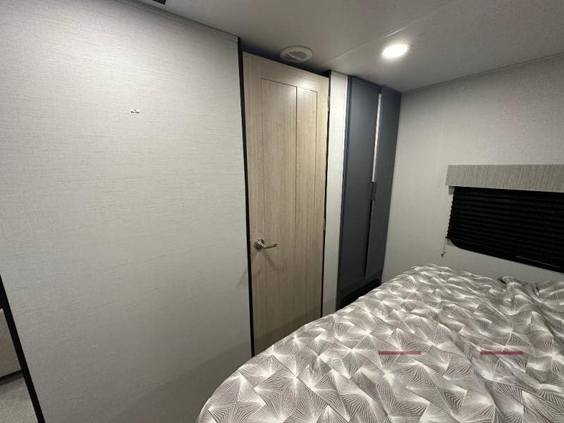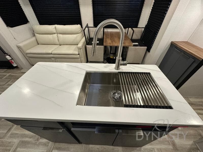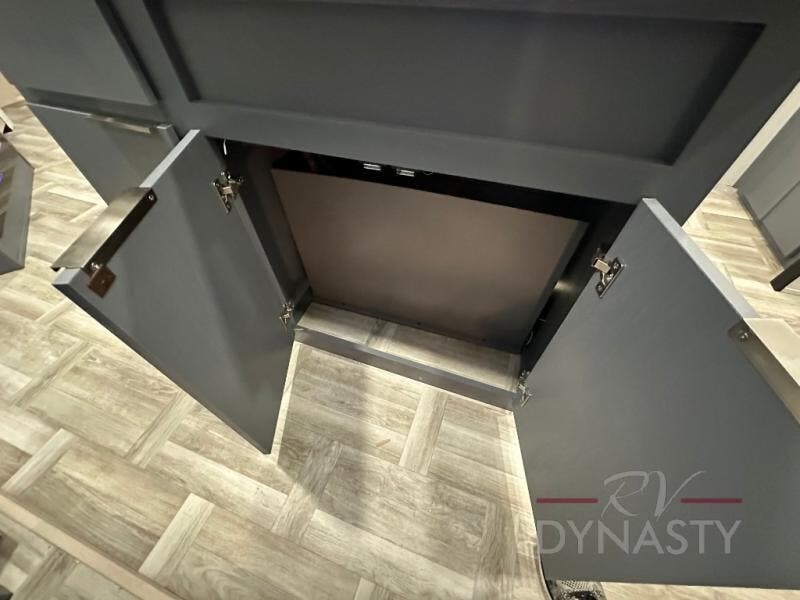Privacy abounds in this travel trailer with a bedroom at each end! A king bed slide in the front has its own fireplace for cozy nights. Dual wardrobes frame the reading bench which looks out the front window for peaceful moments appreciating the view. At the rear, a second bedroom with queen bed has its own half bath. A pantry closet here also had prep for an optional washer/dryer for convenience on the road. In the center everyone can meet up in the spacious kitchen/living room. A hide-a-bed sofa has even more sleeping space, or relax there and watch the TV which is in the entertainment center along with another fireplace. The kitchen is well-equipped with a three-burner cooktop, microwave, and even an island where the sink is located for easy meal prep. Outside there are not one but two 10' power awnings for extra protection from the elements!