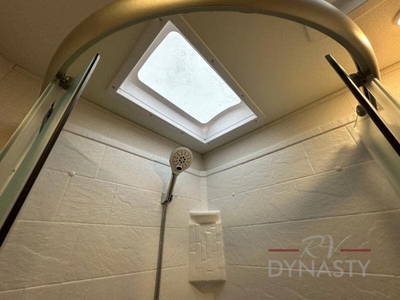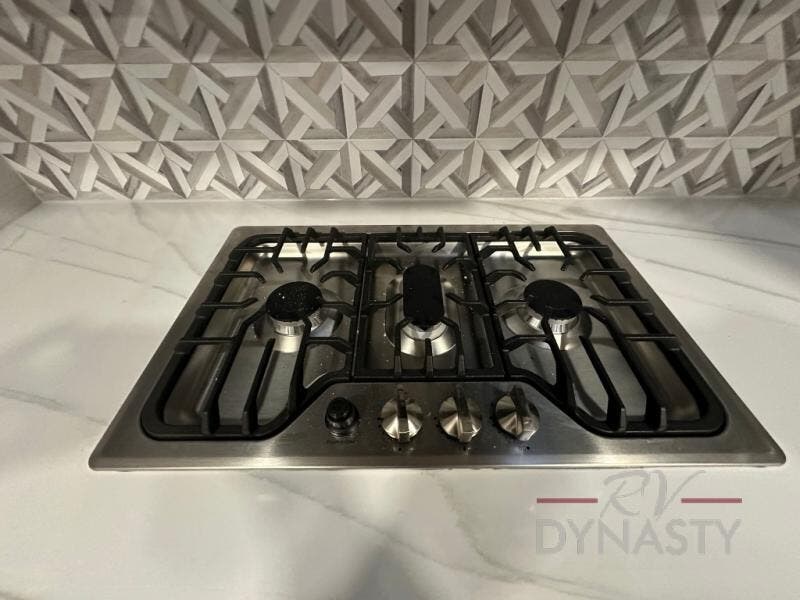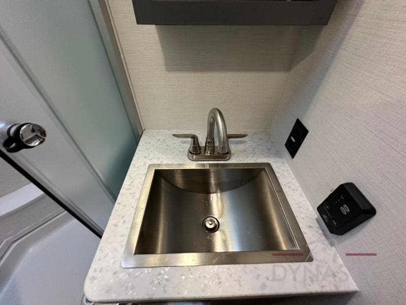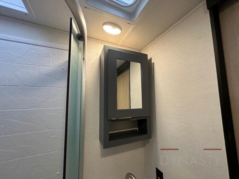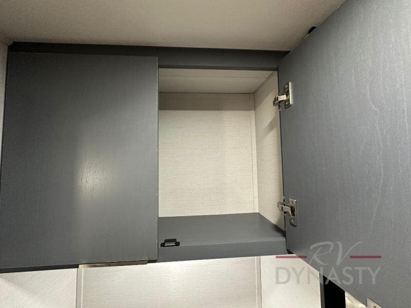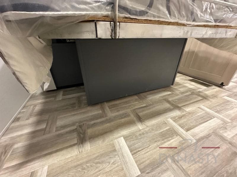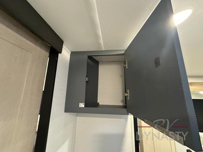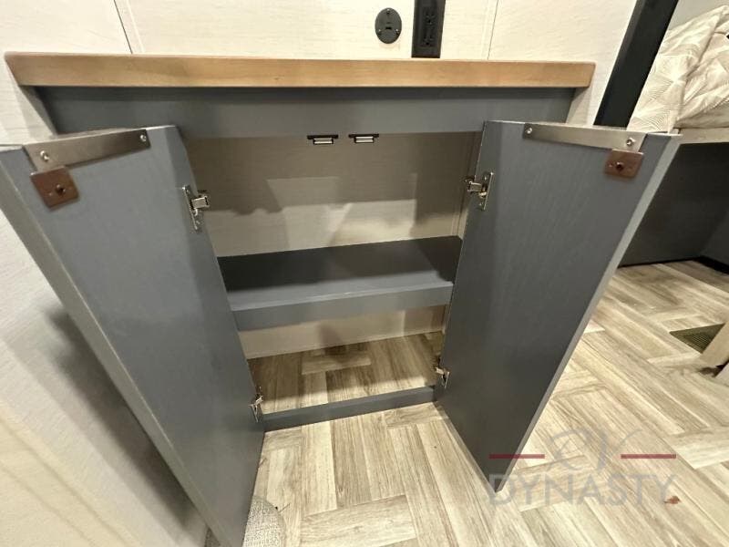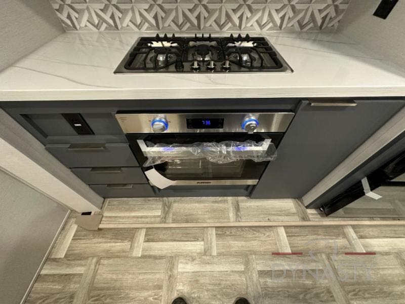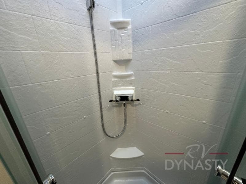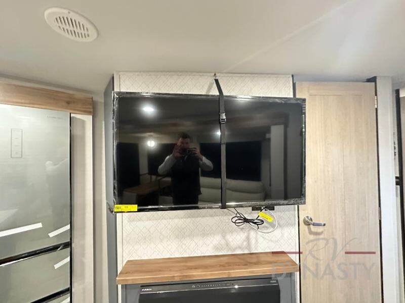 Privacy abounds in this travel trailer with a bedroom at each end! A king bed slide in the front has its own fireplace for cozy nights. Dual wardrobes frame the reading bench which looks out the front window for peaceful moments appreciating the view. At the rear, a second bedroom with queen bed has its own half bath. A pantry closet here also had prep for an optional washer/dryer for convenience on the road. In the center everyone can meet up in the spacious kitchen/living room. A hide-a-bed sofa has even more sleeping space, or relax there and watch the TV which is in the entertainment center along with another fireplace. The kitchen is well-equipped with a three-burner cooktop, microwave, and even an island where the sink is located for easy meal prep. Outside there are not one but two 10' power awnings for extra protection from the elements!