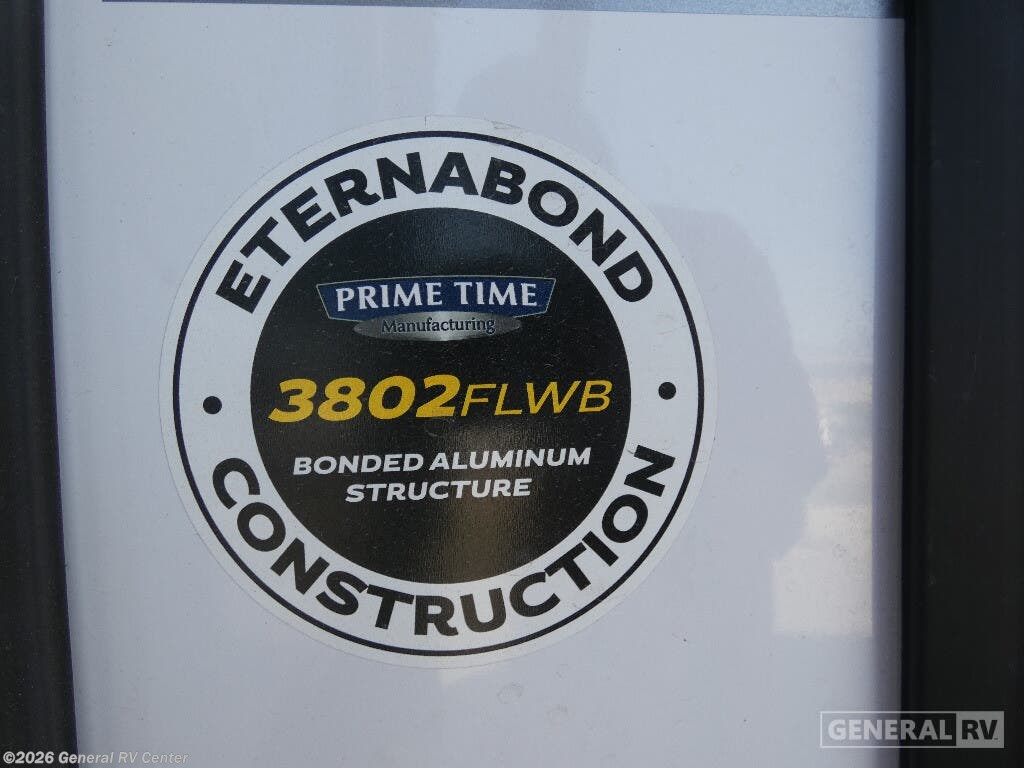 Prime Time Sanibel fifth wheel 3802FLWB highlights: Bath and a Half Legless Dinette King Bed Slide Counter Peninsula Front Living Area It's a clean decision with a bath and a half to take this fifth wheel on your next adventure! The front living area includes opposing EZ glide couches, 65" theater seating, and a front entertainment with a Smart LED pop up TV and fireplace for a cozy evening indoors. Prepare meals on the four burner cooktop, and leftovers can go in the 16 cu. ft. French door 12V refrigerator. You and your spouse will love the master suite that includes a king bed slide, plenty of storage space, and an entrance into the full rear bathroom with a dual sink vanity. There is even a linen closet with washer and dryer prep if you want to add those appliances! More luxury and more value is what you will find in each one of these Prime Time RV Sanibel fifth wheels! The Extreme Thermal package allows you to extend your camping season by including high density block foam insulation throughout, heated basement storage, and 12V heating pads on tanks. You can keep the party going with the electric awning with LED lighting and high-output exterior speaker, plus there is a Doggy D-Ring and bottle opener for added convenience. Each model also includes Dexter E-Z FLEX rubberized suspension to provide smooth towing on tougher roads, thick insulated pass-through baggage doors, and a high gloss gel coated exterior fiberglass for a more sleek look. Inside, you will enjoy residentially inspired kitchen appliances, real wood cabinet doors, designer Carefree linoleum with Scotchgard Technology, and many more luxurious features!