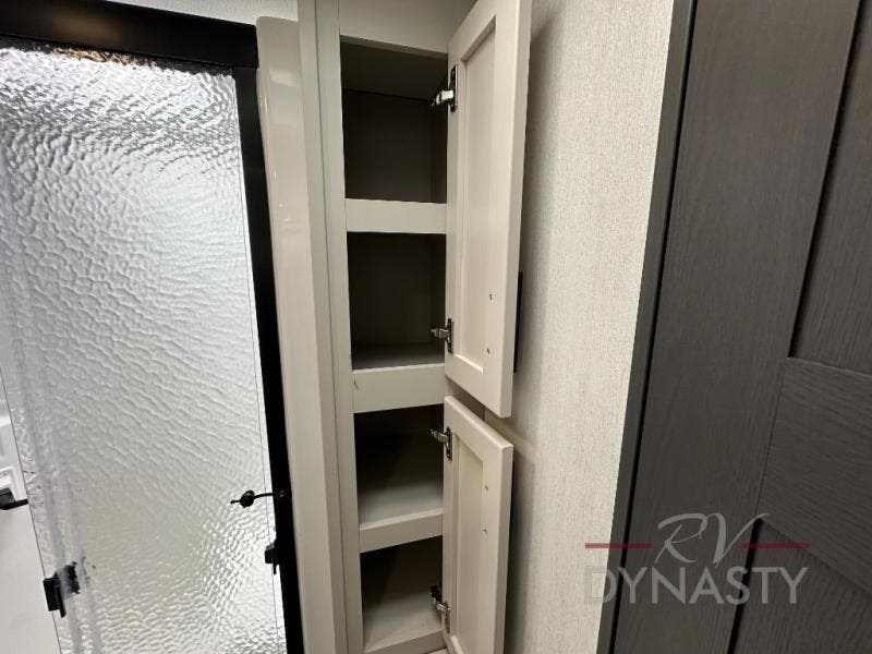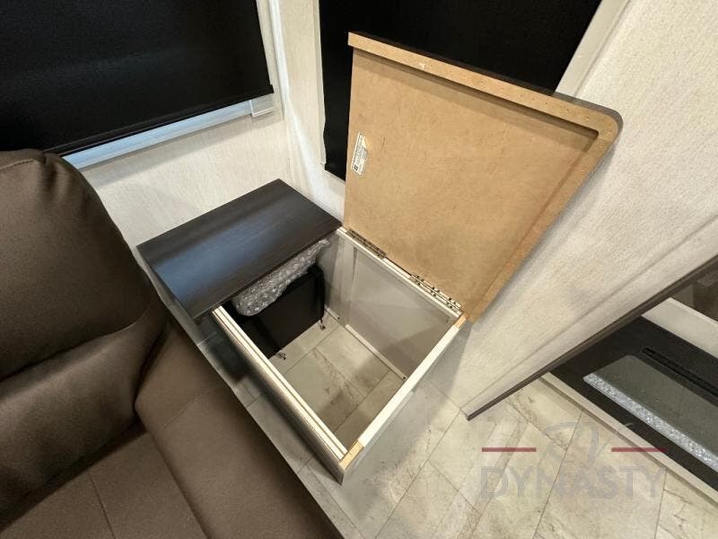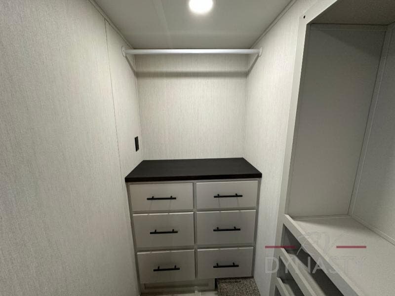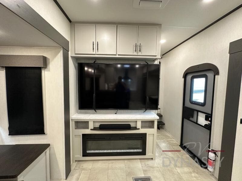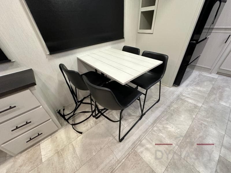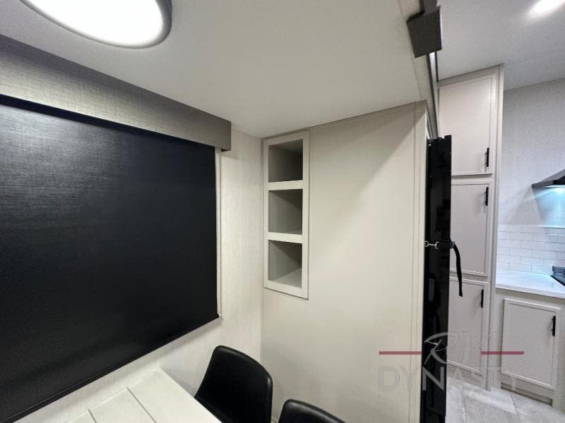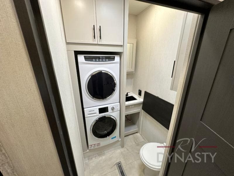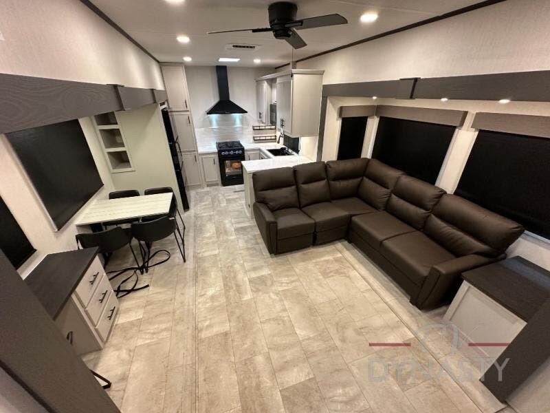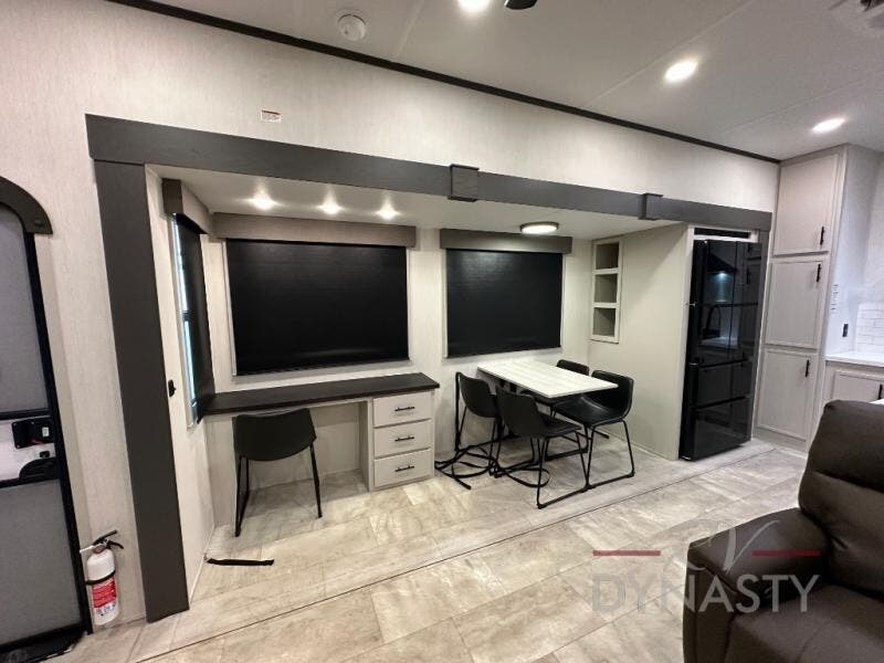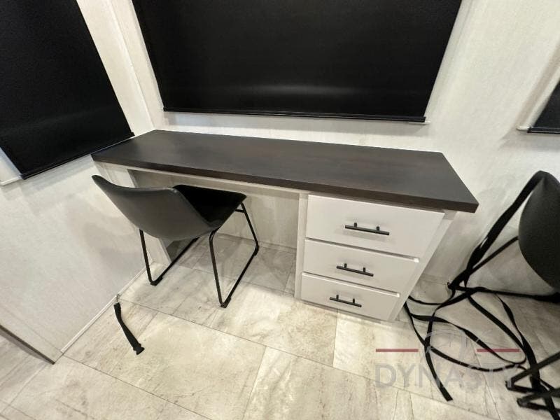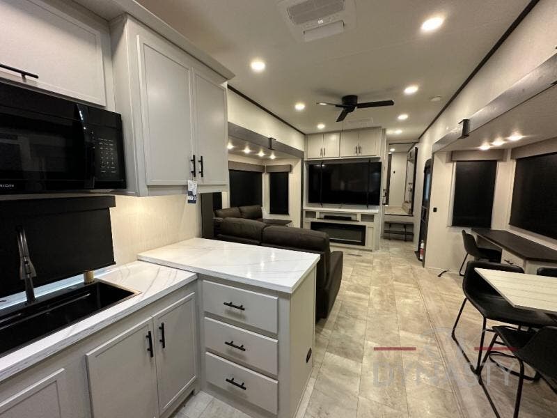 It will be so easy to enjoy extended stays or weekend trips in this spacious fifth wheel. You will love waking up in your private master bedroom that includes a king bed slide, bedroom wardrobe, and 40" TV. The front full bath includes dual bath sinks for added convenience and a large walk-in closet with clothes bars. If you have any guests stay over, they can sleep on the L-shaped easy glide sofa with a theater seat on one end. There is also a free-standing dinette with four chairs and a desk with a chair if you need to get some work done. The chef of your group will love the rear kitchen with a u-shaped counter, two kitchen pantries, and a 16 cu. ft. refrigerator for food storage. This model also includes a mid-coach half bath with washer and dryer prep if you choose to add those appliances!