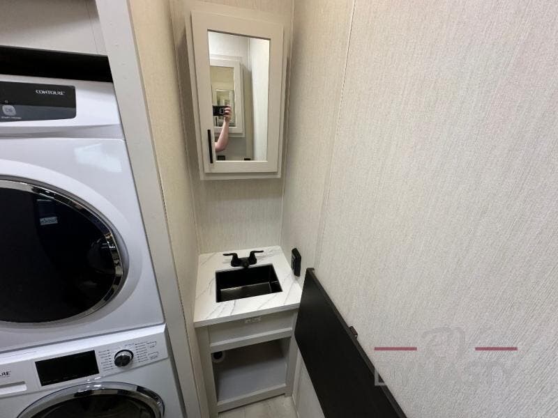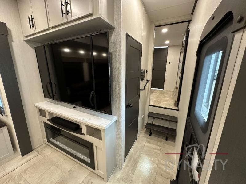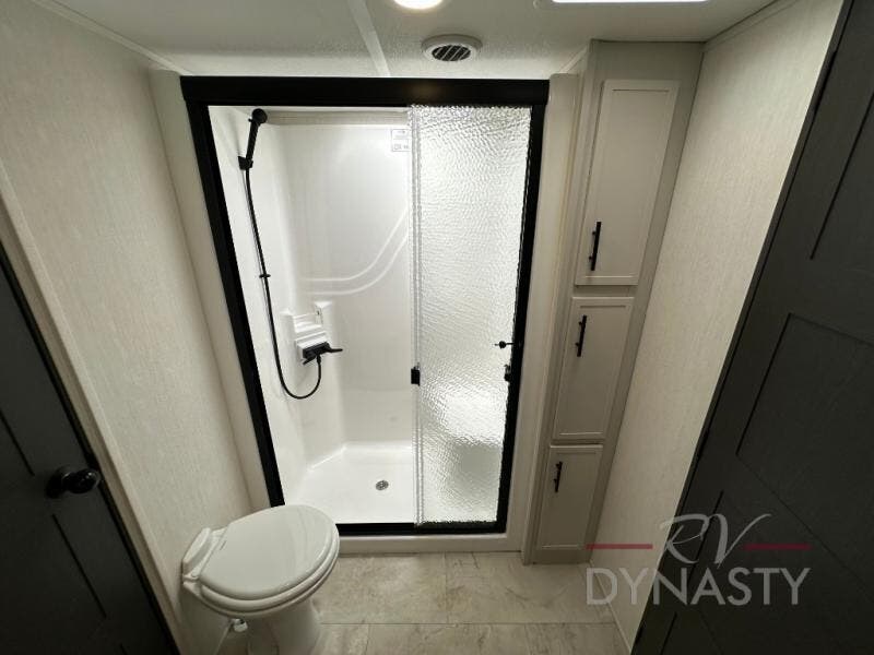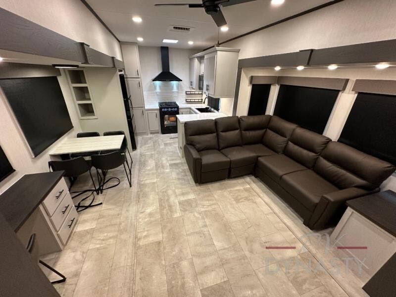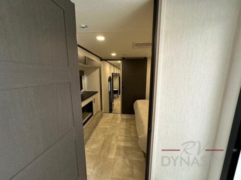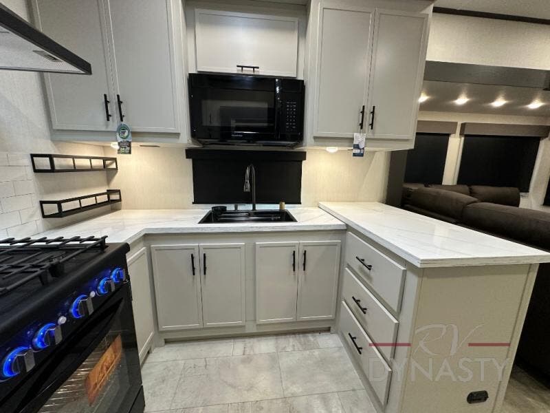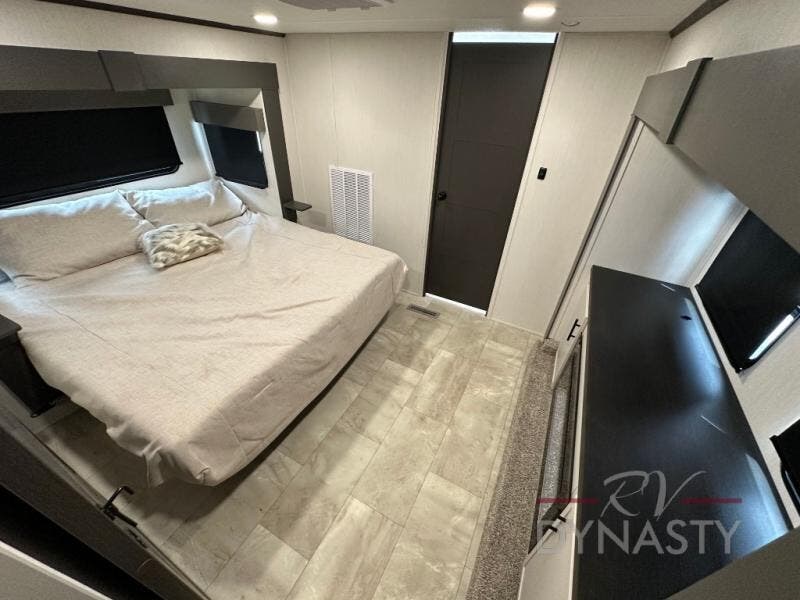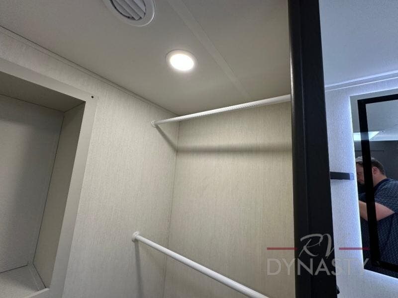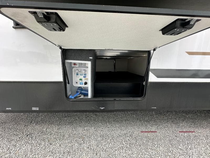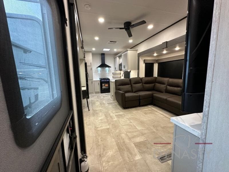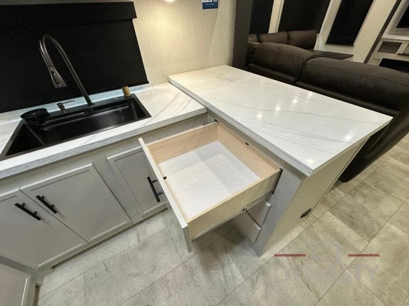 It will be so easy to enjoy extended stays or weekend trips in this spacious fifth wheel. You will love waking up in your private master bedroom that includes a king bed slide, bedroom wardrobe, and 40" TV. The front full bath includes dual bath sinks for added convenience and a large walk-in closet with clothes bars. If you have any guests stay over, they can sleep on the L-shaped easy glide sofa with a theater seat on one end. There is also a free-standing dinette with four chairs and a desk with a chair if you need to get some work done. The chef of your group will love the rear kitchen with a u-shaped counter, two kitchen pantries, and a 16 cu. ft. refrigerator for food storage. This model also includes a mid-coach half bath with washer and dryer prep if you choose to add those appliances!