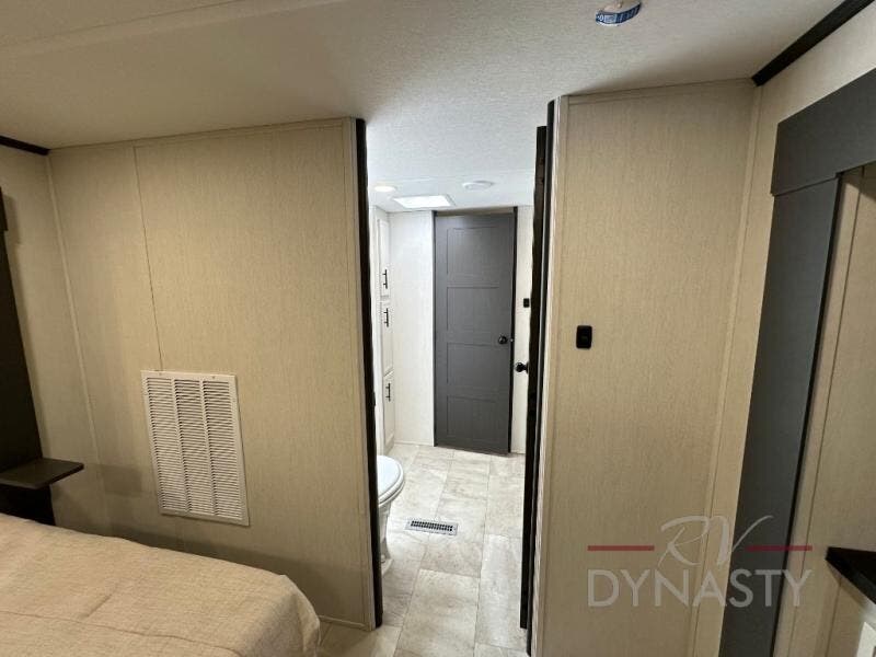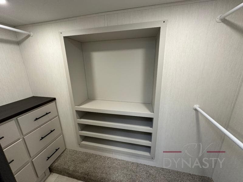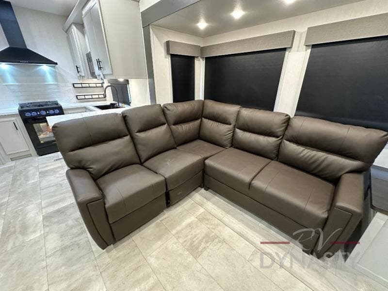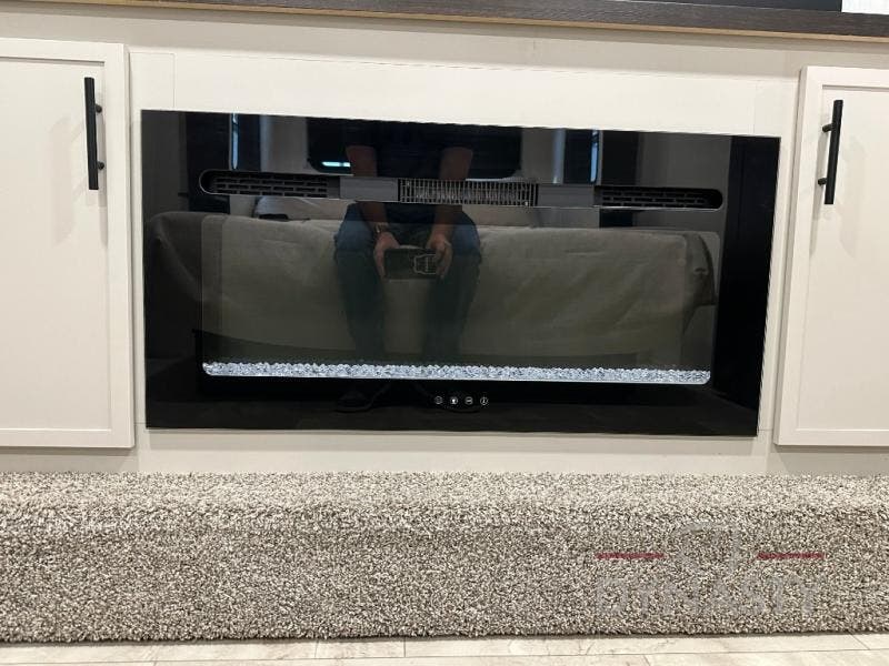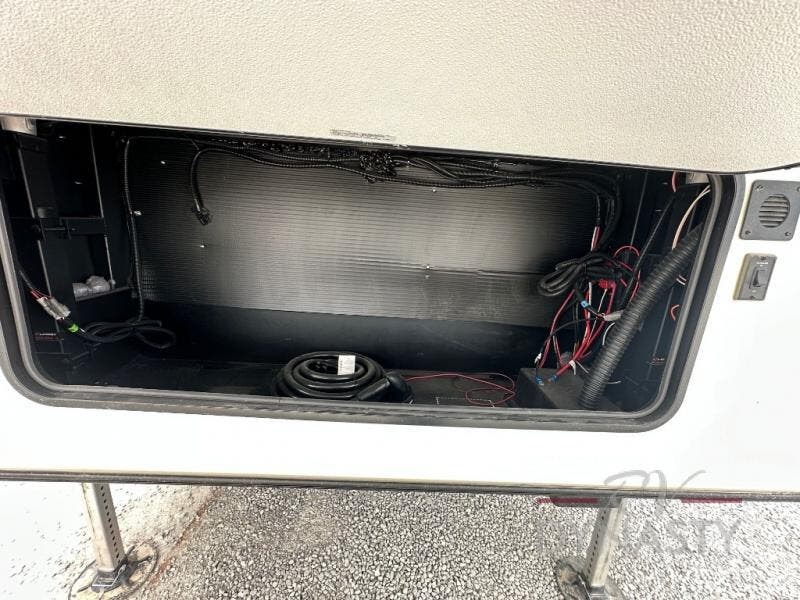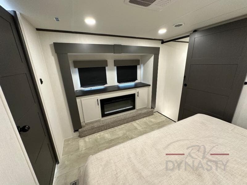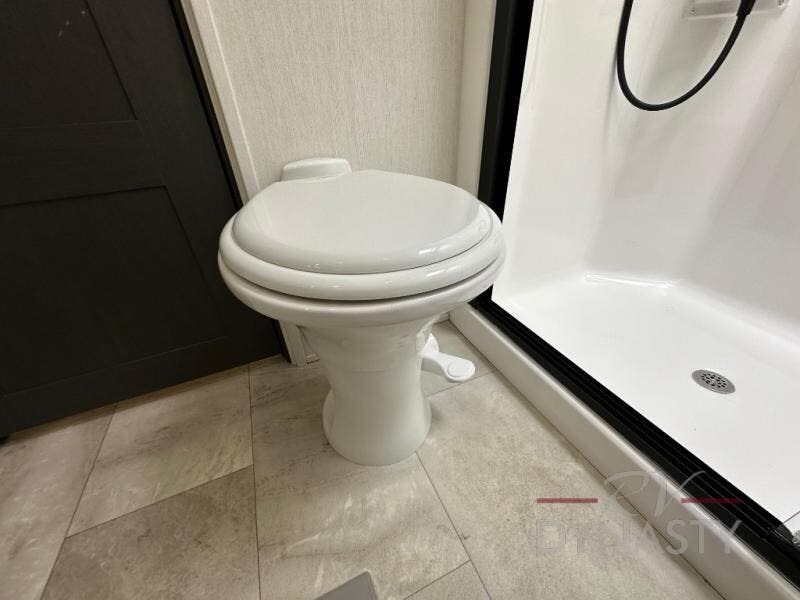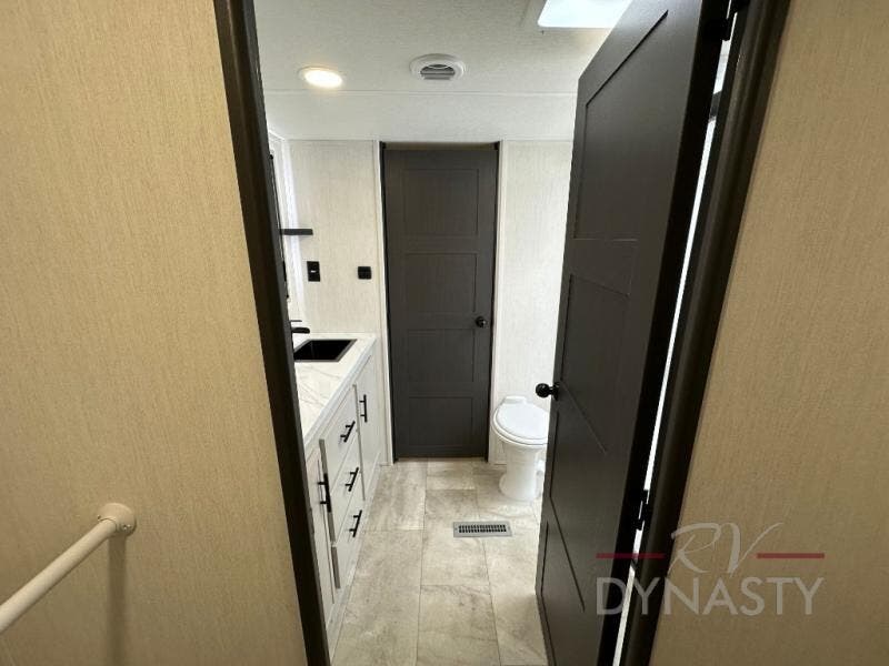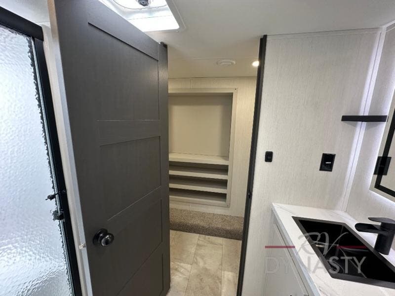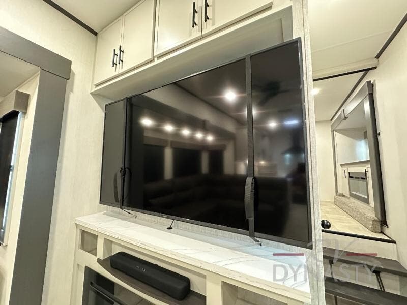 It will be so easy to enjoy extended stays or weekend trips in this spacious fifth wheel. You will love waking up in your private master bedroom that includes a king bed slide, bedroom wardrobe, and 40" TV. The front full bath includes dual bath sinks for added convenience and a large walk-in closet with clothes bars. If you have any guests stay over, they can sleep on the L-shaped easy glide sofa with a theater seat on one end. There is also a free-standing dinette with four chairs and a desk with a chair if you need to get some work done. The chef of your group will love the rear kitchen with a u-shaped counter, two kitchen pantries, and a 16 cu. ft. refrigerator for food storage. This model also includes a mid-coach half bath with washer and dryer prep if you choose to add those appliances!