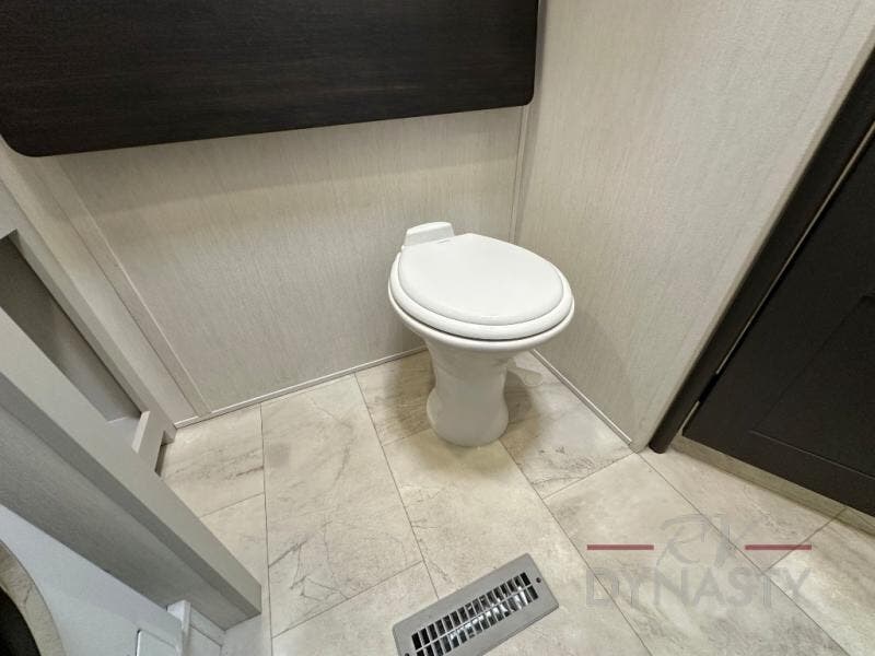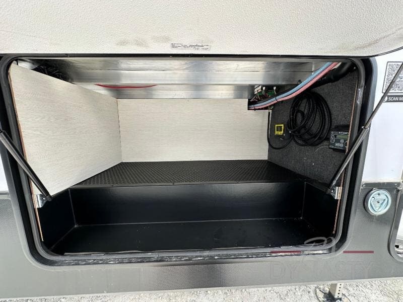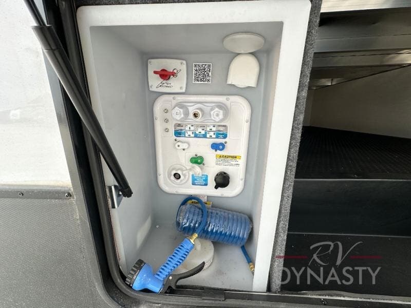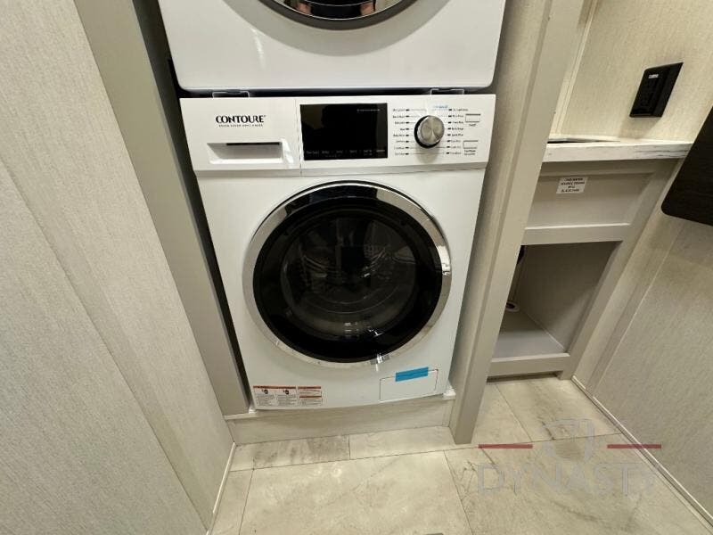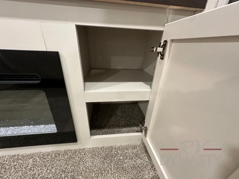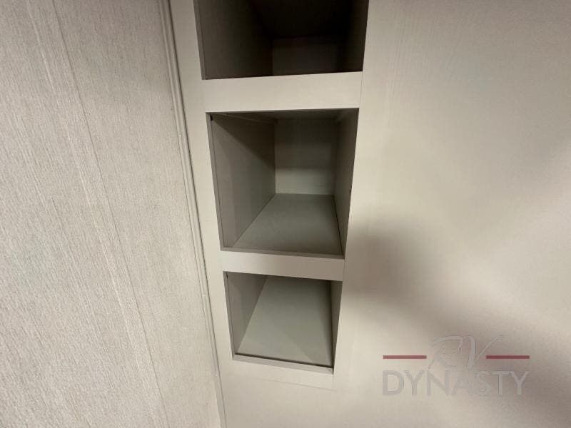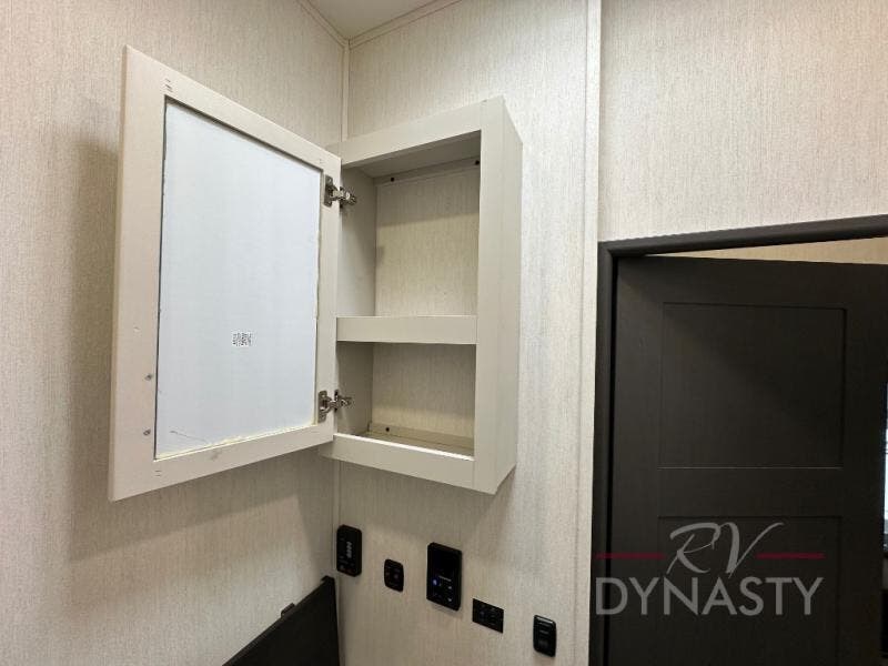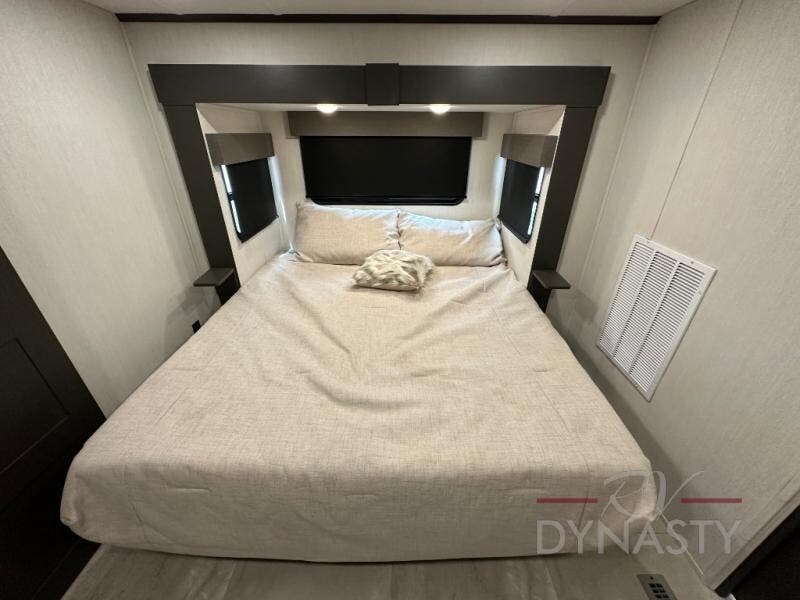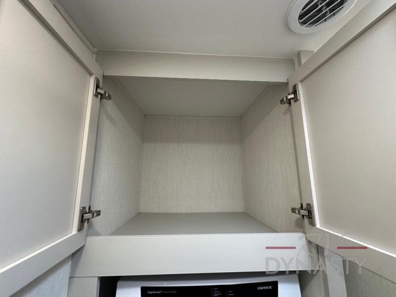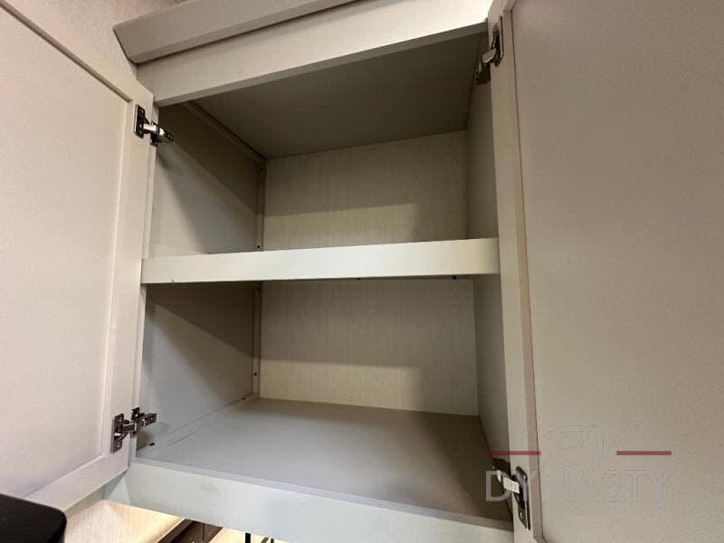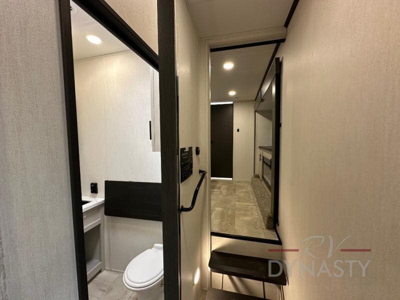 It will be so easy to enjoy extended stays or weekend trips in this spacious fifth wheel. You will love waking up in your private master bedroom that includes a king bed slide, bedroom wardrobe, and 40" TV. The front full bath includes dual bath sinks for added convenience and a large walk-in closet with clothes bars. If you have any guests stay over, they can sleep on the L-shaped easy glide sofa with a theater seat on one end. There is also a free-standing dinette with four chairs and a desk with a chair if you need to get some work done. The chef of your group will love the rear kitchen with a u-shaped counter, two kitchen pantries, and a 16 cu. ft. refrigerator for food storage. This model also includes a mid-coach half bath with washer and dryer prep if you choose to add those appliances!