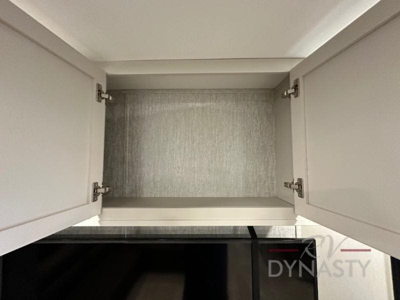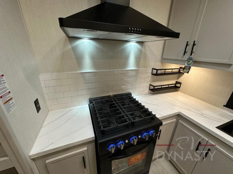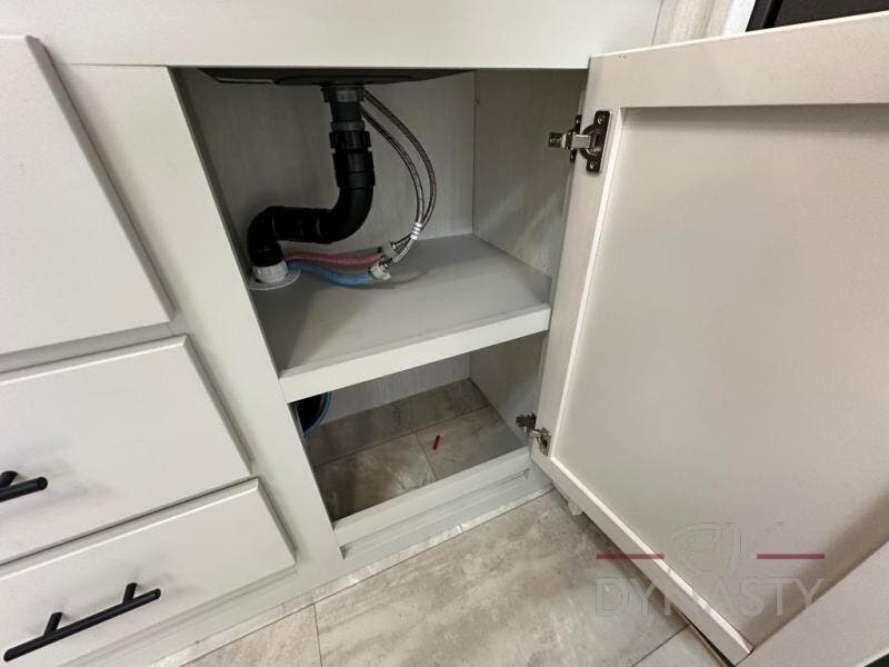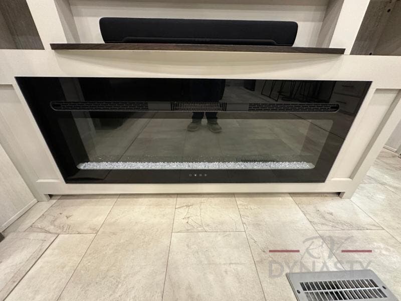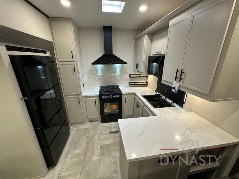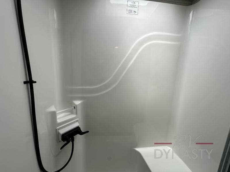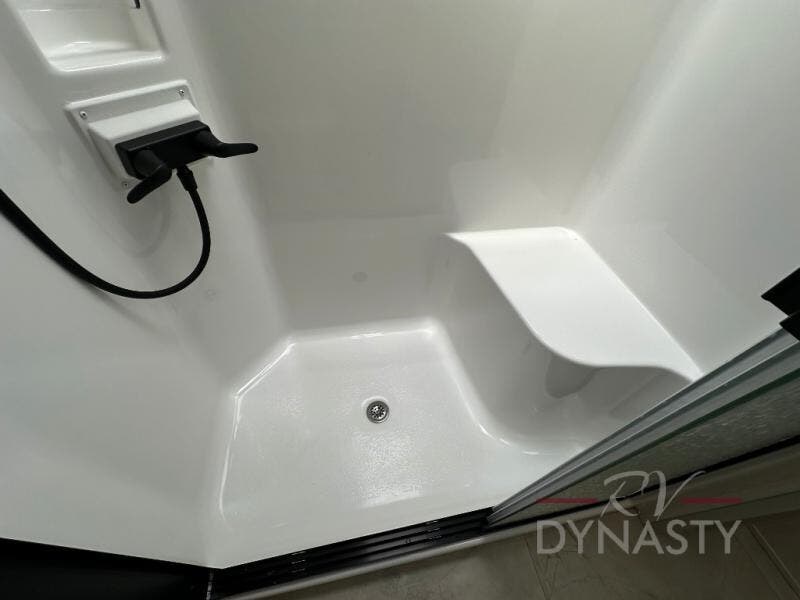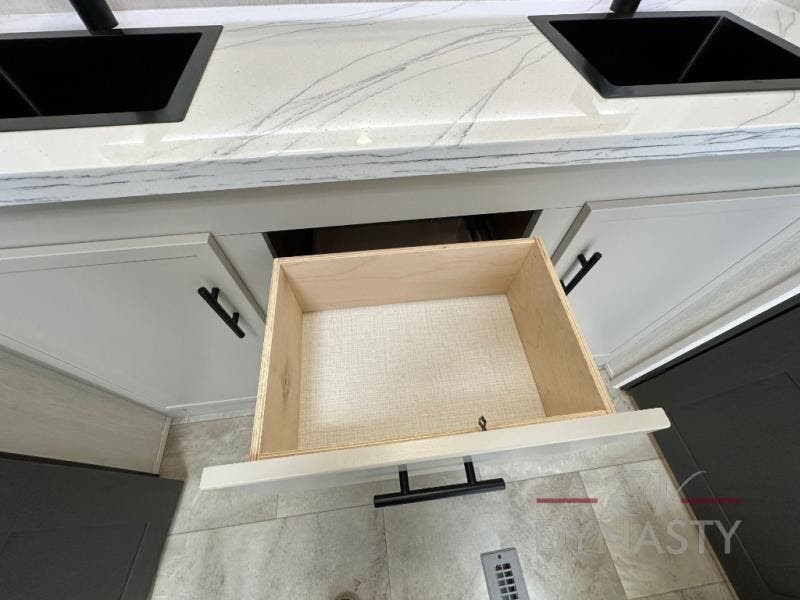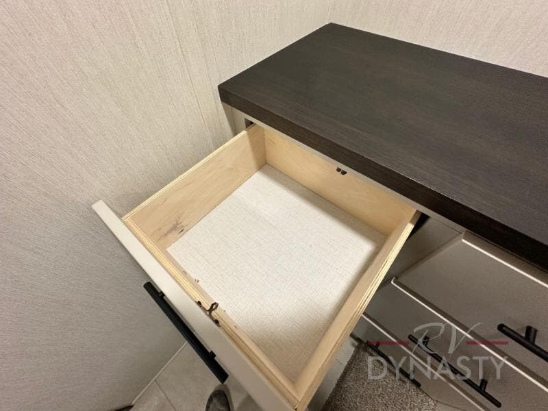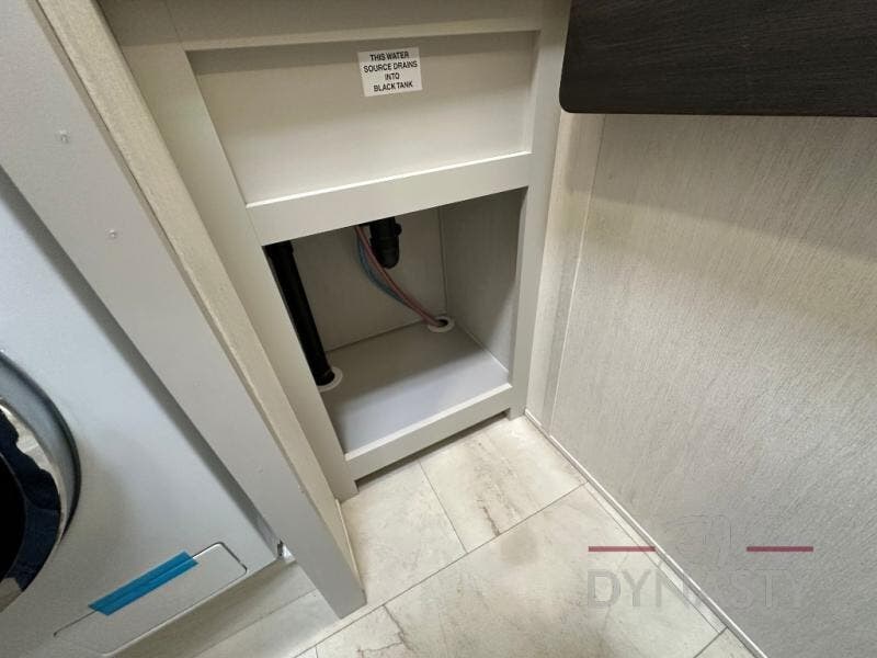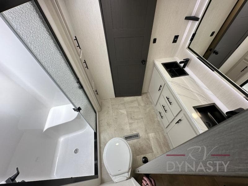 It will be so easy to enjoy extended stays or weekend trips in this spacious fifth wheel. You will love waking up in your private master bedroom that includes a king bed slide, bedroom wardrobe, and 40" TV. The front full bath includes dual bath sinks for added convenience and a large walk-in closet with clothes bars. If you have any guests stay over, they can sleep on the L-shaped easy glide sofa with a theater seat on one end. There is also a free-standing dinette with four chairs and a desk with a chair if you need to get some work done. The chef of your group will love the rear kitchen with a u-shaped counter, two kitchen pantries, and a 16 cu. ft. refrigerator for food storage. This model also includes a mid-coach half bath with washer and dryer prep if you choose to add those appliances!