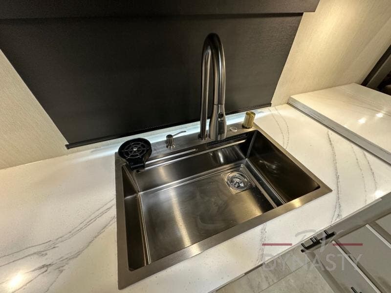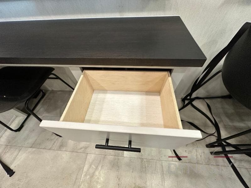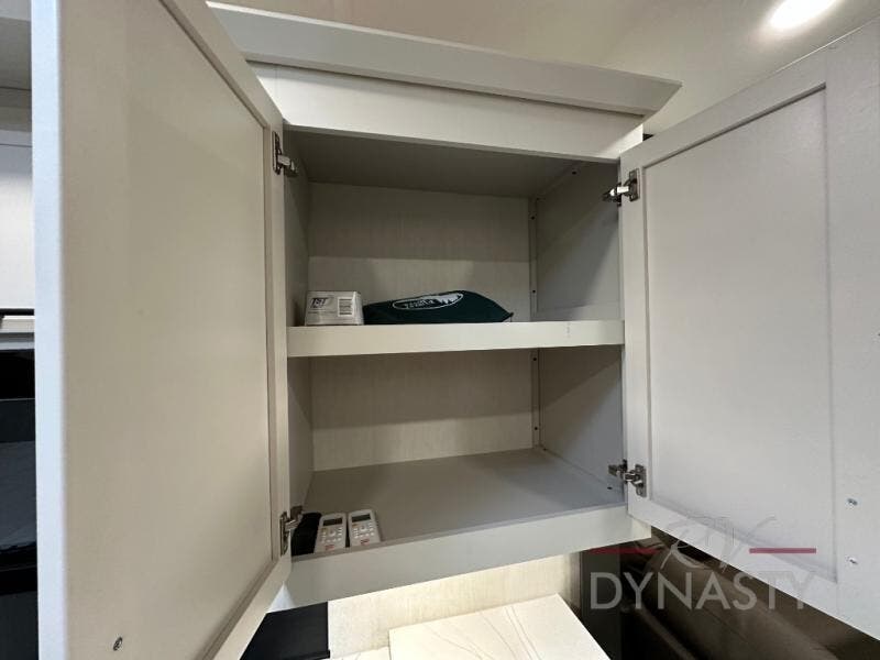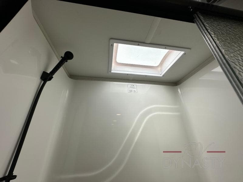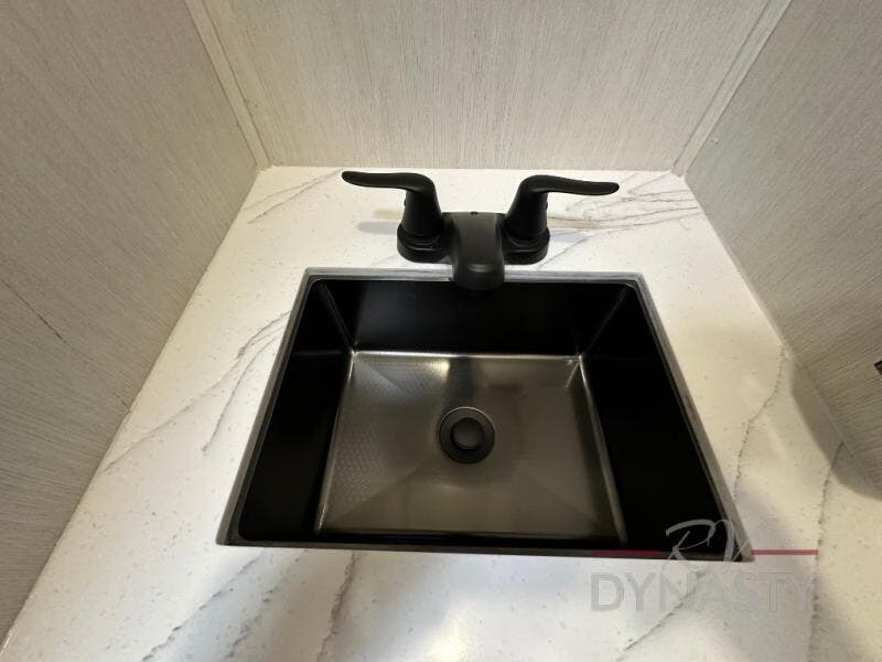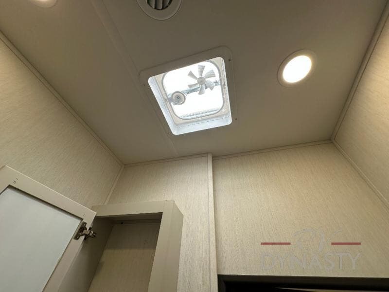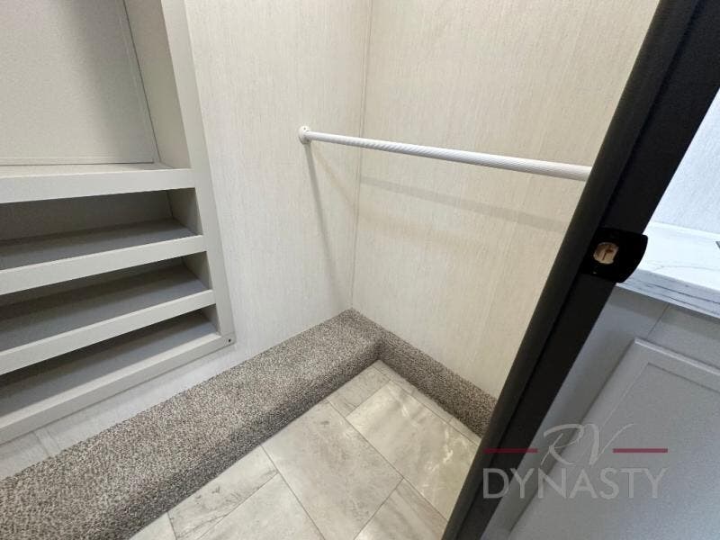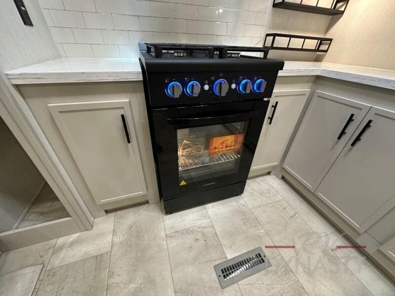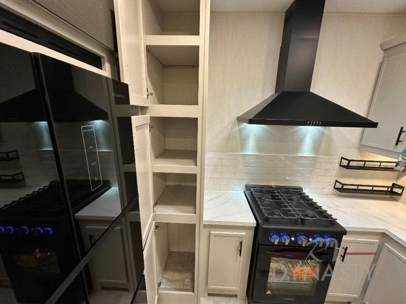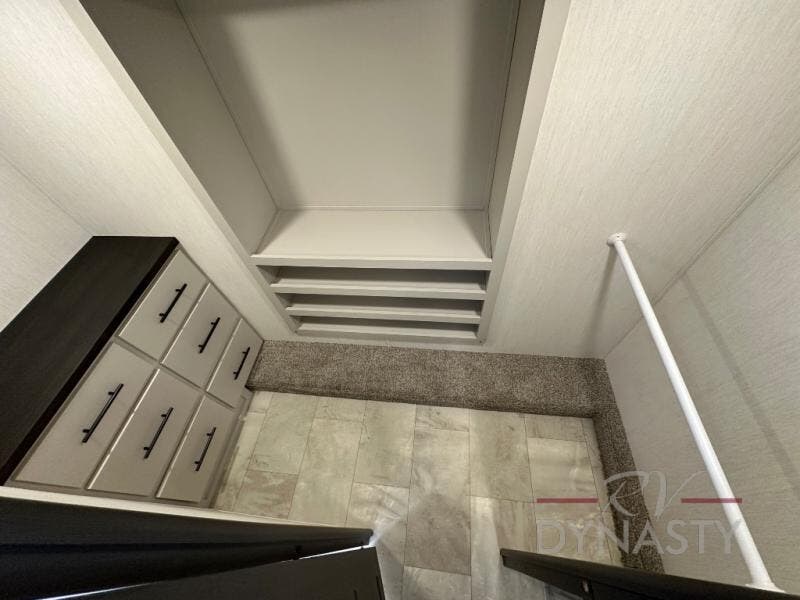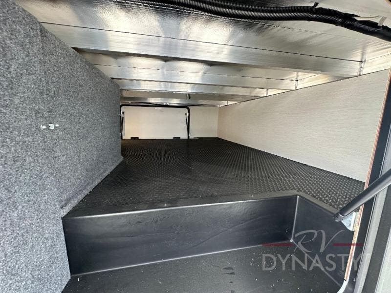 It will be so easy to enjoy extended stays or weekend trips in this spacious fifth wheel. You will love waking up in your private master bedroom that includes a king bed slide, bedroom wardrobe, and 40" TV. The front full bath includes dual bath sinks for added convenience and a large walk-in closet with clothes bars. If you have any guests stay over, they can sleep on the L-shaped easy glide sofa with a theater seat on one end. There is also a free-standing dinette with four chairs and a desk with a chair if you need to get some work done. The chef of your group will love the rear kitchen with a u-shaped counter, two kitchen pantries, and a 16 cu. ft. refrigerator for food storage. This model also includes a mid-coach half bath with washer and dryer prep if you choose to add those appliances!