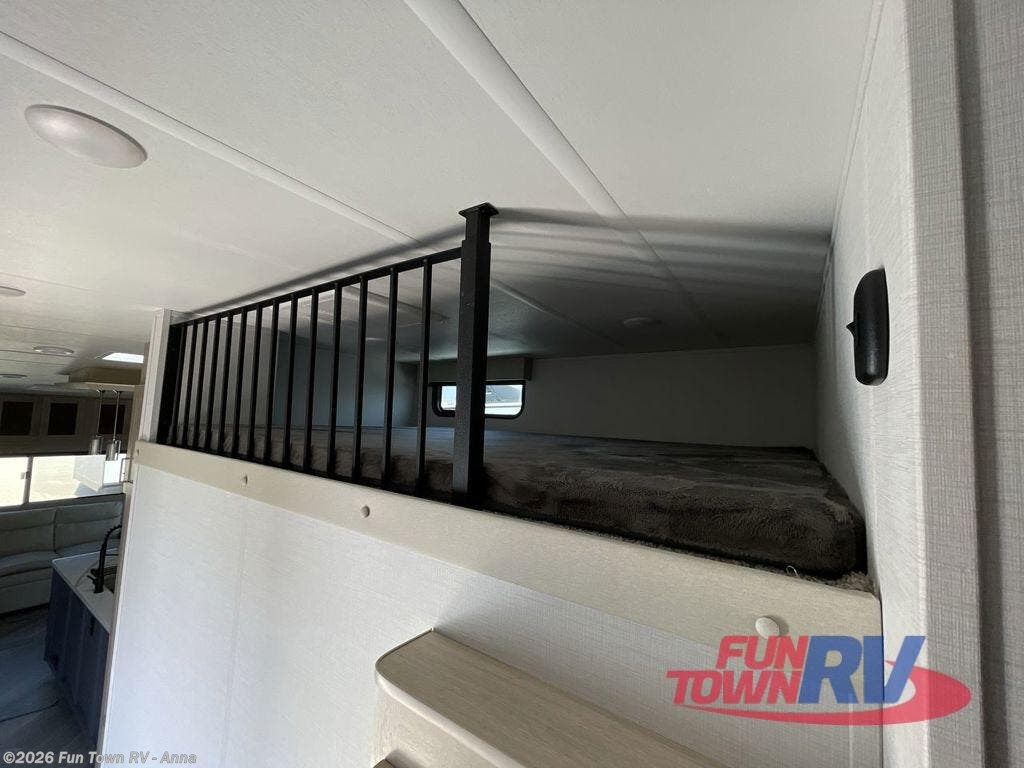 This fifth wheel has plenty of room for the whole family or friends to join in on the fun! Your guests will have the mid-bunk room all to themselves with a jackknife sofa and a flip-up bunk above, a dresser for their clothes, and a convenient half bath. The loft with a 60" x 80" bunk mat is sure to be a fun addition for the kids, and you and your spouse will enjoy the front private bedroom with a king bed slide for your comfort. Everyone can meet in the rear living area that includes an EZ glide couch, 65" theater seating, and a legless dinette for game night. The chef of the family will have plenty of counter space for prepping meals on the island peninsula, and the four burner cooktop can heat up any casseroles they have prepared. If the weather is nice, you may just want to head outdoors to cook dinner on the outside grill, and the two electric awnings with LED lights will provide protection from the sun rays!