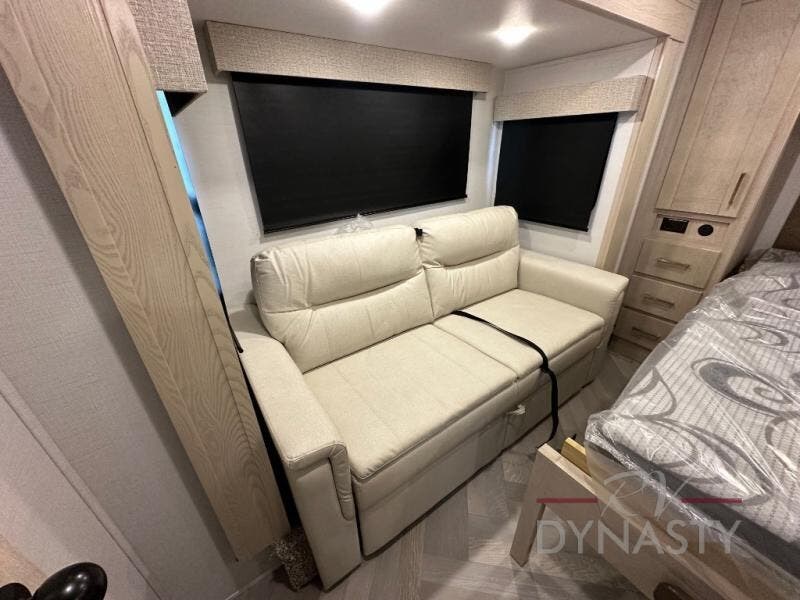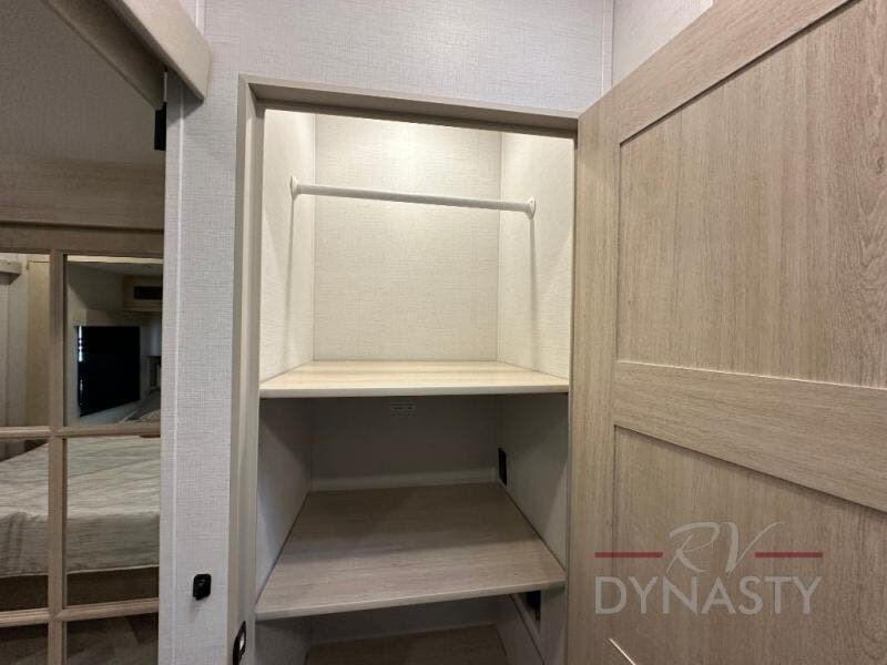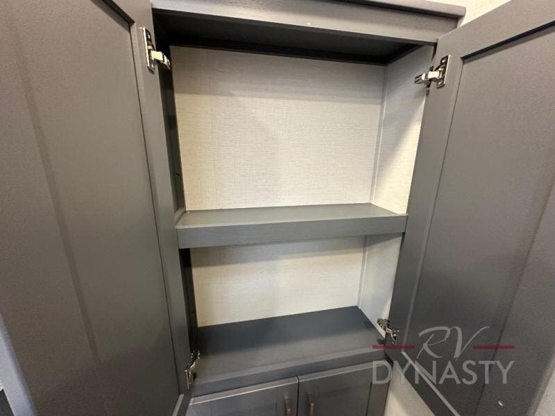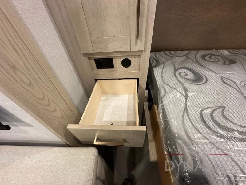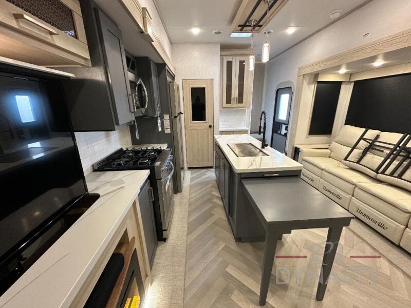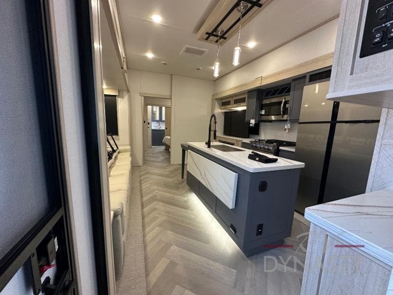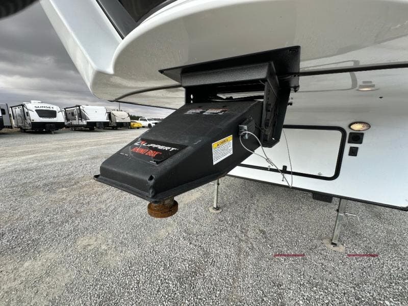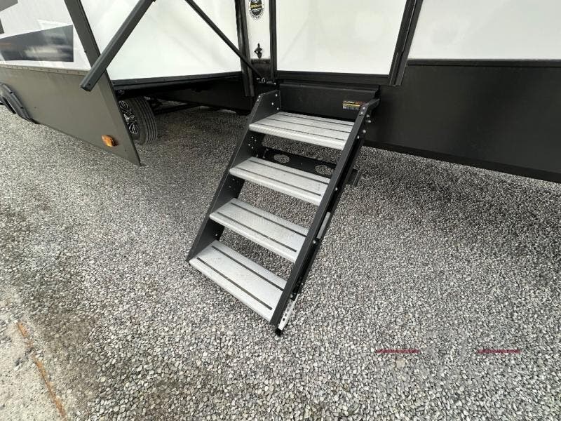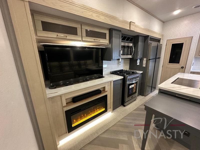 This fifth wheel is sure to wow you! You can easily invite your close neighbor friends along since there is a front den/bedroom that includes dual opposing slides, a Murphy bed/desk, a tri-fold sofa and a wardrobe, plus a full bath! You'll have the master suite towards the back all to yourselves, and here you'll find a king bed slide out, a bedroom fireplace, and a full rear bath, complete with dual bath sinks. There is even a linen closet with washer and dryer prep if you want the option to go full-time! In the morning, everyone can meet in the combined kitchen and living area as the chef whips up breakfast on the four burner cooktop. There is a gourmet island with a flip-up counter and a hidden dinette to provide everyone space to gather around. And you'll love the large sofa with pop-up chargers across from the hidden Smart TV and fireplace. Don't let this fifth wheel slip away!