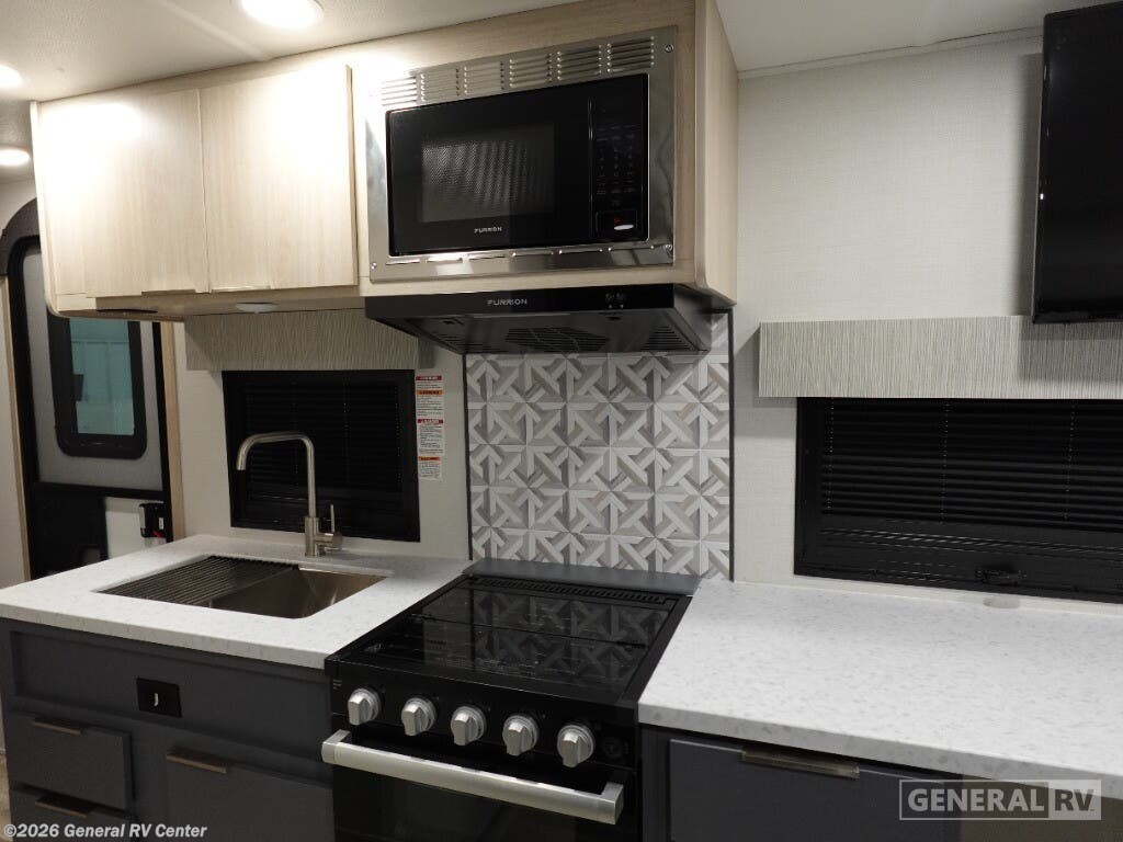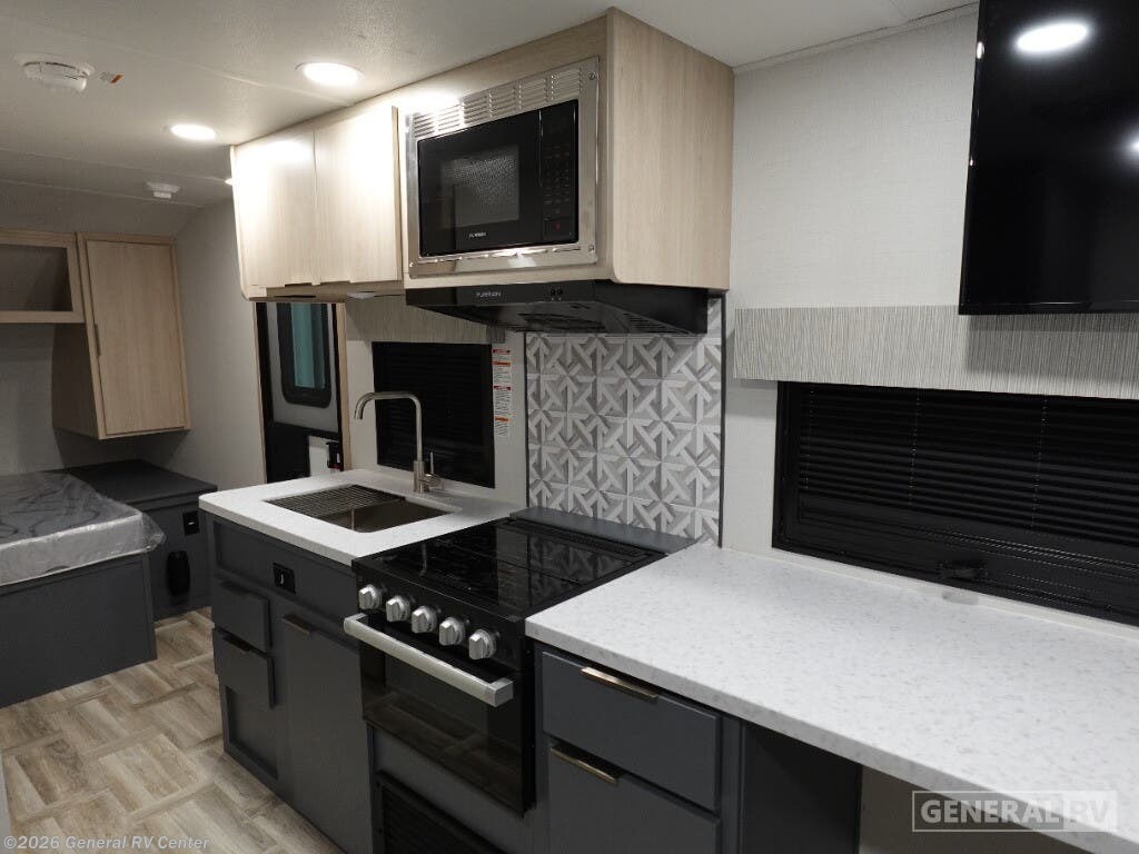 Welcome to the 2025 Prime Time RV Tracer 170RS, where compact meets comfort in a beautifully designed travel trailer. With a total length of 23 feet, this RV is perfect for those seeking adventure without compromising on the comforts of home. The well-appointed center kitchen features a three-burner cooktop and a full-size electric refrigerator, making meal preparation a breeze. The rear living area invites relaxation with theater seating perfectly positioned to enjoy the entertainment center. Natural light floods the space, complemented by the 15 ft. powered retractable awning outside, creating an ideal spot for outdoor lounging. Retreat to the cozy sleeping area that houses a luxurious queen bed, ensuring restful nights under the stars. The center bath provides convenience and privacy, equipped with a shower curtain for a touch of home-like comfort. With ample storage options, including overhead cabinets and pass-thru storage, the Tracer 170RS ensures you have everything you need for your journey. Its lightweight design and single axle make towing effortless, while the robust D rated radial tires promise a smooth ride. Discover the perfect balance of style and functionality with this exceptional travel trailer. For more details or to see it in person, visit your nearest General RV Dealership.